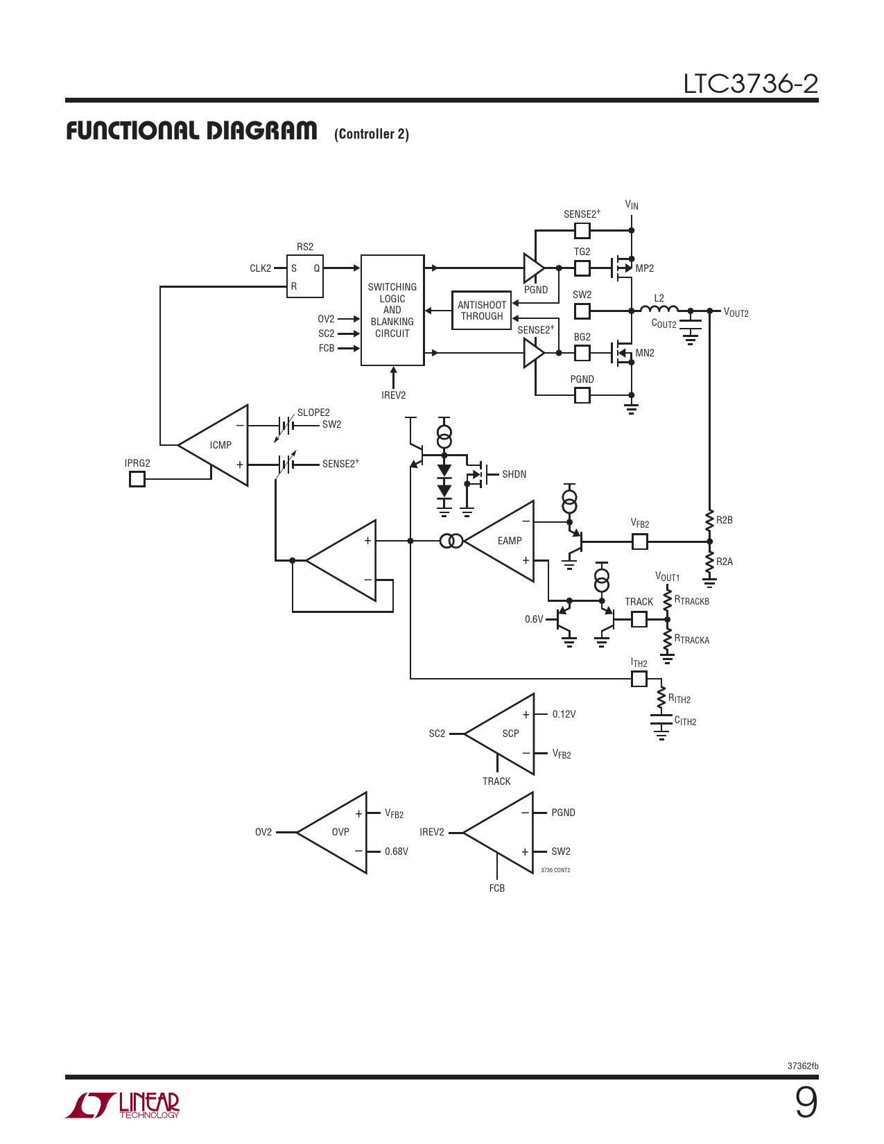 VIN SENSE2+ RS2 TG2 CLK2 S Q MP2 R SWITCHING PGND SW2 LOGIC L2 ANTISHOOT AND V OV2 THROUGH OUT2 BLANKING COUT2 SC2 SENSE2+ CIRCUIT BG2 FCB MN2 PGND IREV2 SLOPE2 – SW2 ICMP + IPRG2 SENSE2+ SHDN – R2B VFB2 + EAMP + R2A VOUT1 – R TRACK TRACKB 0.6V RTRACKA ITH2 RITH2 + 0.12V CITH2 SC2 SCP – VFB2 TRACK + VFB2 – PGND OV2 OVP IREV2 – 0.68V + SW2 3736 CONT2 FCB 37362fb 9