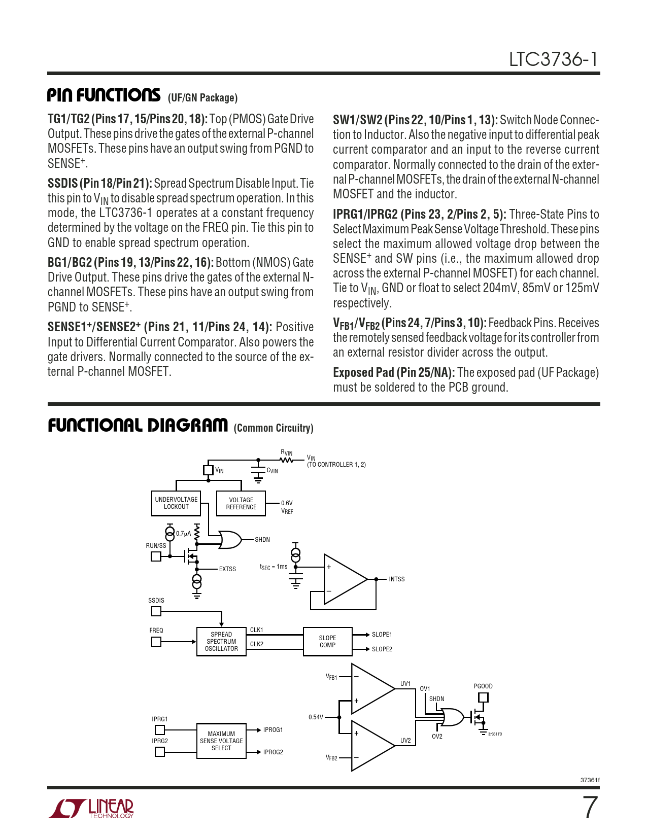 RVIN VIN (TO CONTROLLER 1, 2) VIN CVIN UNDERVOLTAGE VOLTAGE 0.6V LOCKOUT REFERENCE VREF 0.7µA SHDN RUN/SS tSEC = 1ms + EXTSS INTSS – SSDIS FREQ CLK1 SPREAD SLOPE1 SLOPE SPECTRUM CLK2 COMP OSCILLATOR SLOPE2 – VFB1 UV1 PGOOD OV1 + SHDN 0.54V IPRG1 VOLTAGE IPROG1 MAXIMUM + CONTROLLED OV2 37361 FD IPRG2 SENSE VOLTAGE UV2 OSCILLATOR SELECT IPROG2 VFB2 – 37361f 7