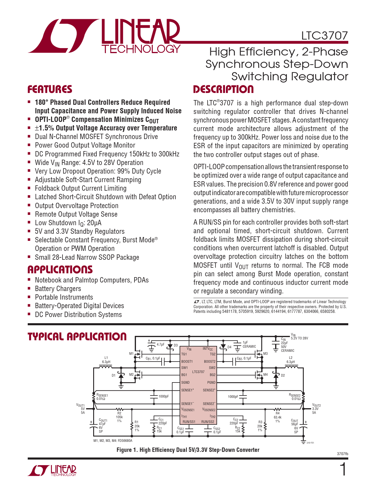 LTC3707 High Effi ciency, 2-Phase Synchronous Step-Down Switching Regulator FEATURESDESCRIPTION ■ 180° Phased Dual Controllers Reduce Required The LTC®3707 is a high performance dual step-down Input Capacitance and Power Supply Induced Noise switching regulator controller that drives N-channel ■ OPTI-LOOP ® Compensation Minimizes COUT synchronous power MOSFET stages. A constant frequency ■ ± 1.5% Output Voltage Accuracy over Temperature current mode architecture allows adjustment of the ■ Dual N-Channel MOSFET Synchronous Drive frequency up to 300kHz. Power loss and noise due to the ■ Power Good Output Voltage Monitor ESR of the input capacitors are minimized by operating ■ DC Programmed Fixed Frequency 150kHz to 300kHz the two controller output stages out of phase. ■ Wide VIN Range: 4.5V to 28V Operation OPTI-LOOP compensation allows the transient response to ■ Very Low Dropout Operation: 99% Duty Cycle be optimized over a wide range of output capacitance and ■ Adjustable Soft-Start Current Ramping ESR values. The precision 0.8V reference and power good ■ Foldback Output Current Limiting output indicator are compatible with future microprocessor ■ Latched Short-Circuit Shutdown with Defeat Option generations, and a wide 3.5V to 30V input supply range ■ Output Overvoltage Protection encompasses all battery chemistries. ■ Remote Output Voltage Sense ■ Low Shutdown I A RUN/SS pin for each controller provides both soft-start Q: 20μA ■ 5V and 3.3V Standby Regulators and optional timed, short-circuit shutdown. Current ■ Selectable Constant Frequency, Burst Mode® foldback limits MOSFET dissipation during short-circuit Operation or PWM Operation conditions when overcurrent latchoff is disabled. Output ■ Small 28-Lead Narrow SSOP Package overvoltage protection circuitry latches on the bottom APPLICATIONS MOSFET until VOUT returns to normal. The FCB mode pin can select among Burst Mode operation, constant ■ Notebook and Palmtop Computers, PDAs frequency mode and continuous inductor current mode ■ Battery Chargers or regulate a secondary winding. ■ Portable Instruments L, LT, LTC, LTM, Burst Mode, and OPTI-LOOP are registered trademarks of Linear Technology ■ Battery-Operated Digital Devices Corporation. All other trademarks are the property of their respective owners. Protected by U.S. Patents including 5481178, 5705919, 5929620, 6144194, 6177787, 6304066, 6580258. ■ DC Power Distribution Systems TYPICAL APPLICATION VIN + C 5.2V TO 28V IN 1μF 4.7μF 22μF D3 D4 CERAMIC 50V VIN INTVCC CERAMIC M1 TG1 TG2 M3 L1 CB1, 0.1μF CB2, 0.1μF L2 6.3μH BOOST1 BOOST2 6.3μH SW1 SW2 LTC3707 D1 M2 BG1 BG2 M4 D2 SGND PGND SENSE1+ SENSE2+ RSENSE1 R 1000pF 1000pF SENSE2 0.01Ω 0.01Ω V SENSE1– SENSE2– OUT1 VOUT2 5V V 3.3V OSENSE1 VOSENSE2 5A R2 R4 5A 105k ITH1 ITH2 63.4k C C 1% C1 + COUT1 C2 1% COUT RUN/SS1 RUN/SS2 R3 + 47μF R1 220pF 220pF 56μF 6V 20k R 20k C1 R C C C2 SS1 SS2 6V SP 1% 15k 1% 15k 0.1μF 0.1μF SP M1, M2, M3, M4: FDS6680A 3707 F01 Figure 1. High Effi ciency Dual 5V/3.3V Step-Down Converter 3707fb 1