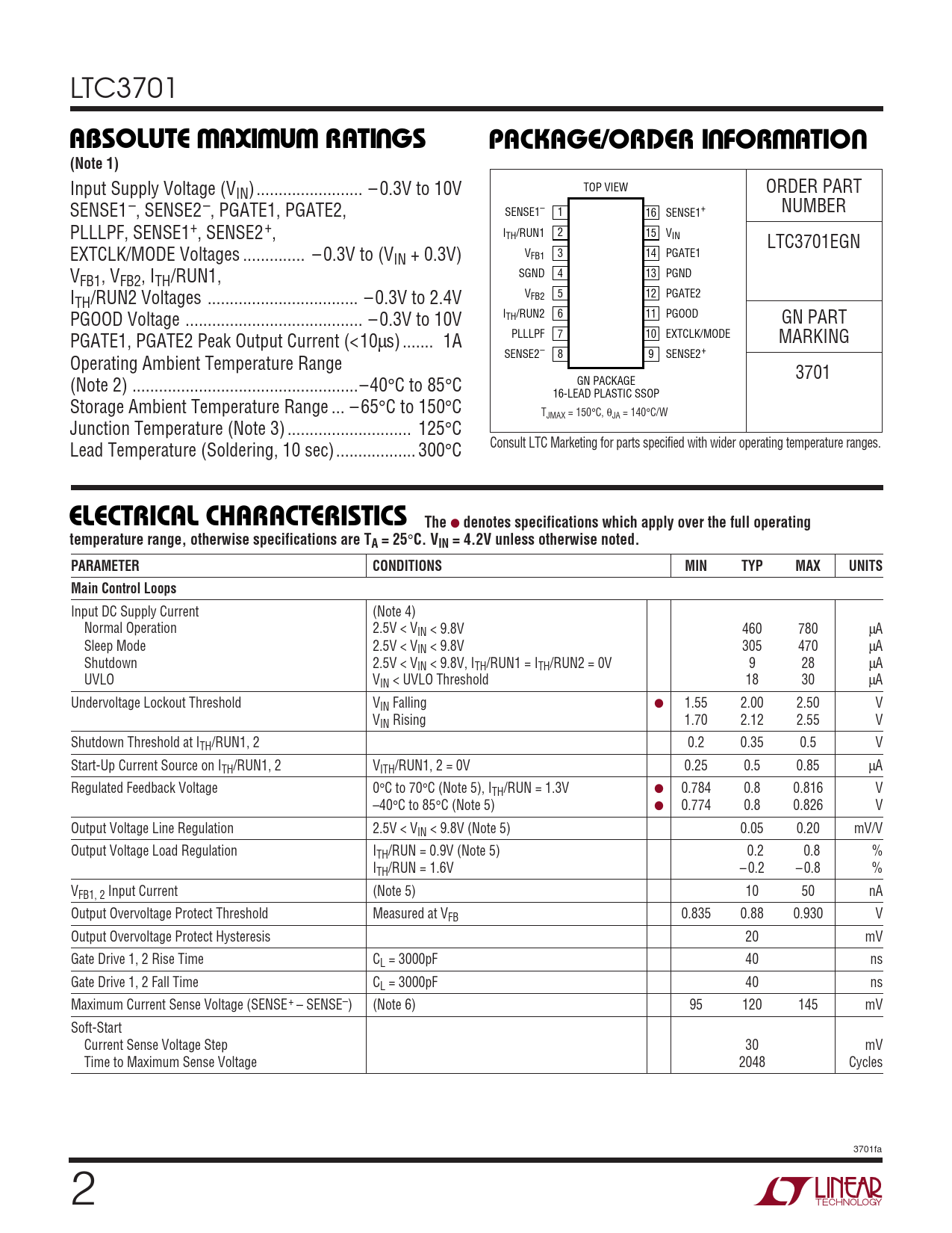 Input DC Supply Current (Note 4) Normal Operation 2.5V < VIN < 9.8V 460 780 µA Sleep Mode 2.5V < VIN < 9.8V 305 470 µA Shutdown 2.5V < VIN < 9.8V, ITH/RUN1 = ITH/RUN2 = 0V 9 28 µA UVLO VIN < UVLO Threshold 18 30 µA Undervoltage Lockout Threshold VIN Falling ● 1.55 2.00 2.50 V VIN Rising 1.70 2.12 2.55 V Shutdown Threshold at ITH/RUN1, 2 0.2 0.35 0.5 V Start-Up Current Source on ITH/RUN1, 2 VITH/RUN1, 2 = 0V 0.25 0.5 0.85 µA Regulated Feedback Voltage 0°C to 70°C (Note 5), ITH/RUN = 1.3V ● 0.784 0.8 0.816 V –40°C to 85°C (Note 5) ● 0.774 0.8 0.826 V Output Voltage Line Regulation 2.5V < VIN < 9.8V (Note 5) 0.05 0.20 mV/V Output Voltage Load Regulation ITH/RUN = 0.9V (Note 5) 0.2 0.8 % ITH/RUN = 1.6V – 0.2 – 0.8 % VFB1, 2 Input Current (Note 5) 10 50 nA Output Overvoltage Protect Threshold Measured at VFB 0.835 0.88 0.930 V Output Overvoltage Protect Hysteresis 20 mV Gate Drive 1, 2 Rise Time CL = 3000pF 40 ns Gate Drive 1, 2 Fall Time CL = 3000pF 40 ns Maximum Current Sense Voltage (SENSE+ – SENSE–) (Note 6) 95 120 145 mV Soft-Start Current Sense Voltage Step 30 mV Time to Maximum Sense Voltage 2048 Cycles 3701fa 2