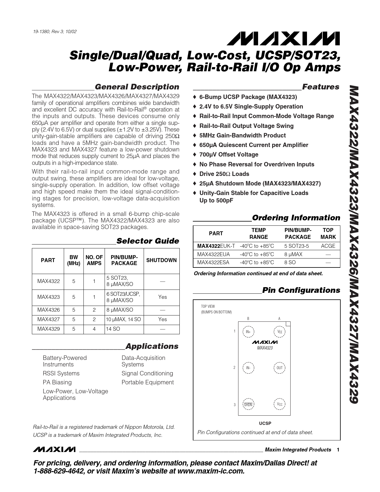 Rail-to-Rail is a registered trademark of Nippon Motorola, Ltd. Pin Configurations continued at end of data sheet. UCSP is a trademark of Maxim Integrated Products, Inc.