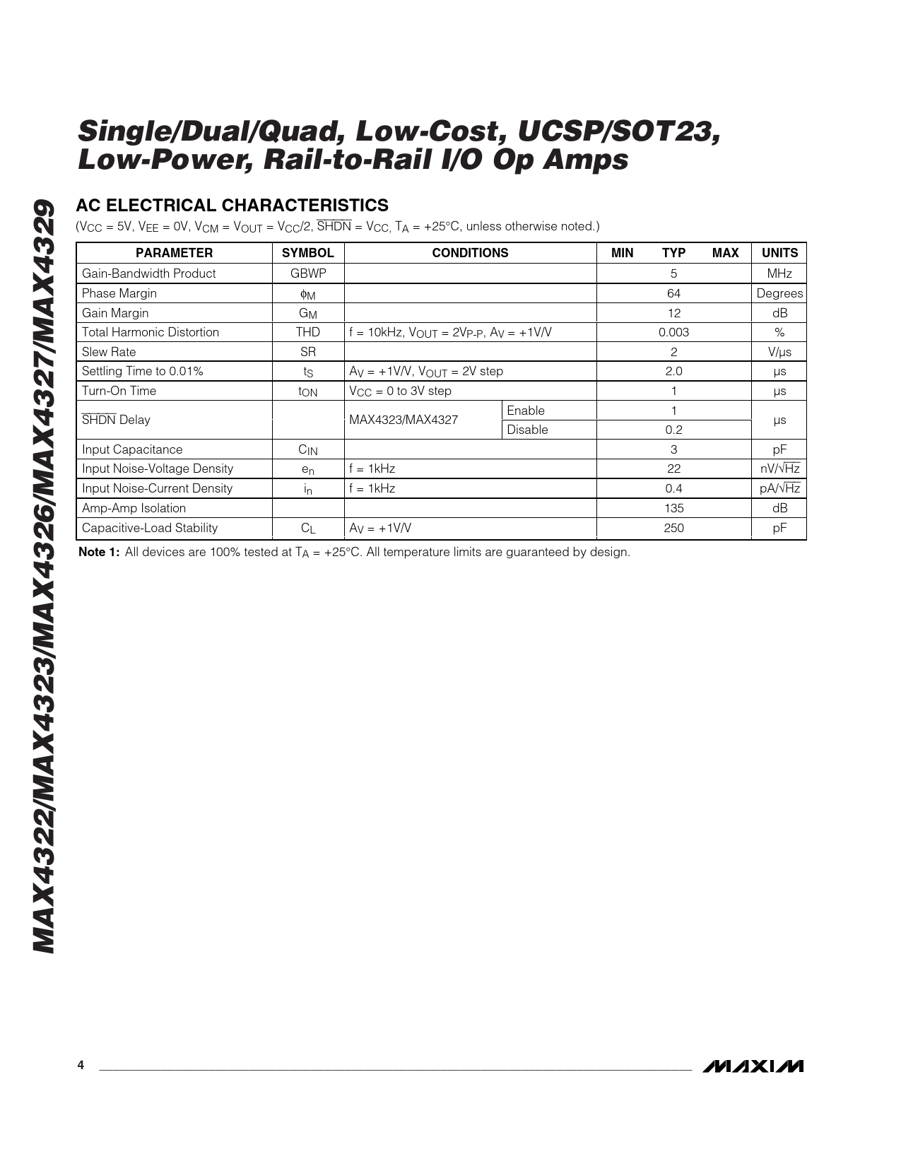 Single/Dual/Quad, Low-Cost, UCSP/SOT23, Low-Power, Rail-to-Rail I/O Op Amps AC ELECTRICAL CHARACTERISTICS PARAMETER SYMBOL