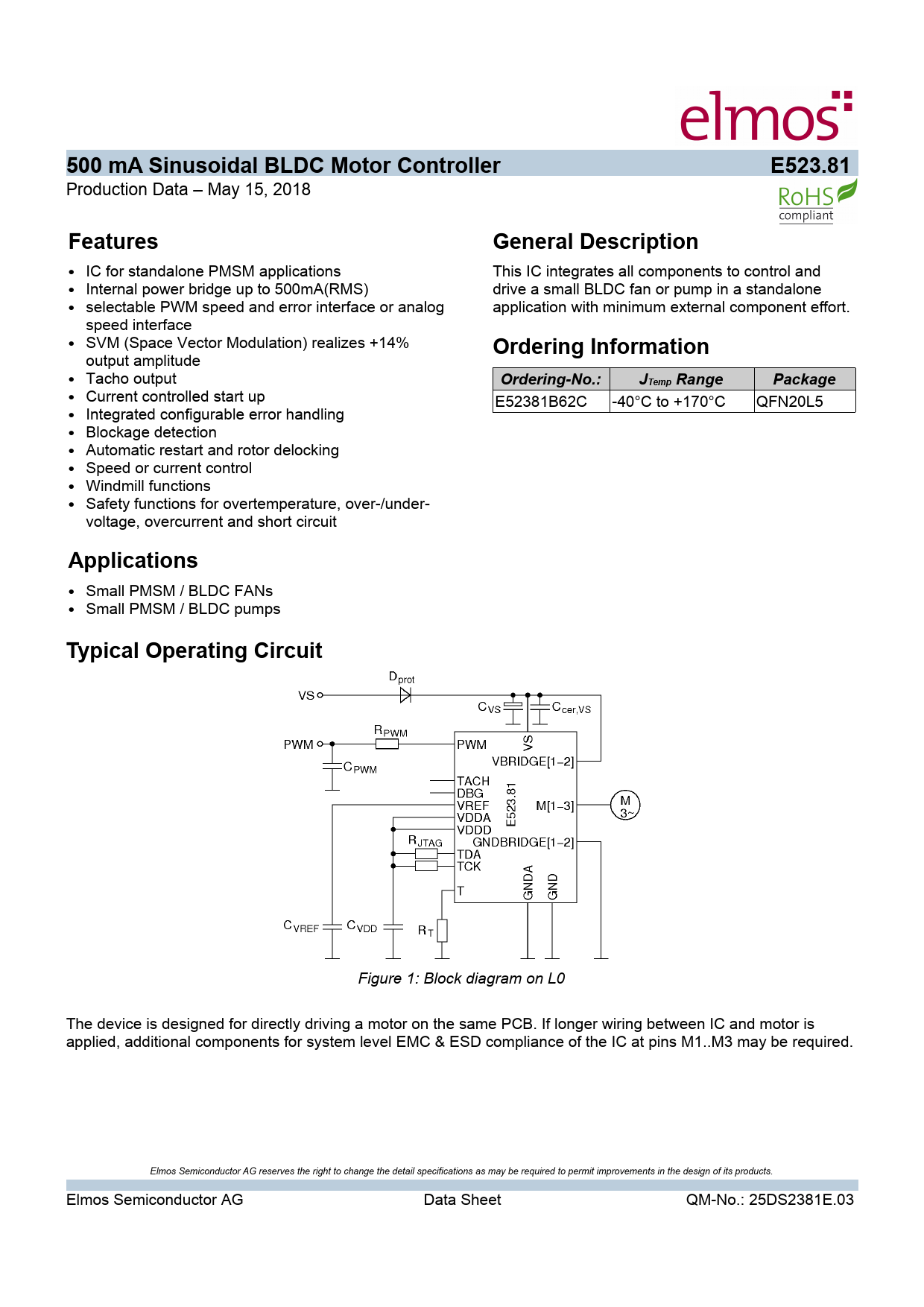 500 mA Sinusoidal BLDC Motor Controller. E523.81. Features. General Description. Ordering Information. Ordering-No.:. JTemp Range