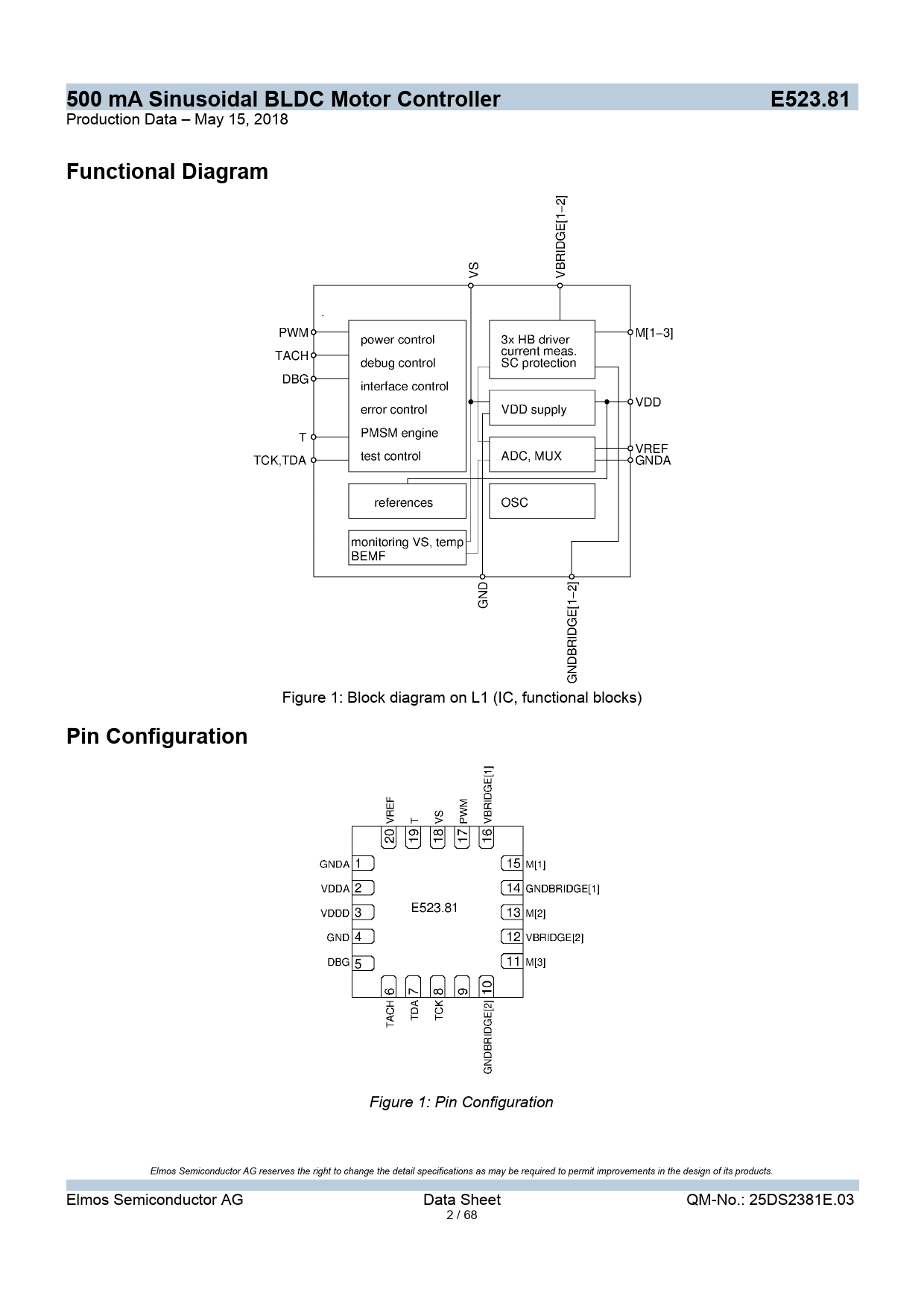 500 mA Sinusoidal BLDC Motor ControllerE523.81 Production Data – May 15, 2018 Functional Diagram Figure 1: Block diagram on L1 (IC, functional blocks) Pin Configuration Figure 1: Pin Configuration Elmos Semiconductor AG reserves the right to change the detail specifications as may be required to permit improvements in the design of its products. Elmos Semiconductor AG Data Sheet QM-No.: 25DS2381E.03 2 / 68 Document Outline Features Applications General Description Ordering Information Typical Operating Circuit Functional Diagram Pin Configuration Pin Description 1 Absolute Maximum Ratings 2 ESD 3 Recommended Operating Conditions 4 Electrical Characteristics 4.1 Clock System 4.2 I/O Peripherals 4.2.1 PWM Speed Input 4.2.2 Low Voltage Digital I/O Pins 4.3 PMSM Motion Control Unit 4.3.1 Speed Control 4.4 System Control 4.4.1 Error Detection and Behaviour 4.4.1.1 High Temperature Speed Reduction and Shut Down 4.4.1.2 Low Load Detection 4.5 Power Supply 4.5.1 VDD Supply 4.6 Integrated Motor Bridge 4.6.1 "Small" Bridge Parametrical Description 4.7 Monitoring and Measurements 4.7.1 Temperature Monitoring 4.7.2 VS Measurement 5 Functional Description 5.1 Overview 5.2 Block Diagrams 5.3 System Level Motor Interface and Error Interface 5.3.1 Motor Interface 5.3.1.1 Goal Speed Input 5.3.2 Error Interface 5.3.3 TACHO Output 5.4 Clock System 5.5 I/O Peripherals 5.5.1 PWM Speed Input 5.5.2 Three Level Test Pin 5.6 PMSM Motion Control Unit 5.6.1 PMSM Control Principle 5.6.1.1 Startup 5.6.1.2 Closed Loop Control 5.6.2 State Machine 5.6.2.1 State Off 5.6.2.2 State Forward Synchronisation 5.6.2.3 State Current Rampup 5.6.2.4 Rotor Settling 5.6.2.5 State Startup RPM Ramp 5.6.2.6 State Closed Loop Control 1 5.6.2.7 State Forward Synchronisation 5.6.2.8 State Closed Loop Control 5.6.3 Speed Control 5.6.4 Phase Voltage Generation 5.6.4.1 PWM Generation 5.6.4.1.1 Principle 5.6.4.1.2 Current Measurement Trigger Generation 5.6.4.2 Averaged Voltage Generation 5.6.4.2.1 Look up Table 5.6.4.3 Look up Table Address Generation 5.6.4.4 Speed Ramp Generator 5.6.4.5 Pll Prescaler Adjust Unit 5.6.4.6 Fundamental Frequency Base Generation 5.6.5 ADC Calculations 5.6.5.1 ADC Current Measurement 5.6.5.1.1 Current Filter 5.6.5.2 BEMF Measurement and Calculation 5.6.5.2.1 Phase Voltage Measurement 5.6.5.2.2 BEMF Calculation 5.6.6 Current Control/Limitation 5.6.7 Stall Detection 5.6.7.1 Current Slope Based Stall Detection 5.6.7.2 Field Speed Based Stall Detection 5.6.7.3 Motor Constant Based Stall Detection 5.6.7.4 Synchronisation Based Stall Detection 5.6.7.5 Current Zero Crossing Observation 5.6.8 Current Direction Detection 5.6.9 Angle Controller 5.6.9.1 Goal Angle Calculation 5.6.9.2 Angle Difference Calculation 5.6.9.3 Generator Detection 5.6.9.4 Frequency Correction 5.6.10 Motor Synchronisation 5.7 System Control 5.7.1 Power up Behaviour 5.7.2 Error Detection and Behaviour 5.7.2.1 High Temperature Speed Reduction and Shut Down 5.7.2.2 High Temperature Current Reduction 5.7.2.3 Low Load Detection 5.7.2.4 Rotor Blockage Detection and Reaction 5.7.2.4.1 Detection 5.7.2.4.2 Reaction 5.7.2.5 Short Circuit Reaction 5.8 System Configuration 5.8.1 Debugging and Configuration Interface 5.8.1.1 Control and State Machine Disabling Functions 5.8.1.2 Observing Special Internal Signals 5.9 Power Supply 5.9.1 Supply Overview IC Supply Only 5.9.2 VDD Supply 5.9.3 References 5.10 Integrated Motor Bridge 5.11 Monitoring and Measurements 5.11.1 Monitoring Principle 5.11.2 Temperature Monitoring 5.11.3 VS Measurement 5.11.4 BEMF Measurement 5.11.5 ADC Reference 5.12 OTP 6 Package Reference 7 Typical Applications 8 Revision History 9 General 9.1 WARNING - Life Support Applications Policy 9.2 General Disclaimer 9.3 Application Disclaimer 10 Contact Info 11 Contents