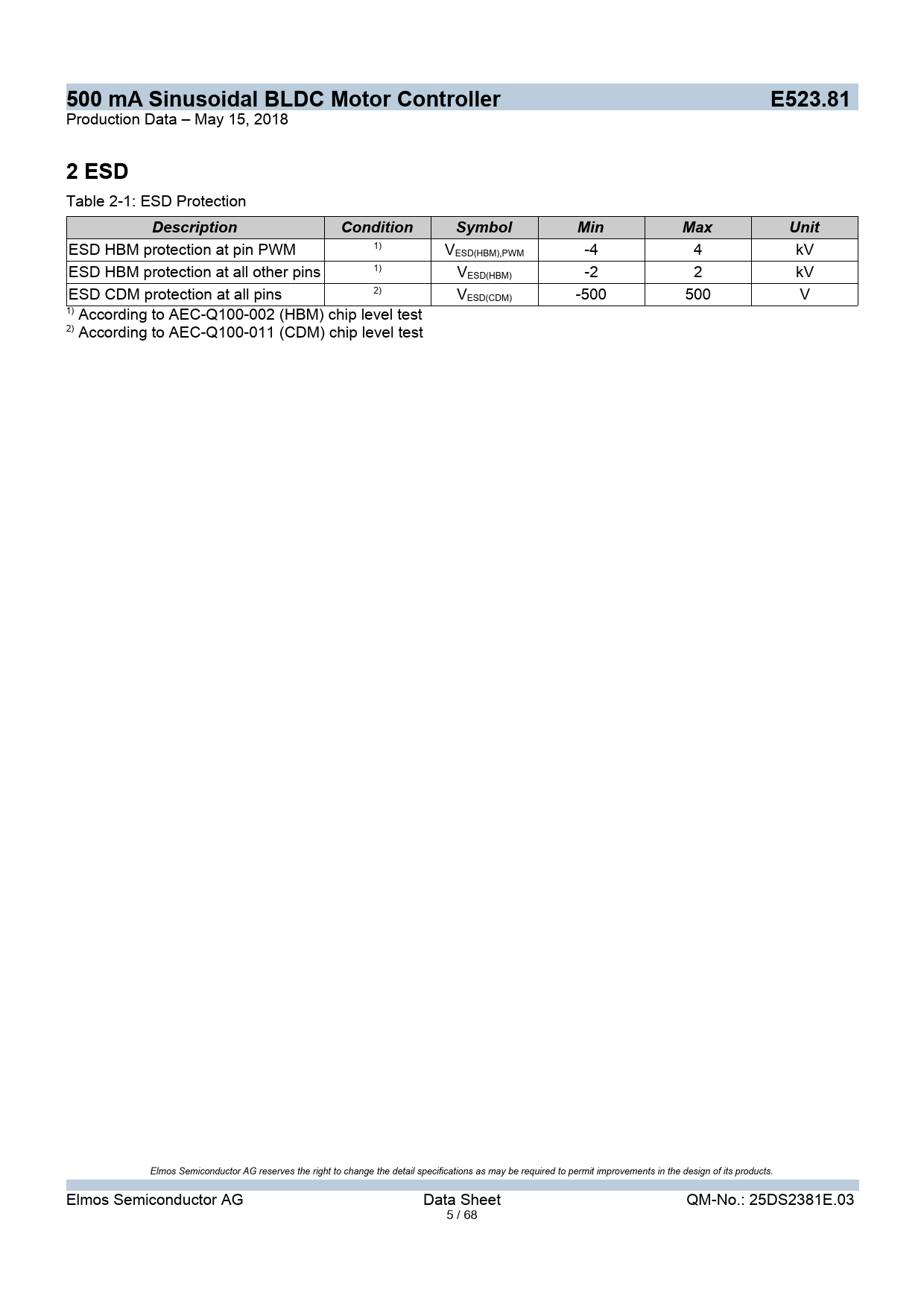 500 mA Sinusoidal BLDC Motor Controller E523.81 2 ESD Description Condition Symbol Min Max Unit