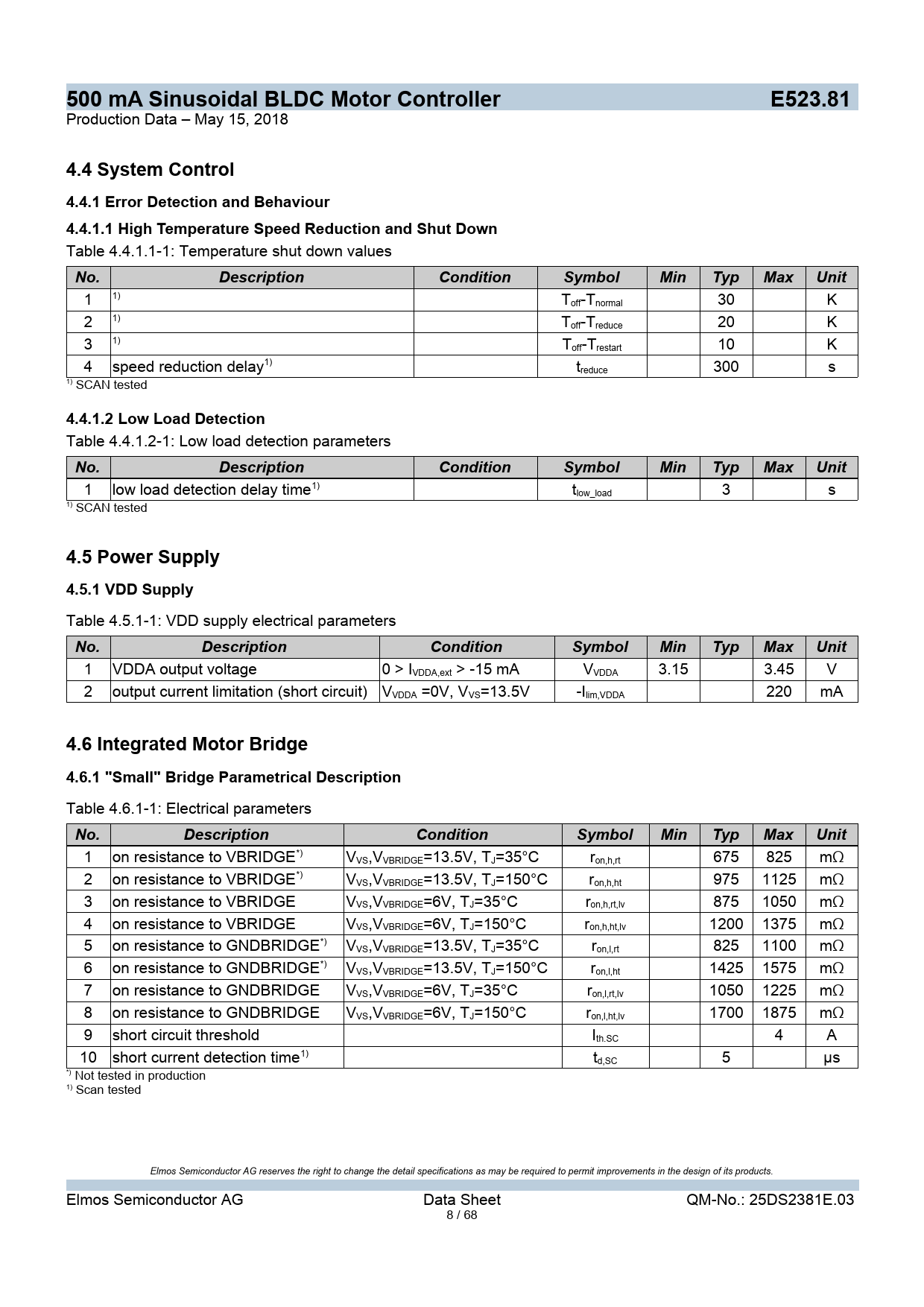 1 on resistance to VBRIDGE*) VVS,VVBRIDGE=13.5V, TJ=35°C ron,h,rt 675 825 mΩ 2 on resistance to VBRIDGE*) VVS,VVBRIDGE=13.5V, TJ=150°C ron,h,ht 975 1125 mΩ 3 on resistance to VBRIDGE VVS,VVBRIDGE=6V, TJ=35°C ron,h,rt,lv 875 1050 mΩ 4 on resistance to VBRIDGE VVS,VVBRIDGE=6V, TJ=150°C ron,h,ht,lv 1200 1375 mΩ 5 on resistance to GNDBRIDGE*) VVS,VVBRIDGE=13.5V, TJ=35°C ron,l,rt 825 1100 mΩ 6 on resistance to GNDBRIDGE*) VVS,VVBRIDGE=13.5V, TJ=150°C ron,l,ht 1425 1575 mΩ 7 on resistance to GNDBRIDGE VVS,VVBRIDGE=6V, TJ=35°C ron,l,rt,lv 1050 1225 mΩ 8 on resistance to GNDBRIDGE VVS,VVBRIDGE=6V, TJ=150°C ron,l,ht,lv 1700 1875 mΩ 9 short circuit threshold Ith.SC 4 A 10 short current detection time1) td,SC 5 µs *) Not tested in production 1) Scan tested Elmos Semiconductor AG reserves the right to change the detail specifications as may be required to permit improvements in the design of its products. Elmos Semiconductor AG Data Sheet QM-No.: 25DS2381E.03 8 / 68 Document Outline Features Applications General Description Ordering Information Typical Operating Circuit Functional Diagram Pin Configuration Pin Description 1 Absolute Maximum Ratings 2 ESD 3 Recommended Operating Conditions 4 Electrical Characteristics 4.1 Clock System 4.2 I/O Peripherals 4.2.1 PWM Speed Input 4.2.2 Low Voltage Digital I/O Pins 4.3 PMSM Motion Control Unit 4.3.1 Speed Control 4.4 System Control 4.4.1 Error Detection and Behaviour 4.4.1.1 High Temperature Speed Reduction and Shut Down 4.4.1.2 Low Load Detection 4.5 Power Supply 4.5.1 VDD Supply 4.6 Integrated Motor Bridge 4.6.1 "Small" Bridge Parametrical Description 4.7 Monitoring and Measurements 4.7.1 Temperature Monitoring 4.7.2 VS Measurement 5 Functional Description 5.1 Overview 5.2 Block Diagrams 5.3 System Level Motor Interface and Error Interface 5.3.1 Motor Interface 5.3.1.1 Goal Speed Input 5.3.2 Error Interface 5.3.3 TACHO Output 5.4 Clock System 5.5 I/O Peripherals 5.5.1 PWM Speed Input 5.5.2 Three Level Test Pin 5.6 PMSM Motion Control Unit 5.6.1 PMSM Control Principle 5.6.1.1 Startup 5.6.1.2 Closed Loop Control 5.6.2 State Machine 5.6.2.1 State Off 5.6.2.2 State Forward Synchronisation 5.6.2.3 State Current Rampup 5.6.2.4 Rotor Settling 5.6.2.5 State Startup RPM Ramp 5.6.2.6 State Closed Loop Control 1 5.6.2.7 State Forward Synchronisation 5.6.2.8 State Closed Loop Control 5.6.3 Speed Control 5.6.4 Phase Voltage Generation 5.6.4.1 PWM Generation 5.6.4.1.1 Principle 5.6.4.1.2 Current Measurement Trigger Generation 5.6.4.2 Averaged Voltage Generation 5.6.4.2.1 Look up Table 5.6.4.3 Look up Table Address Generation 5.6.4.4 Speed Ramp Generator 5.6.4.5 Pll Prescaler Adjust Unit 5.6.4.6 Fundamental Frequency Base Generation 5.6.5 ADC Calculations 5.6.5.1 ADC Current Measurement 5.6.5.1.1 Current Filter 5.6.5.2 BEMF Measurement and Calculation 5.6.5.2.1 Phase Voltage Measurement 5.6.5.2.2 BEMF Calculation 5.6.6 Current Control/Limitation 5.6.7 Stall Detection 5.6.7.1 Current Slope Based Stall Detection 5.6.7.2 Field Speed Based Stall Detection 5.6.7.3 Motor Constant Based Stall Detection 5.6.7.4 Synchronisation Based Stall Detection 5.6.7.5 Current Zero Crossing Observation 5.6.8 Current Direction Detection 5.6.9 Angle Controller 5.6.9.1 Goal Angle Calculation 5.6.9.2 Angle Difference Calculation 5.6.9.3 Generator Detection 5.6.9.4 Frequency Correction 5.6.10 Motor Synchronisation 5.7 System Control 5.7.1 Power up Behaviour 5.7.2 Error Detection and Behaviour 5.7.2.1 High Temperature Speed Reduction and Shut Down 5.7.2.2 High Temperature Current Reduction 5.7.2.3 Low Load Detection 5.7.2.4 Rotor Blockage Detection and Reaction 5.7.2.4.1 Detection 5.7.2.4.2 Reaction 5.7.2.5 Short Circuit Reaction 5.8 System Configuration 5.8.1 Debugging and Configuration Interface 5.8.1.1 Control and State Machine Disabling Functions 5.8.1.2 Observing Special Internal Signals 5.9 Power Supply 5.9.1 Supply Overview IC Supply Only 5.9.2 VDD Supply 5.9.3 References 5.10 Integrated Motor Bridge 5.11 Monitoring and Measurements 5.11.1 Monitoring Principle 5.11.2 Temperature Monitoring 5.11.3 VS Measurement 5.11.4 BEMF Measurement 5.11.5 ADC Reference 5.12 OTP 6 Package Reference 7 Typical Applications 8 Revision History 9 General 9.1 WARNING - Life Support Applications Policy 9.2 General Disclaimer 9.3 Application Disclaimer 10 Contact Info 11 Contents