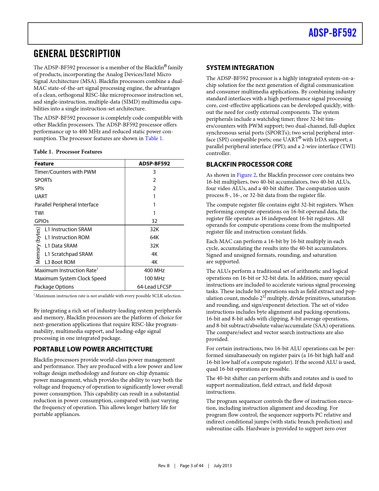 link to page 3 link to page 4 ADSP-BF592GENERAL DESCRIPTION The ADSP-BF592 processor is a member of the Blackfin® family SYSTEM INTEGRATION of products, incorporating the Analog Devices/Intel Micro The ADSP-BF592 processor is a highly integrated system-on-a- Signal Architecture (MSA). Blackfin processors combine a dual- chip solution for the next generation of digital communication MAC state-of-the-art signal processing engine, the advantages and consumer multimedia applications. By combining industry of a clean, orthogonal RISC-like microprocessor instruction set, standard interfaces with a high performance signal processing and single-instruction, multiple-data (SIMD) multimedia capa- core, cost-effective applications can be developed quickly, with- bilities into a single instruction-set architecture. out the need for costly external components. The system The ADSP-BF592 processor is completely code compatible with peripherals include a watchdog timer; three 32-bit tim- other Blackfin processors. The ADSP-BF592 processor offers ers/counters with PWM support; two dual-channel, full-duplex performance up to 400 MHz and reduced static power con- synchronous serial ports (SPORTs); two serial peripheral inter- sumption. The processor features are shown in Table 1. face (SPI) compatible ports; one UART® with IrDA support; a parallel peripheral interface (PPI); and a 2-wire interface (TWI) Table 1. Processor Features controller. FeatureADSP-BF592BLACKFIN PROCESSOR CORE Timer/Counters with PWM 3 As shown in Figure 2, the Blackfin processor core contains two SPORTs 2 16-bit multipliers, two 40-bit accumulators, two 40-bit ALUs, SPIs 2 four video ALUs, and a 40-bit shifter. The computation units UART 1 process 8-, 16-, or 32-bit data from the register file. Parallel Peripheral Interface 1 The compute register file contains eight 32-bit registers. When performing compute operations on 16-bit operand data, the TWI 1 register file operates as 16 independent 16-bit registers. All GPIOs 32 operands for compute operations come from the multiported L1 Instruction SRAM 32K register file and instruction constant fields. L1 Instruction ROM 64K (bytes) Each MAC can perform a 16-bit by 16-bit multiply in each y L1 Data SRAM 32K cycle, accumulating the results into the 40-bit accumulators. mor L1 Scratchpad SRAM 4K Signed and unsigned formats, rounding, and saturation e M L3 Boot ROM 4K are supported. Maximum Instruction Rate1 400 MHz The ALUs perform a traditional set of arithmetic and logical Maximum System Clock Speed 100 MHz operations on 16-bit or 32-bit data. In addition, many special instructions are included to accelerate various signal processing Package Options 64-Lead LFCSP tasks. These include bit operations such as field extract and pop- 1 Maximum instruction rate is not available with every possible SCLK selection. ulation count, modulo 232 multiply, divide primitives, saturation and rounding, and sign/exponent detection. The set of video By integrating a rich set of industry-leading system peripherals instructions includes byte alignment and packing operations, and memory, Blackfin processors are the platform of choice for 16-bit and 8-bit adds with clipping, 8-bit average operations, next-generation applications that require RISC-like program- and 8-bit subtract/absolute value/accumulate (SAA) operations. mability, multimedia support, and leading-edge signal The compare/select and vector search instructions are also processing in one integrated package. provided. PORTABLE LOW POWER ARCHITECTURE For certain instructions, two 16-bit ALU operations can be per- formed simultaneously on register pairs (a 16-bit high half and Blackfin processors provide world-class power management 16-bit low half of a compute register). If the second ALU is used, and performance. They are produced with a low power and low quad 16-bit operations are possible. voltage design methodology and feature on-chip dynamic power management, which provides the ability to vary both the The 40-bit shifter can perform shifts and rotates and is used to voltage and frequency of operation to significantly lower overall support normalization, field extract, and field deposit power consumption. This capability can result in a substantial instructions. reduction in power consumption, compared with just varying The program sequencer controls the flow of instruction execu- the frequency of operation. This allows longer battery life for tion, including instruction alignment and decoding. For portable appliances. program flow control, the sequencer supports PC relative and indirect conditional jumps (with static branch prediction) and subroutine calls. Hardware is provided to support zero over Rev. B | Page 3 of 44 | July 2013 Document Outline Blackfin Embedded Processor Features Memory Peripherals Table Of Contents Revision History General Description Portable Low Power Architecture System Integration Blackfin Processor Core Memory Architecture Internal (Core-Accessible) Memory L1 Utility ROM Custom ROM (Optional) I/O Memory Space Booting from ROM Event Handling Core Event Controller (CEC) System Interrupt Controller (SIC) DMA Controllers Processor Peripherals Watchdog Timer Timers Serial Ports Serial Peripheral Interface (SPI) Ports UART Port Parallel Peripheral Interface (PPI) General-Purpose Mode Descriptions ITU-R 656 Mode Descriptions TWI Controller Interface Ports General-Purpose I/O (GPIO) Dynamic Power Management Full-On Operating Mode—Maximum Performance Active Operating Mode—Moderate Dynamic Power Savings Sleep Operating Mode—High Dynamic Power Savings Deep Sleep Operating Mode—Maximum Dynamic Power Savings Hibernate State—Maximum Static Power Savings Power Savings Voltage Regulation Clock Signals Booting Modes Instruction Set Description Development Tools Integrated Development Environments (IDEs) EZ-KIT Lite Evaluation Board EZ-KIT Lite Evaluation Kits Software Add-Ins for CrossCore Embedded Studio Board Support P