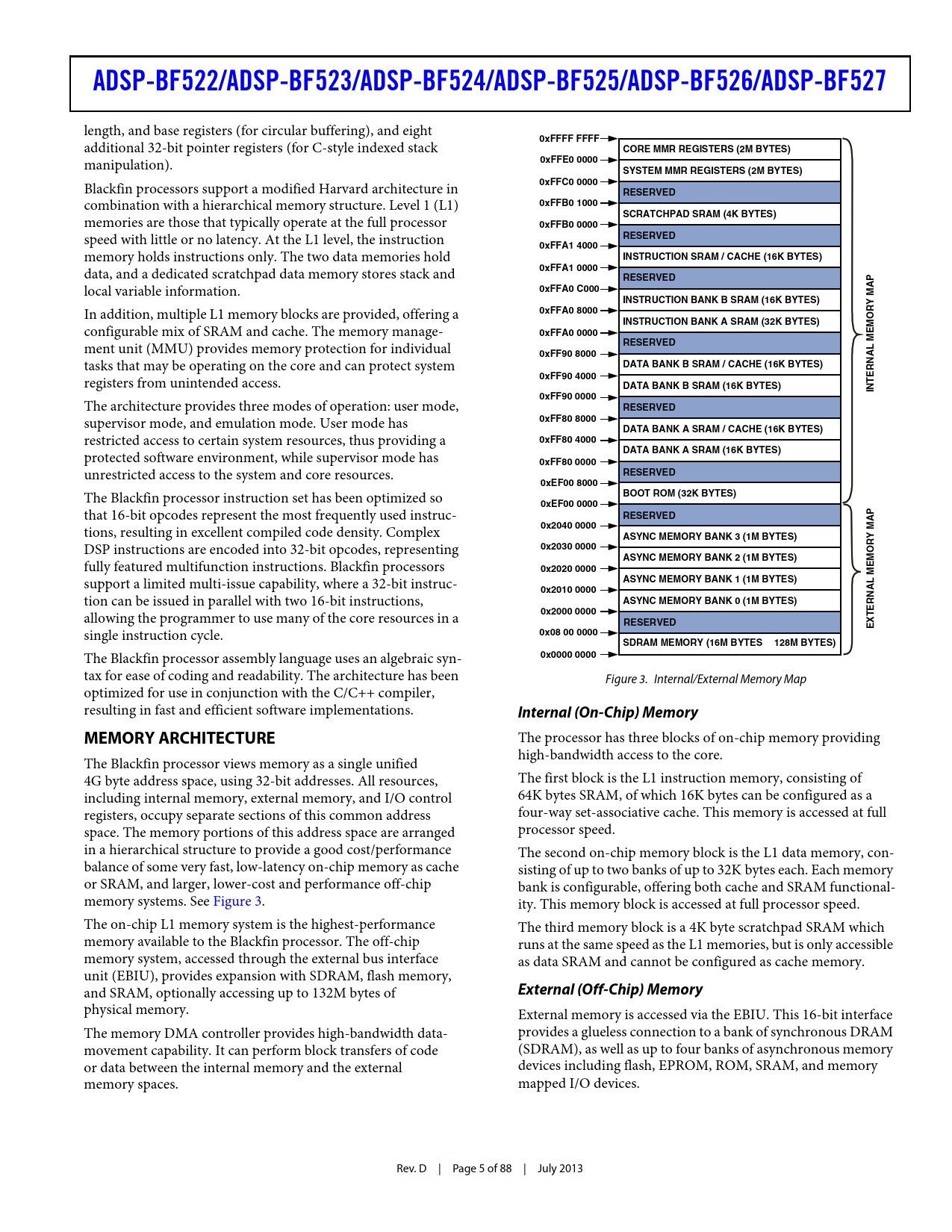 link to page 5 ADSP-BF522/ADSP-BF523/ADSP-BF524/ADSP-BF525/ADSP-BF526/ADSP-BF527 length, and base registers (for circular buffering), and eight 0xFFFF FFFF additional 32-bit pointer registers (for C-style indexed stack CORE MMR REGISTERS (2M BYTES) manipulation). 0xFFE0 0000SYSTEM MMR REGISTERS (2M BYTES)0xFFC0 0000 Blackfin processors support a modified Harvard architecture in RESERVED combination with a hierarchical memory structure. Level 1 (L1) 0xFFB0 1000SCRATCHPAD SRAM (4K BYTES) memories are those that typically operate at the full processor 0xFFB0 0000 speed with little or no latency. At the L1 level, the instruction RESERVED0xFFA1 4000 memory holds instructions only. The two data memories hold INSTRUCTION SRAM / CACHE (16K BYTES) data, and a dedicated scratchpad data memory stores stack and 0xFFA1 0000RESERVEDAP local variable information. 0xFFA0 C000MINSTRUCTION BANK B SRAM (16K BYTES)Y In addition, multiple L1 memory blocks are provided, offering a R0xFFA0 8000OINSTRUCTION BANK A SRAM (32K BYTES) configurable mix of SRAM and cache. The memory manage- EM0xFFA0 0000M ment unit (MMU) provides memory protection for individual RESERVEDL0xFF90 8000A tasks that may be operating on the core and can protect system DATA BANK B SRAM / CACHE (16K BYTES)N ER0xFF90 4000 registers from unintended access. TDATA BANK B SRAM (16K BYTES)IN0xFF90 0000 The architecture provides three modes of operation: user mode, RESERVED supervisor mode, and emulation mode. User mode has 0xFF80 8000DATA BANK A SRAM / CACHE (16K BYTES) restricted access to certain system resources, thus providing a 0xFF80 4000DATA BANK A SRAM (16K BYTES) protected software environment, while supervisor mode has 0xFF80 0000 unrestricted access to the system and core resources. RESERVED0xEF00 8000 The Blackfin processor instruction set has been optimized so BOOT ROM (32K BYTES)0xEF00 0000 that 16-bit opcodes represent the most frequently used instruc- PRESERVEDA tions, resulting in excellent compiled code density. Complex 0x2040 0000MASYNC MEMORY BANK 3 (1M BYTES)Y R DSP instructions are encoded into 32-bit opcodes, representing 0x2030 0000OASYNC MEMORY BANK 2 (1M BYTES)M fully featured multifunction instructions. Blackfin processors E0x2020 0000M support a limited multi-issue capability, where a 32-bit instruc- ASYNC MEMORY BANK 1 (1M BYTES)L0x2010 0000NA tion can be issued in parallel with two 16-bit instructions, ASYNC MEMORY BANK 0 (1M BYTES)R allowing the programmer to use many of the core resources in a 0x2000 0000TE XRESERVEDE single instruction cycle. 0x08 00 0000SDRAM MEMORY (16M BYTES128M BYTES) The Blackfin processor assembly language uses an algebraic syn- 0x0000 0000 tax for ease of coding and readability. The architecture has been Figure 3. Internal/External Memory Map optimized for use in conjunction with the C/C++ compiler, resulting in fast and efficient software implementations. Internal (On-Chip) MemoryMEMORY ARCHITECTURE The processor has three blocks of on-chip memory providing high-bandwidth access to the core. The Blackfin processor views memory as a single unified 4G byte address space, using 32-bit addresses. All resources, The first block is the L1 instruction memory, consisting of including internal memory, external memory, and I/O control 64K bytes SRAM, of which 16K bytes can be configured as a registers, occupy separate sections of this common address four-way set-associative cache. This memory is accessed at full space. The memory portions of this address space are arranged processor speed. in a hierarchical structure to provide a good cost/performance The second on-chip memory block is the L1 data memory, con- balance of some very fast, low-latency on-chip memory as cache sisting of up to two banks of up to 32K bytes each. Each memory or SRAM, and larger, lower-cost and performance off-chip bank is configurable, offering both cache and SRAM functional- memory systems. See Figure 3. ity. This memory block is accessed at full processor speed. The on-chip L1 memory system is the highest-performance The third memory block is a 4K byte scratchpad SRAM which memory available to the Blackfin processor. The off-chip runs at the same speed as the L1 memories, but is only accessible memory system, accessed through the external bus interface as data SRAM and cannot be configured as cache memory. unit (EBIU), provides expansion with SDRAM, flash memory, and SRAM, optionally accessing up to 132M bytes of External (Off-Chip) Memory physical memory. External memory is accessed via the EBIU. This 16-bit interface The memory DMA controller provides high-bandwidth data- provides a glueless connection to a bank of synchronous DRAM movement capability. It can perform block transfers of code (SDRAM), as well as up to four banks of asynchronous memory or data between the internal memory and the external devices including flash, EPROM, ROM, SRAM, and memory memory spaces. mapped I/O devices. Rev. D | Page 5 of 88 | July 2013 Document Outline Blackfin Embedded Processor Features Memory Peripherals Table Of Contents Revision History General Description Portable Low Power Architecture System Integration Processor Peripherals Blackfin Processor Core Memory Architecture Internal (On-Chip) Memory External (Off-Chip) Memory NAND Flash Controller (NFC) One-Time Programmable Memory I/O Memory Space Booting Event Handling Core Event Controller (CEC) System Interrupt Controller (SIC) Event Control DMA Controllers Host DMA Port Real-Time Clock Watchdog Timer Timers Up/Down Counter and Thumbwheel Interface Serial Ports Serial Peripheral Interface (SPI) Port UART Ports TWI Controller Interface 10/100 Ethernet MAC Ports General-Purpose I/O (GPIO) Parallel Peripheral Interface (PPI) General-Purpose Mode Descriptions Input Mode Frame Capture Mode Output Mode ITU-R 656 Mode Descriptions Active Video Mode Vertical Blanking Interval Mode Entire Field Mode USB On-The-Go Dual-Role Device Controller Code Security with Lockbox Secure Technology D