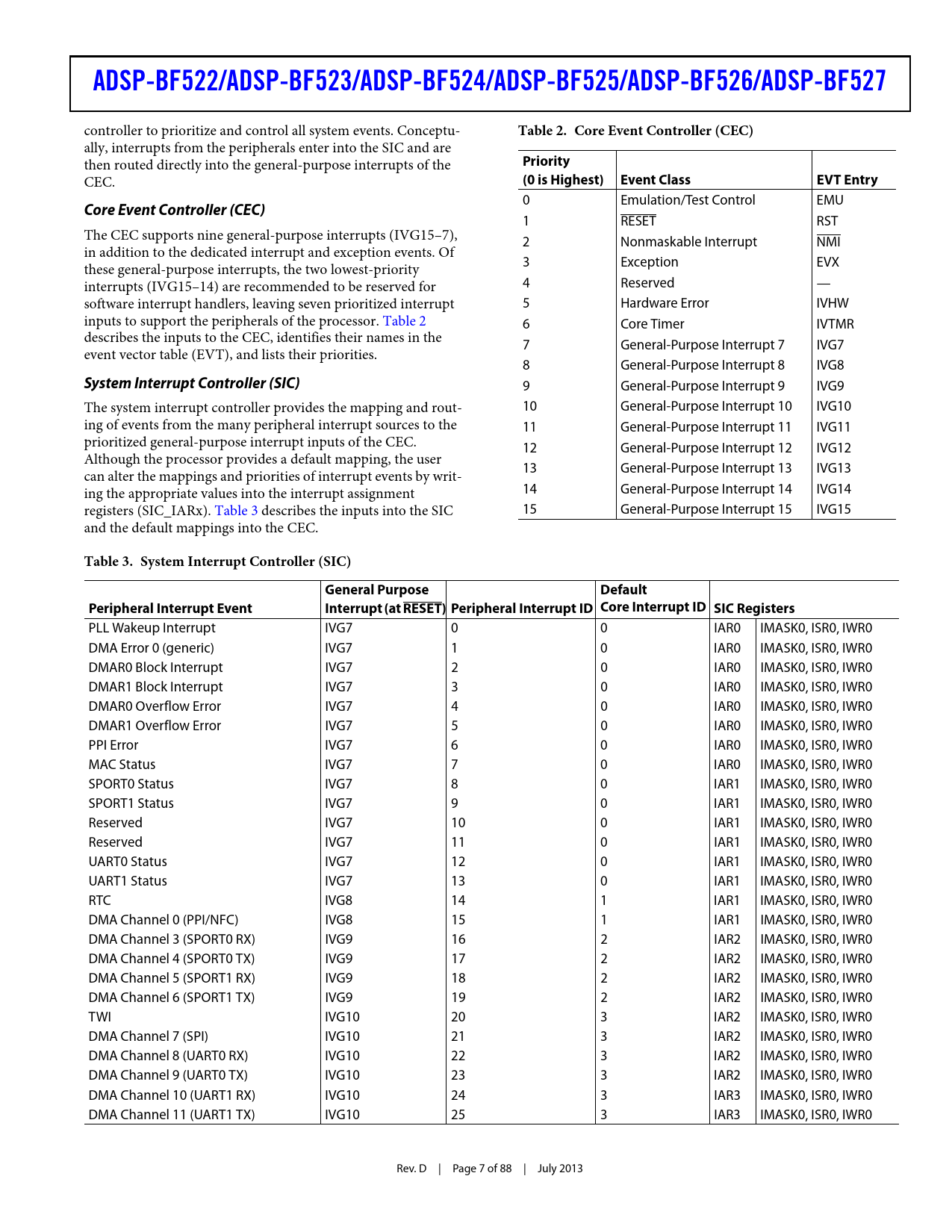 9 General-Purpose Interrupt 9 IVG9 The system interrupt controller provides the mapping and rout- 10 General-Purpose Interrupt 10 IVG10 ing of events from the many peripheral interrupt sources to the 11 General-Purpose Interrupt 11 IVG11 prioritized general-purpose interrupt inputs of the CEC. 12 General-Purpose Interrupt 12 IVG12 Although the processor provides a default mapping, the user 13 General-Purpose Interrupt 13 IVG13 can alter the mappings and priorities of interrupt events by writ- ing the appropriate values into the interrupt assignment 14 General-Purpose Interrupt 14 IVG14 registers (SIC_IARx). Table 3 describes the inputs into the SIC 15 General-Purpose Interrupt 15 IVG15 and the default mappings into the CEC.