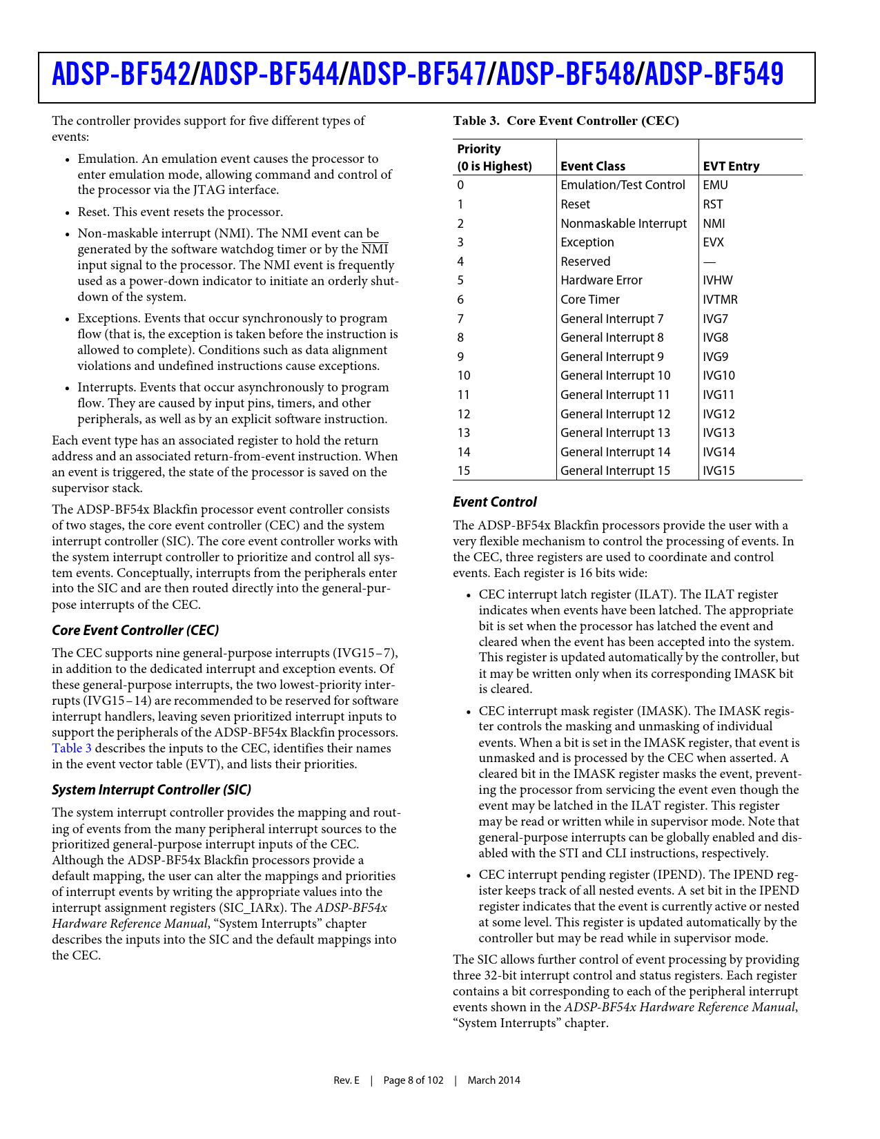 link to page 8 ADSP-BF542/ADSP-BF544/ADSP-BF547/ADSP-BF548/ADSP-BF549 The controller provides support for five different types of Table 3. Core Event Controller (CEC) events: Priority • Emulation. An emulation event causes the processor to (0 is Highest)Event ClassEVT Entry enter emulation mode, allowing command and control of the processor via the JTAG interface. 0 Emulation/Test Control EMU 1 Reset RST • Reset. This event resets the processor. 2 Nonmaskable Interrupt NMI • Non-maskable interrupt (NMI). The NMI event can be 3 Exception EVX generated by the software watchdog timer or by the NMI input signal to the processor. The NMI event is frequently 4 Reserved — used as a power-down indicator to initiate an orderly shut- 5 Hardware Error IVHW down of the system. 6 Core Timer IVTMR • Exceptions. Events that occur synchronously to program 7 General Interrupt 7 IVG7 flow (that is, the exception is taken before the instruction is 8 General Interrupt 8 IVG8 allowed to complete). Conditions such as data alignment 9 General Interrupt 9 IVG9 violations and undefined instructions cause exceptions. 10 General Interrupt 10 IVG10 • Interrupts. Events that occur asynchronously to program 11 General Interrupt 11 IVG11 flow. They are caused by input pins, timers, and other peripherals, as well as by an explicit software instruction. 12 General Interrupt 12 IVG12 13 General Interrupt 13 IVG13 Each event type has an associated register to hold the return address and an associated return-from-event instruction. When 14 General Interrupt 14 IVG14 an event is triggered, the state of the processor is saved on the 15 General Interrupt 15 IVG15 supervisor stack. Event Control The ADSP-BF54x Blackfin processor event controller consists of two stages, the core event controller (CEC) and the system The ADSP-BF54x Blackfin processors provide the user with a interrupt controller (SIC). The core event controller works with very flexible mechanism to control the processing of events. In the system interrupt controller to prioritize and control all sys- the CEC, three registers are used to coordinate and control tem events. Conceptually, interrupts from the peripherals enter events. Each register is 16 bits wide: into the SIC and are then routed directly into the general-pur- • CEC interrupt latch register (ILAT). The ILAT register pose interrupts of the CEC. indicates when events have been latched. The appropriate Core Event Controller (CEC) bit is set when the processor has latched the event and cleared when the event has been accepted into the system. The CEC supports nine general-purpose interrupts (IVG15–7), This register is updated automatically by the controller, but in addition to the dedicated interrupt and exception events. Of it may be written only when its corresponding IMASK bit these general-purpose interrupts, the two lowest-priority inter- is cleared. rupts (IVG15–14) are recommended to be reserved for software interrupt handlers, leaving seven prioritized interrupt inputs to • CEC interrupt mask register (IMASK). The IMASK regis- support the peripherals of the ADSP-BF54x Blackfin processors. ter controls the masking and unmasking of individual Table 3 describes the inputs to the CEC, identifies their names events. When a bit is set in the IMASK register, that event is in the event vector table (EVT), and lists their priorities. unmasked and is processed by the CEC when asserted. A cleared bit in the IMASK register masks the event, prevent- System Interrupt Controller (SIC) ing the processor from servicing the event even though the event may be latched in the ILAT register. This register The system interrupt controller provides the mapping and rout- may be read or written while in supervisor mode. Note that ing of events from the many peripheral interrupt sources to the general-purpose interrupts can be globally enabled and dis- prioritized general-purpose interrupt inputs of the CEC. abled with the STI and CLI instructions, respectively. Although the ADSP-BF54x Blackfin processors provide a default mapping, the user can alter the mappings and priorities • CEC interrupt pending register (IPEND). The IPEND reg- of interrupt events by writing the appropriate values into the ister keeps track of all nested events. A set bit in the IPEND interrupt assignment registers (SIC_IARx). The ADSP-BF54x register indicates that the event is currently active or nested Hardware Reference Manual, “System Interrupts” chapter at some level. This register is updated automatically by the describes the inputs into the SIC and the default mappings into controller but may be read while in supervisor mode. the CEC. The SIC allows further control of event processing by providing three 32-bit interrupt control and status registers. Each register contains a bit corresponding to each of the peripheral interrupt events shown in the ADSP-BF54x Hardware Reference Manual, “System Interrupts” chapter. Rev. E | Page 8 of 102 | March 2014 Document Outline Blackfin Embedded Processor Features Memory Peripherals Table Of Contents Revision History General Description Low Power Architecture System Integration Blackfin Processor Peripherals Blackfin Processor Core Memory Architecture Internal (On-Chip) Memory External (Off-Chip) Memory One-Time-Programmable Memory I/O Memory Space Booting Event Handling Core Event Controller (CEC) System Interrupt Controller (SIC) Event Control DMA Controllers Host DMA Port Interface Real-Time Clock Watchdog Timer Timers Up/Down Counter and Thumbwheel Interface Serial Ports (SPORTs) Serial Peripheral Interface (SPI) Ports UART Ports (UARTs) Controller Area Network (CAN) TWI Controller Interface Ports General-Purpose I/O (GPIO) Pin Interrupts Pixel Compositor (PIXC) Enhanced Parallel Peripheral Interface (EPPI) USB On-the-Go Dual-Role Device Controller ATA/ATAPI-6 Interface Keypad Interface Secure Digital (SD)/SDIO Controller Code Security Media Transceiver MAC Layer (MXVR) Dyn
