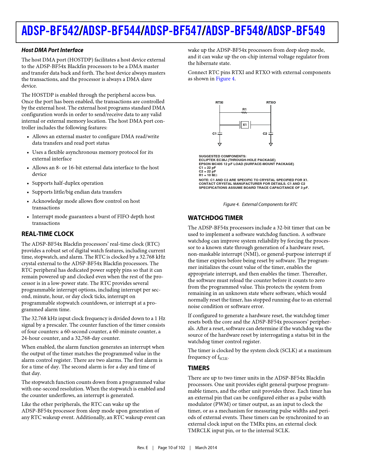 link to page 10 ADSP-BF542/ADSP-BF544/ADSP-BF547/ADSP-BF548/ADSP-BF549Host DMA Port Interface wake up the ADSP-BF54x processors from deep sleep mode, and it can wake up the on-chip internal voltage regulator from The host DMA port (HOSTDP) facilitates a host device external the hibernate state. to the ADSP-BF54x Blackfin processors to be a DMA master and transfer data back and forth. The host device always masters Connect RTC pins RTXI and RTXO with external components the transactions, and the processor is always a DMA slave as shown in Figure 4. device. The HOSTDP is enabled through the peripheral access bus. Once the port has been enabled, the transactions are controlled RTXIRTXO by the external host. The external host programs standard DMA R1 configuration words in order to send/receive data to any valid internal or external memory location. The host DMA port con- X1 troller includes the following features: C1C2 • Allows an external master to configure DMA read/write data transfers and read port status • Uses a flexible asynchronous memory protocol for its external interface SUGGESTED COMPONENTS: ECLIPTEK EC38J (THROUGH-HOLE PACKAGE) EPSON MC405 12 pF LOAD (SURFACE-MOUNT PACKAGE) • Allows an 8- or 16-bit external data interface to the host C1 = 22 pF C2 = 22 pF device R1 = 10 M Ω NOTE: C1 AND C2 ARE SPECIFIC TO CRYSTAL SPECIFIED FOR X1. • Supports half-duplex operation CONTACT CRYSTAL MANUFACTURER FOR DETAILS. C1 AND C2 SPECIFICATIONS ASSUME BOARD TRACE CAPACITANCE OF 3 pF. • Supports little/big endian data transfers • Acknowledge mode allows flow control on host Figure 4. External Components for RTC transactions • Interrupt mode guarantees a burst of FIFO depth host WATCHDOG TIMER transactions The ADSP-BF54x processors include a 32-bit timer that can be REAL-TIME CLOCK used to implement a software watchdog function. A software watchdog can improve system reliability by forcing the proces- The ADSP-BF54x Blackfin processors’ real-time clock (RTC) sor to a known state through generation of a hardware reset, provides a robust set of digital watch features, including current non-maskable interrupt (NMI), or general-purpose interrupt if time, stopwatch, and alarm. The RTC is clocked by a 32.768 kHz the timer expires before being reset by software. The program- crystal external to the ADSP-BF54x Blackfin processors. The mer initializes the count value of the timer, enables the RTC peripheral has dedicated power supply pins so that it can appropriate interrupt, and then enables the timer. Thereafter, remain powered up and clocked even when the rest of the pro- the software must reload the counter before it counts to zero cessor is in a low-power state. The RTC provides several from the programmed value. This protects the system from programmable interrupt options, including interrupt per sec- remaining in an unknown state where software, which would ond, minute, hour, or day clock ticks, interrupt on normally reset the timer, has stopped running due to an external programmable stopwatch countdown, or interrupt at a pro- noise condition or software error. grammed alarm time. If configured to generate a hardware reset, the watchdog timer The 32.768 kHz input clock frequency is divided down to a 1 Hz resets both the core and the ADSP-BF54x processors’ peripher- signal by a prescaler. The counter function of the timer consists als. After a reset, software can determine if the watchdog was the of four counters: a 60-second counter, a 60-minute counter, a source of the hardware reset by interrogating a status bit in the 24-hour counter, and a 32,768-day counter. watchdog timer control register. When enabled, the alarm function generates an interrupt when The timer is clocked by the system clock (SCLK) at a maximum the output of the timer matches the programmed value in the frequency of f alarm control register. There are two alarms. The first alarm is SCLK. for a time of day. The second alarm is for a day and time of TIMERS that day. There are up to two timer units in the ADSP-BF54x Blackfin The stopwatch function counts down from a programmed value processors. One unit provides eight general-purpose program- with one-second resolution. When the stopwatch is enabled and mable timers, and the other unit provides three. Each timer has the counter underflows, an interrupt is generated. an external pin that can be configured either as a pulse width Like the other peripherals, the RTC can wake up the modulator (PWM) or timer output, as an input to clock the ADSP-BF54x processor from sleep mode upon generation of timer, or as a mechanism for measuring pulse widths and peri- any RTC wakeup event. Additionally, an RTC wakeup event can ods of external events. These timers can be synchronized to an external clock input on the TMRx pins, an external clock TMRCLK input pin, or to the internal SCLK. Rev. E | Page 10 of 102 | March 2014 Document Outline Blackfin Embedded Processor Features Memory Peripherals Table Of Contents Revision History General Description Low Power Architecture System Integration Blackfin Processor Peripherals Blackfin Processor Core Memory Architecture Internal (On-Chip) Memory External (Off-Chip) Memory One-Time-Programmable Memory I/O Memory Space Booting Event Handling Core Event Controller (CEC) System Interrupt Controller (SIC) Event Control DMA Controllers Host DMA Port Interface Real-Time Clock Watchdog Timer Timers Up/Down Counter and Thumbwheel Interface Serial Ports (SPORTs) Serial Peripheral Interface (SPI) Ports UART Ports (UARTs) Controller Area Network (CAN) TWI Controller Interface Ports General-Purpose I/O (GPIO) Pin Interrupts Pixel Compositor (PIXC) Enhanced Parallel Peripheral Interface (EPPI) USB On-the-Go Dual-Role Device Controller ATA/ATAPI-6 Interface Keypad Interface Secure Digital (SD)/SDIO Controller Code Security Media Transceiver MAC Layer (MXVR) Dynamic Power Management Full-On Operating Mode—Maximum Performance Active Operating Mode