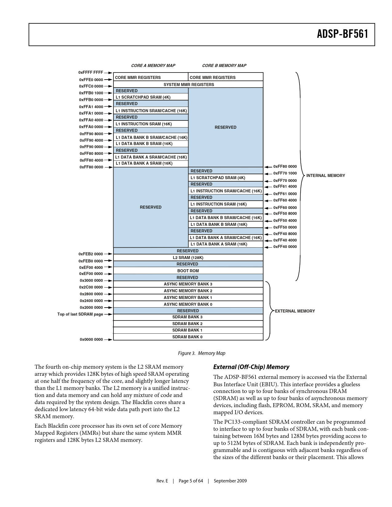 ADSP-BF561 CORE A MEMORY MAPCORE B MEMORY MAP0xFFFF FFFFCORE MMR REGISTERSCORE MMR REGISTERS0xFFE0 00000xFFC0 0000SYSTEM MMR REGISTERSRESERVED0xFFB0 1000L1 SCRATCHPAD SRAM (4K)0xFFB0 0000RESERVED0xFFA1 4000L1 INSTRUCTION SRAM/CACHE (16K)0xFFA1 0000RESERVED0xFFA0 4000L1 INSTRUCTION SRAM (16K)0xFFA0 0000RESERVEDRESERVED0xFF90 8000L1 DATA BANK B SRAM/CACHE (16K)0xFF90 4000L1 DATA BANK B SRAM (16K)0xFF90 0000RESERVED0xFF80 8000L1 DATA BANK A SRAM/CACHE (16K)0xFF80 4000L1 DATA BANK A SRAM (16K)0xFF80 00000xFF80 0000RESERVED0xFF70 1000INTERNAL MEMORYL1 SCRATCHPAD SRAM (4K)0xFF70 0000RESERVED0xFF61 4000L1 INSTRUCTION SRAM/CACHE (16K)0xFF61 0000RESERVED0xFF60 4000L1 INSTRUCTION SRAM (16K)RESERVED0xFF60 0000RESERVED0xFF50 8000L1 DATA BANK B SRAM/CACHE (16K)0xFF50 4000L1 DATA BANK B SRAM (16K)0xFF50 0000RESERVED0xFF40 8000L1 DATA BANK A SRAM/CACHE (16K)0xFF40 4000L1 DATA BANK A SRAM (16K)0xFF40 0000RESERVED0xFEB2 0000L2 SRAM (128K)0xFEB0 0000RESERVED0xEF00 4000BOOT ROM0xEF00 0000RESERVED0x3000 0000ASYNC MEMORY BANK 30x2C00 0000ASYNC MEMORY BANK 20x2800 0000ASYNC MEMORY BANK 10x2400 0000ASYNC MEMORY BANK 00x2000 0000RESERVEDEXTERNAL MEMORYTop of last SDRAM pageSDRAM BANK 3SDRAM BANK 2SDRAM BANK 1SDRAM BANK 00x0000 0000 Figure 3. Memory Map The fourth on-chip memory system is the L2 SRAM memory External (Off-Chip) Memory array which provides 128K bytes of high speed SRAM operating The ADSP-BF561 external memory is accessed via the External at one half the frequency of the core, and slightly longer latency Bus Interface Unit (EBIU). This interface provides a glueless than the L1 memory banks. The L2 memory is a unified instruc connection to up to four banks of synchronous DRAM tion and data memory and can hold any mixture of code and (SDRAM) as well as up to four banks of asynchronous memory data required by the system design. The Blackfin cores share a devices, including flash, EPROM, ROM, SRAM, and memory dedicated low latency 64-bit wide data path port into the L2 mapped I/O devices. SRAM memory. The PC133-compliant SDRAM controller can be programmed Each Blackfin core processor has its own set of core Memory to interface to up to four banks of SDRAM, with each bank con Mapped Registers (MMRs) but share the same system MMR taining between 16M bytes and 128M bytes providing access to registers and 128K bytes L2 SRAM memory. up to 512M bytes of SDRAM. Each bank is independently pro grammable and is contiguous with adjacent banks regardless of the sizes of the different banks or their placement. This allows Rev. E | Page 5 of 64 | September 2009 Document Outline Features Peripherals Table of Contents Revision History General Description Portable Low Power Architecture Blackfin Processor Core Memory Architecture Internal (On-Chip) Memory External (Off-Chip) Memory I/O Memory Space Booting Event Handling Core Event Controller (CEC) System Interrupt Controller (SIC) Event Control DMA Controllers Watchdog Timer Timers Serial Ports (SPORTs) Serial Peripheral Interface (SPI) Port UART Port Programmable Flags (PFx) Parallel Peripheral Interface General-Purpose Mode Descriptions Input Mode Frame Capture Mode Output Mode ITU-R 656 Mode Descriptions Active Video Only Mode Vertical Blanking Interval Mode Entire Field Mode Dynamic Power Management Full-On Operating Mode-Maximum Performance Active Operating Mode-Moderate Power Savings Sleep Operating Mode-High Dynamic Power Savings Deep Sleep Operating Mode-Maximum Dynamic Power Savings Hibernate State-Maximum Static Power Savings Power Savings Voltage Regulation Voltage Regulator Layout Guidelines Clock Signals Booting Modes Instruction Set Description Development Tools EZ-KIT Lite Evaluation Board Designing an Emulator-Compatible Processor Board Related Documents Pin Descriptions Specifications Operating Conditions Electrical Characteristics Absolute Maximum Ratings Package Information ESD Sensitivity Timing Specifications Clock and Reset Timing Asynchronous Memory Read Cycle Timing Asynchronous Memory Write Cycle Timing SDRAM Interface Timing External Port Bus Request and Grant Cycle Timing Parallel Peripheral Interface Timing Serial Ports Serial Peripheral Interface (SPI) Port- Master Timing Serial Peripheral Interface (SPI) Port- Slave Timing Universal Asynchronous Receiver Transmitter (UART) Port-Receive and Transmit Timing Programmable Flags Cycle Timing Timer Cycle Timing JTAG Test and Emulation Port Timing Output Drive Currents Power Dissipation Test Conditions Output Enable Time Measurement Output Disable Time Measurement Example System Hold Time Calculation Capacitive Loading Environmental Conditions 256-Ball CSP_BGA (17 mm) Ball Assignment 256-Ball CSP_BGA (12 mm) Ball Assignment 297-Ball PBGA Ball Assignment Outline Dimensions Surface-Mount Design Automotive Products Ordering Guide