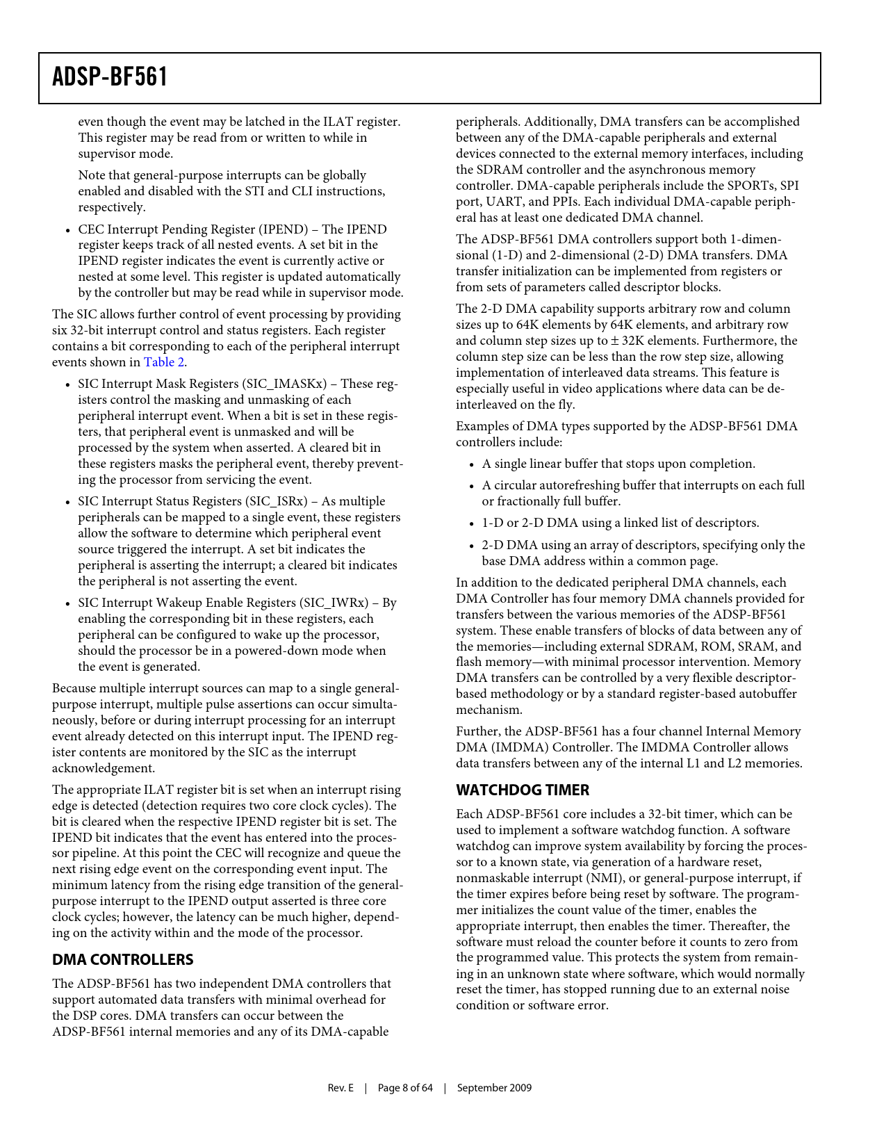 link to page 7 ADSP-BF561 even though the event may be latched in the ILAT register. peripherals. Additionally, DMA transfers can be accomplished This register may be read from or written to while in between any of the DMA-capable peripherals and external supervisor mode. devices connected to the external memory interfaces, including Note that general-purpose interrupts can be globally the SDRAM controller and the asynchronous memory enabled and disabled with the STI and CLI instructions, controller. DMA-capable peripherals include the SPORTs, SPI respectively. port, UART, and PPIs. Each individual DMA-capable periph eral has at least one dedicated DMA channel. • CEC Interrupt Pending Register (IPEND) – The IPEND register keeps track of all nested events. A set bit in the The ADSP-BF561 DMA controllers support both 1-dimen IPEND register indicates the event is currently active or sional (1-D) and 2-dimensional (2-D) DMA transfers. DMA nested at some level. This register is updated automatically transfer initialization can be implemented from registers or by the controller but may be read while in supervisor mode. from sets of parameters called descriptor blocks. The SIC allows further control of event processing by providing The 2-D DMA capability supports arbitrary row and column six 32-bit interrupt control and status registers. Each register sizes up to 64K elements by 64K elements, and arbitrary row contains a bit corresponding to each of the peripheral interrupt and column step sizes up to ± 32K elements. Furthermore, the events shown in Table 2. column step size can be less than the row step size, allowing implementation of interleaved data streams. This feature is • SIC Interrupt Mask Registers (SIC_IMASKx) – These reg especially useful in video applications where data can be de- isters control the masking and unmasking of each interleaved on the fly. peripheral interrupt event. When a bit is set in these regis ters, that peripheral event is unmasked and will be Examples of DMA types supported by the ADSP-BF561 DMA processed by the system when asserted. A cleared bit in controllers include: these registers masks the peripheral event, thereby prevent • A single linear buffer that stops upon completion. ing the processor from servicing the event. • A circular autorefreshing buffer that interrupts on each full • SIC Interrupt Status Registers (SIC_ISRx) – As multiple or fractionally full buffer. peripherals can be mapped to a single event, these registers • 1-D or 2-D DMA using a linked list of descriptors. allow the software to determine which peripheral event source triggered the interrupt. A set bit indicates the • 2-D DMA using an array of descriptors, specifying only the peripheral is asserting the interrupt; a cleared bit indicates base DMA address within a common page. the peripheral is not asserting the event. In addition to the dedicated peripheral DMA channels, each • SIC Interrupt Wakeup Enable Registers (SIC_IWRx) – By DMA Controller has four memory DMA channels provided for enabling the corresponding bit in these registers, each transfers between the various memories of the ADSP-BF561 peripheral can be configured to wake up the processor, system. These enable transfers of blocks of data between any of should the processor be in a powered-down mode when the memories—including external SDRAM, ROM, SRAM, and the event is generated. flash memory—with minimal processor intervention. Memory DMA transfers can be controlled by a very flexible descriptor- Because multiple interrupt sources can map to a single general- based methodology or by a standard register-based autobuffer purpose interrupt, multiple pulse assertions can occur simulta mechanism. neously, before or during interrupt processing for an interrupt event already detected on this interrupt input. The IPEND reg Further, the ADSP-BF561 has a four channel Internal Memory ister contents are monitored by the SIC as the interrupt DMA (IMDMA) Controller. The IMDMA Controller allows acknowledgement. data transfers between any of the internal L1 and L2 memories. The appropriate ILAT register bit is set when an interrupt rising WATCHDOG TIMER edge is detected (detection requires two core clock cycles). The Each ADSP-BF561 core includes a 32-bit timer, which can be bit is cleared when the respective IPEND register bit is set. The used to implement a software watchdog function. A software IPEND bit indicates that the event has entered into the proces watchdog can improve system availability by forcing the proces sor pipeline. At this point the CEC will recognize and queue the sor to a known state, via generation of a hardware reset, next rising edge event on the corresponding event input. The nonmaskable interrupt (NMI), or general-purpose interrupt, if minimum latency from the rising edge transition of the general- the timer expires before being reset by software. The program purpose interrupt to the IPEND output asserted is three core mer initializes the count value of the timer, enables the clock cycles; however, the latency can be much higher, depend appropriate interrupt, then enables the timer. Thereafter, the ing on the activity within and the mode of the processor. software must reload the counter before it counts to zero from DMA CONTROLLERS the programmed value. This protects the system from remain ing in an unknown state where software, which would normally The ADSP-BF561 has two independent DMA controllers that reset the timer, has stopped running due to an external noise support automated data transfers with minimal overhead for condition or software error. the DSP cores. DMA transfers can occur between the ADSP-BF561 internal memories and any of its DMA-capable Rev. E | Page 8 of 64 | September 2009 Document Outline Features Peripherals Table of Contents Revision History General Description Portable Low Power Architecture Blackfin Processor Core Memory Architecture Internal (On-Chip) M