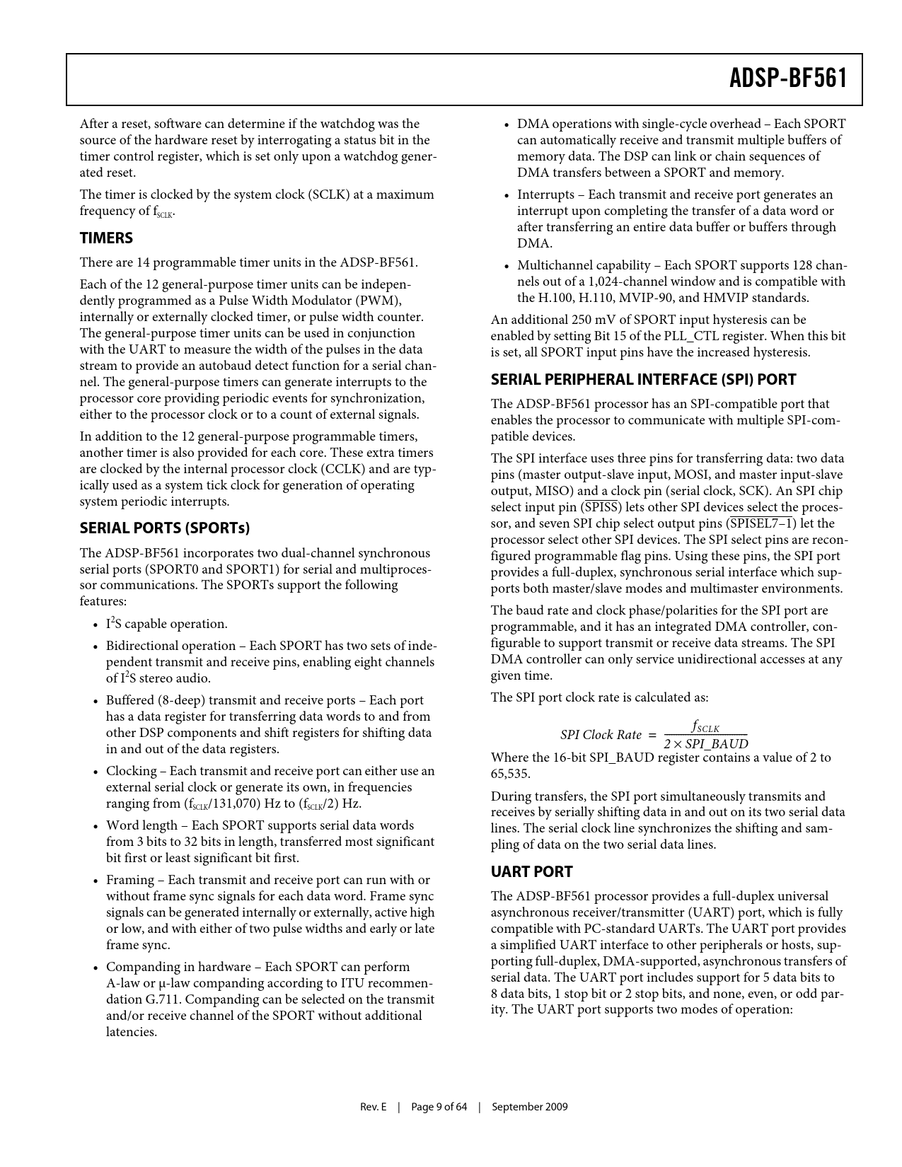 ADSP-BF561 After a reset, software can determine if the watchdog was the • DMA operations with single-cycle overhead – Each SPORT source of the hardware reset by interrogating a status bit in the can automatically receive and transmit multiple buffers of timer control register, which is set only upon a watchdog gener memory data. The DSP can link or chain sequences of ated reset. DMA transfers between a SPORT and memory. The timer is clocked by the system clock (SCLK) at a maximum • Interrupts – Each transmit and receive port generates an frequency of f . interrupt upon completing the transfer of a data word or SCLK after transferring an entire data buffer or buffers through TIMERS DMA. There are 14 programmable timer units in the ADSP-BF561. • Multichannel capability – Each SPORT supports 128 chan Each of the 12 general-purpose timer units can be indepen nels out of a 1,024-channel window and is compatible with dently programmed as a Pulse Width Modulator (PWM), the H.100, H.110, MVIP-90, and HMVIP standards. internally or externally clocked timer, or pulse width counter. An additional 250 mV of SPORT input hysteresis can be The general-purpose timer units can be used in conjunction enabled by setting Bit 15 of the PLL_CTL register. When this bit with the UART to measure the width of the pulses in the data is set, all SPORT input pins have the increased hysteresis. stream to provide an autobaud detect function for a serial chan nel. The general-purpose timers can generate interrupts to the SERIAL PERIPHERAL INTERFACE (SPI) PORT processor core providing periodic events for synchronization, The ADSP-BF561 processor has an SPI-compatible port that either to the processor clock or to a count of external signals. enables the processor to communicate with multiple SPI-com In addition to the 12 general-purpose programmable timers, patible devices. another timer is also provided for each core. These extra timers The SPI interface uses three pins for transferring data: two data are clocked by the internal processor clock (CCLK) and are typ pins (master output-slave input, MOSI, and master input-slave ically used as a system tick clock for generation of operating output, MISO) and a clock pin (serial clock, SCK). An SPI chip system periodic interrupts. select input pin (SPISS) lets other SPI devices select the proces SERIAL PORTS (SPORTs) sor, and seven SPI chip select output pins (SPISEL7–1) let the processor select other SPI devices. The SPI select pins are recon The ADSP-BF561 incorporates two dual-channel synchronous figured programmable flag pins. Using these pins, the SPI port serial ports (SPORT0 and SPORT1) for serial and multiproces provides a full-duplex, synchronous serial interface which sup sor communications. The SPORTs support the following ports both master/slave modes and multimaster environments. features: The baud rate and clock phase/polarities for the SPI port are • I2S capable operation. programmable, and it has an integrated DMA controller, con • Bidirectional operation – Each SPORT has two sets of inde figurable to support transmit or receive data streams. The SPI pendent transmit and receive pins, enabling eight channels DMA controller can only service unidirectional accesses at any of I2S stereo audio. given time. • Buffered (8-deep) transmit and receive ports – Each port The SPI port clock rate is calculated as: has a data register for transferring data words to and from f other DSP components and shift registers for shifting data SCLK SPI Clock Rate = ------------------ in and out of the data registers. 2 × SPI_BAUD Where the 16-bit SPI_BAUD register contains a value of 2 to • Clocking – Each transmit and receive port can either use an 65,535. external serial clock or generate its own, in frequencies During transfers, the SPI port simultaneously transmits and ranging from (f /131,070) Hz to (f /2) Hz. SCLK SCLK receives by serially shifting data in and out on its two serial data • Word length – Each SPORT supports serial data words lines. The serial clock line synchronizes the shifting and sam from 3 bits to 32 bits in length, transferred most significant pling of data on the two serial data lines. bit first or least significant bit first. UART PORT • Framing – Each transmit and receive port can run with or without frame sync signals for each data word. Frame sync The ADSP-BF561 processor provides a full-duplex universal signals can be generated internally or externally, active high asynchronous receiver/transmitter (UART) port, which is fully or low, and with either of two pulse widths and early or late compatible with PC-standard UARTs. The UART port provides frame sync. a simplified UART interface to other peripherals or hosts, sup • Companding in hardware – Each SPORT can perform porting full-duplex, DMA-supported, asynchronous transfers of A-law or μ-law companding according to ITU recommen serial data. The UART port includes support for 5 data bits to dation G.711. Companding can be selected on the transmit 8 data bits, 1 stop bit or 2 stop bits, and none, even, or odd par and/or receive channel of the SPORT without additional ity. The UART port supports two modes of operation: latencies. Rev. E | Page 9 of 64 | September 2009 Document Outline Features Peripherals Table of Contents Revision History General Description Portable Low Power Architecture Blackfin Processor Core Memory Architecture Internal (On-Chip) Memory External (Off-Chip) Memory I/O Memory Space Booting Event Handling Core Event Controller (CEC) System Interrupt Controller (SIC) Event Control DMA Controllers Watchdog Timer Timers Serial Ports (SPORTs) Serial Peripheral Interface (SPI) Port UART Port Programmable Flags (PFx) Parallel Peripheral Interface General-Purpose Mode Descriptions Input Mode Frame Capture Mode Output Mode ITU-R 656 Mode Descriptions Active Video Only Mode Vertical Blanking Interval Mode Entire Field Mode Dynamic Power Management Full