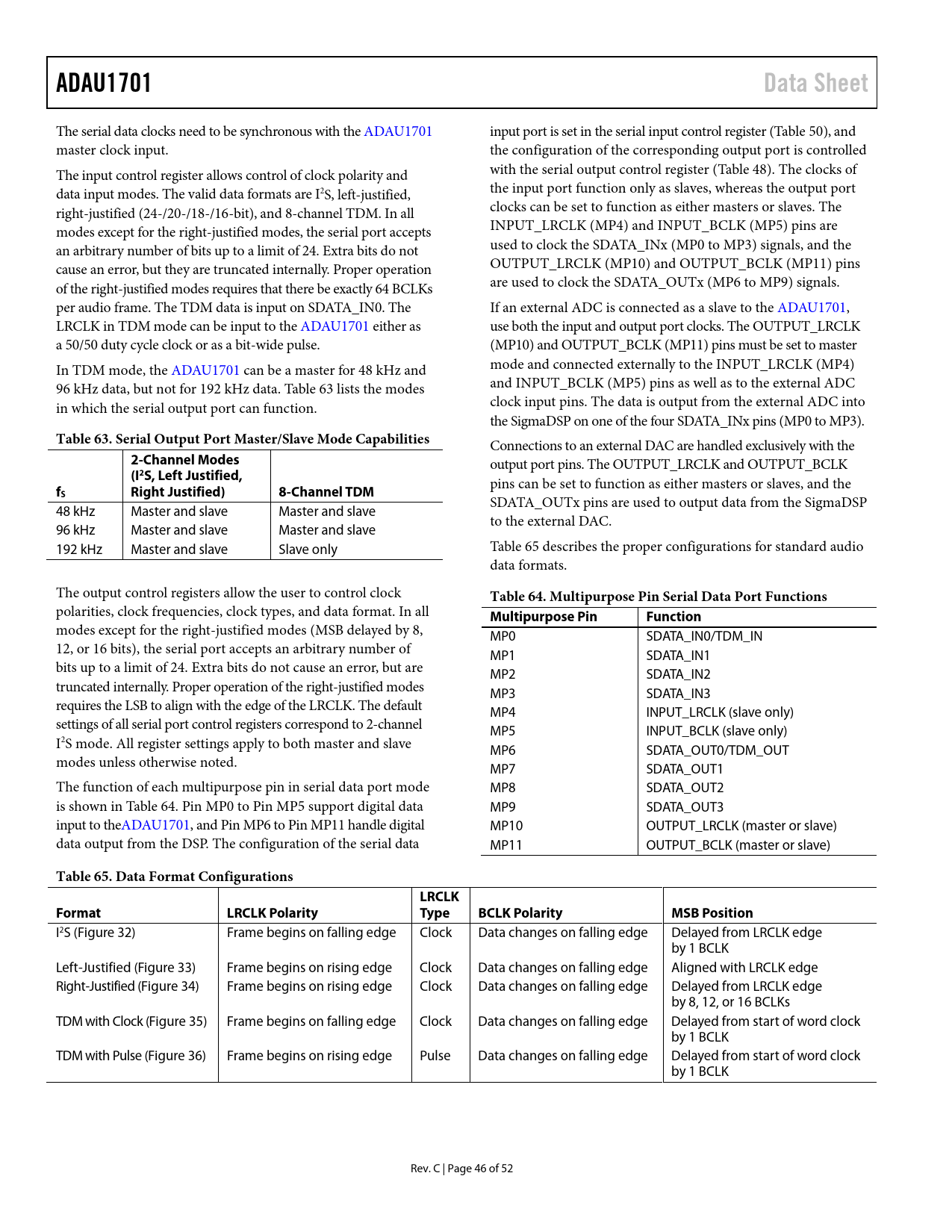 modes except for the right-justified modes (MSB delayed by 8, MP0 SDATA_IN0/TDM_IN 12, or 16 bits), the serial port accepts an arbitrary number of MP1 SDATA_IN1 bits up to a limit of 24. Extra bits do not cause an error, but are MP2 SDATA_IN2 truncated internal y. Proper operation of the right-justified modes MP3 SDATA_IN3 requires the LSB to align with the edge of the LRCLK. The default MP4 INPUT_LRCLK (slave only) settings of al serial port control registers correspond to 2-channel MP5 INPUT_BCLK (slave only) I2S mode. All register settings apply to both master and slave MP6 SDATA_OUT0/TDM_OUT modes unless otherwise noted. MP7 SDATA_OUT1 The function of each multipurpose pin in serial data port mode MP8 SDATA_OUT2 is shown in Table 64. Pin MP0 to Pin MP5 support digital data MP9 SDATA_OUT3 input to theADAU1701, and Pin MP6 to Pin MP11 handle digital MP10 OUTPUT_LRCLK (master or slave) data output from the DSP. The configuration of the serial data MP11 OUTPUT_BCLK (master or slave)