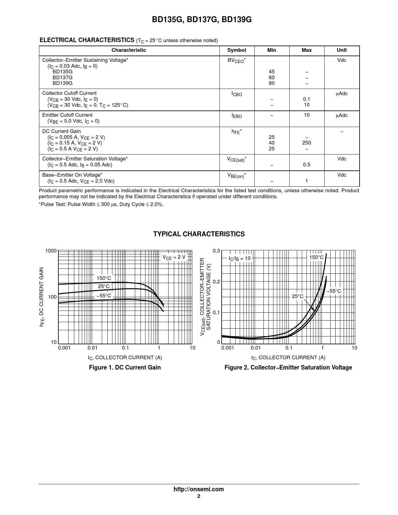Collector−Emitter Sustaining Voltage* BVCEO* Vdc (IC = 0.03 Adc, IB = 0) BD135G 45 − BD137G 60 − BD139G 80 − Collector Cutoff Current ICBO mAdc (VCB = 30 Vdc, IE = 0) − 0.1 (VCB = 30 Vdc, IE = 0, TC = 125_C) − 10 Emitter Cutoff Current IEBO − 10 mAdc (VBE = 5.0 Vdc, IC = 0) DC Current Gain hFE* − (IC = 0.005 A, VCE = 2 V) 25 − (IC = 0.15 A, VCE = 2 V) 40 250 (IC = 0.5 A VCE = 2 V) 25 − Collector−Emitter Saturation Voltage* VCE(sat)* Vdc (IC = 0.5 Adc, IB = 0.05 Adc) − 0.5 Base−Emitter On Voltage* VBE(on)* Vdc (IC = 0.5 Adc, VCE = 2.0 Vdc) − 1 Product parametric performance is indicated in the Electrical Characteristics for the listed test conditions, unless otherwise noted. Product performance may not be indicated by the Electrical Characteristics if operated under different conditions. *Pulse Test: Pulse Width ≤ 300 ms, Duty Cycle ≤ 2.0%.