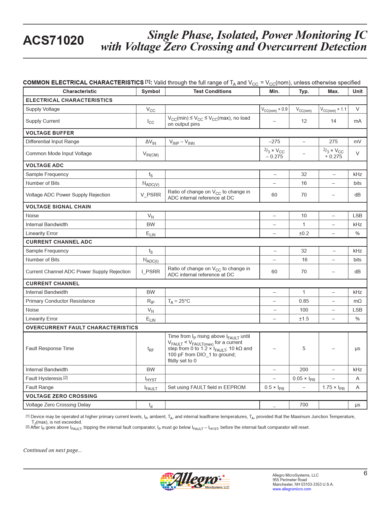 Single Phase, Isolated, Power Monitoring IC ACS71020 with Voltage Zero Crossing and Overcurrent Detection COMMON ELECTRICAL CHARACTERISTICS [1]:
