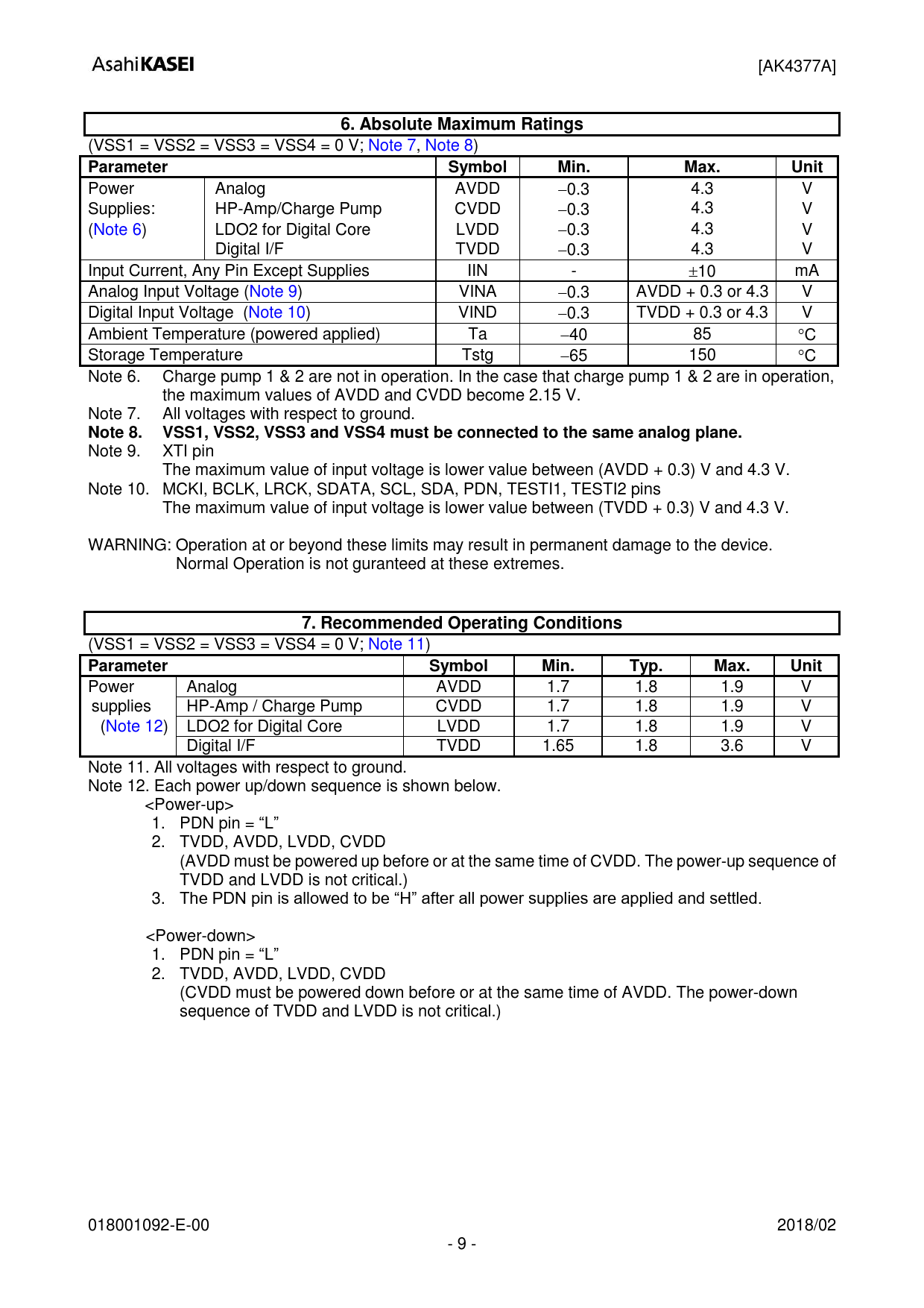 [AK4377A] 6 Absolute Maximum Ratings (VSS1 = VSS2 = VSS3 = VSS4 = 0 V; Note 7, Note 8) Parameter Symbol Min Max Unit Power