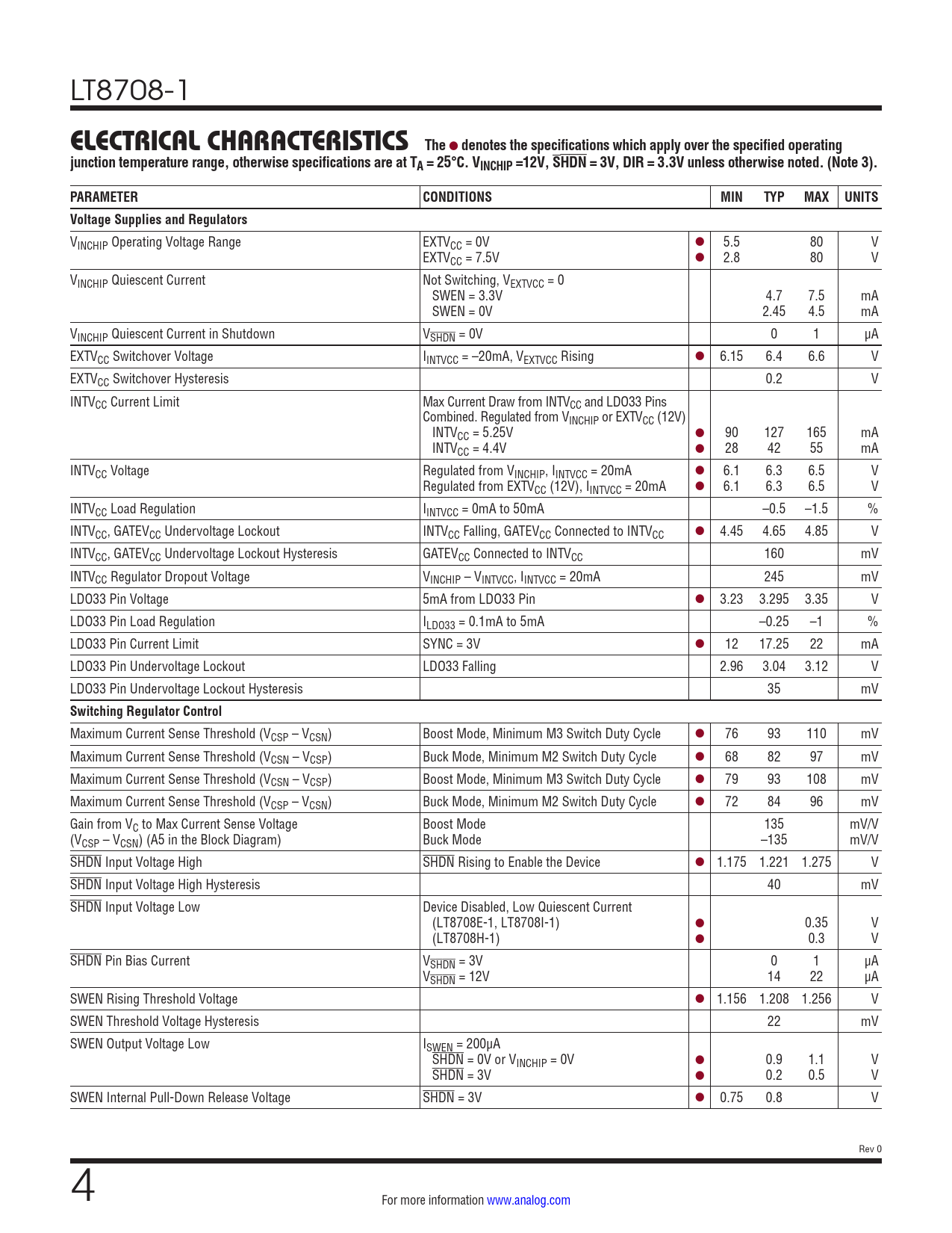LT8708-1 ELECTRICAL CHARACTERISTICSThe l denotes the specifications which apply over the specified operatingjunction temperature range, otherwise specifications are at TA = 25°C. VINCHIP =12V, SHDN = 3V, DIR = 3.3V unless otherwise noted. (Note 3).PARAMETERCONDITIONSMINTYPMAX UNITSVoltage Supplies and Regulators VINCHIP Operating Voltage Range EXTVCC = 0V l 5.5 80 V EXTVCC = 7.5V l 2.8 80 V VINCHIP Quiescent Current Not Switching, VEXTVCC = 0 SWEN = 3.3V 4.7 7.5 mA SWEN = 0V 2.45 4.5 mA VINCHIP Quiescent Current in Shutdown VSHDN = 0V 0 1 µA EXTVCC Switchover Voltage IINTVCC = –20mA, VEXTVCC Rising l 6.15 6.4 6.6 V EXTVCC Switchover Hysteresis 0.2 V INTVCC Current Limit Max Current Draw from INTVCC and LDO33 Pins Combined. Regulated from VINCHIP or EXTVCC (12V) INTVCC = 5.25V l 90 127 165 mA INTVCC = 4.4V l 28 42 55 mA INTVCC Voltage Regulated from VINCHIP, IINTVCC = 20mA l 6.1 6.3 6.5 V Regulated from EXTVCC (12V), IINTVCC = 20mA l 6.1 6.3 6.5 V INTVCC Load Regulation IINTVCC = 0mA to 50mA –0.5 –1.5 % INTVCC, GATEVCC Undervoltage Lockout INTVCC Falling, GATEVCC Connected to INTVCC l 4.45 4.65 4.85 V INTVCC, GATEVCC Undervoltage Lockout Hysteresis GATEVCC Connected to INTVCC 160 mV INTVCC Regulator Dropout Voltage VINCHIP – VINTVCC, IINTVCC = 20mA 245 mV LDO33 Pin Voltage 5mA from LDO33 Pin l 3.23 3.295 3.35 V LDO33 Pin Load Regulation ILDO33 = 0.1mA to 5mA –0.25 –1 % LDO33 Pin Current Limit SYNC = 3V l 12 17.25 22 mA LDO33 Pin Undervoltage Lockout LDO33 Falling 2.96 3.04 3.12 V LDO33 Pin Undervoltage Lockout Hysteresis 35 mV Switching Regulator Control Maximum Current Sense Threshold (VCSP – VCSN) Boost Mode, Minimum M3 Switch Duty Cycle l 76 93 110 mV Maximum Current Sense Threshold (VCSN – VCSP) Buck Mode, Minimum M2 Switch Duty Cycle l 68 82 97 mV Maximum Current Sense Threshold (VCSN – VCSP) Boost Mode, Minimum M3 Switch Duty Cycle l 79 93 108 mV Maximum Current Sense Threshold (VCSP – VCSN) Buck Mode, Minimum M2 Switch Duty Cycle l 72 84 96 mV Gain from VC to Max Current Sense Voltage Boost Mode 135 mV/V (VCSP – VCSN) (A5 in the Block Diagram) Buck Mode –135 mV/V SHDN Input Voltage High SHDN Rising to Enable the Device l 1.175 1.221 1.275 V SHDN Input Voltage High Hysteresis 40 mV SHDN Input Voltage Low Device Disabled, Low Quiescent Current (LT8708E-1, LT8708I-1) l 0.35 V (LT8708H-1) l 0.3 V SHDN Pin Bias Current VSHDN = 3V 0 1 µA VSHDN = 12V 14 22 µA SWEN Rising Threshold Voltage l 1.156 1.208 1.256 V SWEN Threshold Voltage Hysteresis 22 mV SWEN Output Voltage Low ISWEN = 200µA SHDN = 0V or VINCHIP = 0V l 0.9 1.1 V SHDN = 3V l 0.2 0.5 V SWEN Internal Pull-Down Release Voltage SHDN = 3V l 0.75 0.8 V Rev 0 4 For more information www.analog.com Document Outline Features Applications Typical Application Description Absolute Maximum Ratings Order Information Pin Configuration Electrical Characteristics Typical Performance Characteristics Pin Functions Block Diagram Operation Applications Information Package Description Typical Application Related Parts Features Applications Typical Application Description Absolute Maximum Ratings Order Information Pin Configuration Electrical Characteristics Typical Performance Characteristics Pin Functions Block Diagram Operation Common LT8708-1 and LT8708 Features Adding Phases to an LT8708 Application Adding Phases: The Master LT8708 Adding Phases: The Slave LT8708-1 Start-Up Start-Up: SWEN Pin Start-Up: Soft-Start of Switching Regulator Control Overview Power Switch Control Unidirectional and Bidirectional Conduction Error Amplifiers Transfer Function: IOUT(SLAVE) Vs IOUT(MASTER) Transfer Function: CCM Transfer Function: DCM, HCM and Burst Mode Operation Current Monitoring and Limiting Monitoring: IOUT(SLAVE) Monitoring and Limiting: IIN(SLAVE) Multiphase Clocking Applications Information Quick-Start Multiphase Setup Quick Setup: Design the Master Phase Quick Setup: Design the Slave Phase(s) Quick Setup: Evaluation Choosing the Total Number of Phases Operating Frequency Selection CIN and COUT Selection CIN and COUT Selection: VIN Capacitance CIN and COUT Selection: VOUT Capacitance VINHIMON, VOUTLOMON and RVSOFF Configuring the IIN(SLAVE) Current Limits Regulating IOUT(SLAVE) IOUT(SLAVE): Circuit Description IOUT(SLAVE): Configuration Loop Compensation Voltage Lockouts Circuit Board Layout Checklist Design Example Typical Applications Package Description Typical Application Related Parts