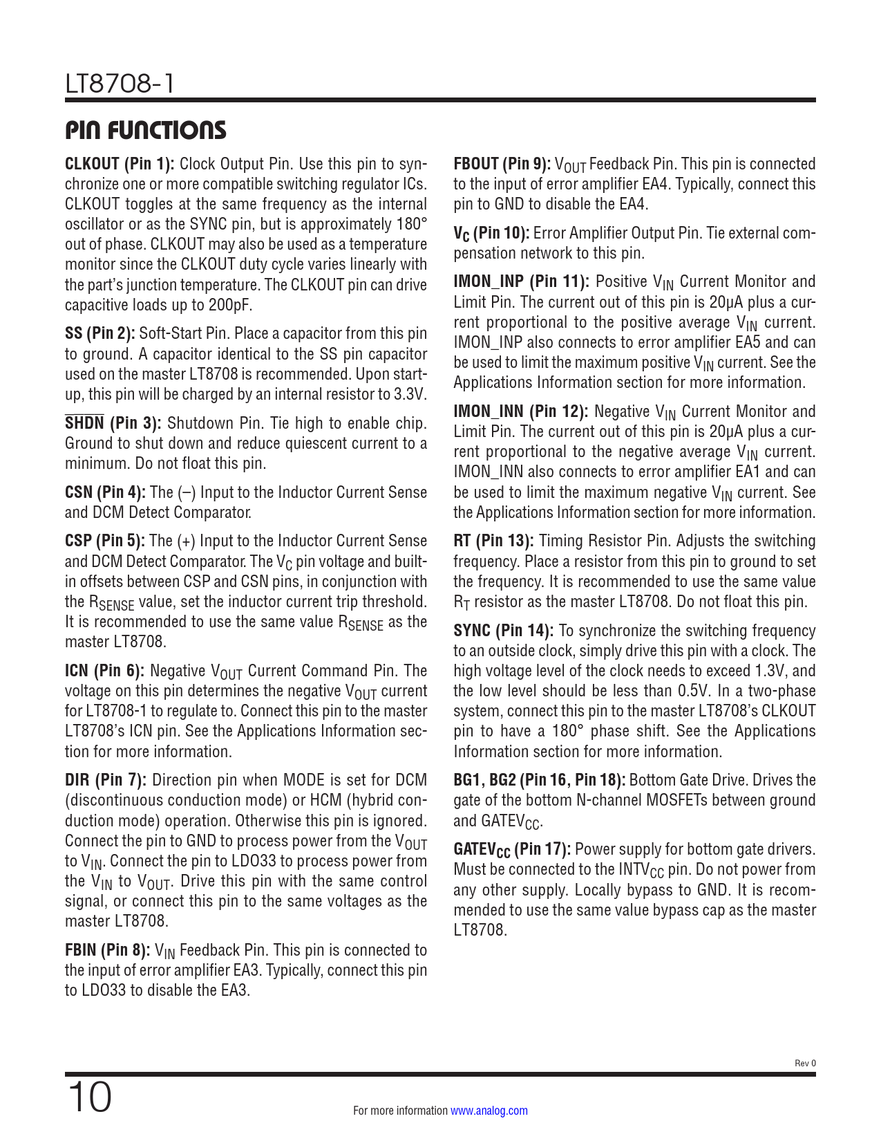 Negative VOUT Current Command Pin. The high voltage level of the clock needs to exceed 1.3V, and voltage on this pin determines the negative VOUT current the low level should be less than 0.5V. In a two-phase for LT8708-1 to regulate to. Connect this pin to the master system, connect this pin to the master LT8708’s CLKOUT LT8708’s ICN pin. See the Applications Information sec- pin to have a 180° phase shift. See the Applications tion for more information. Information section for more information.