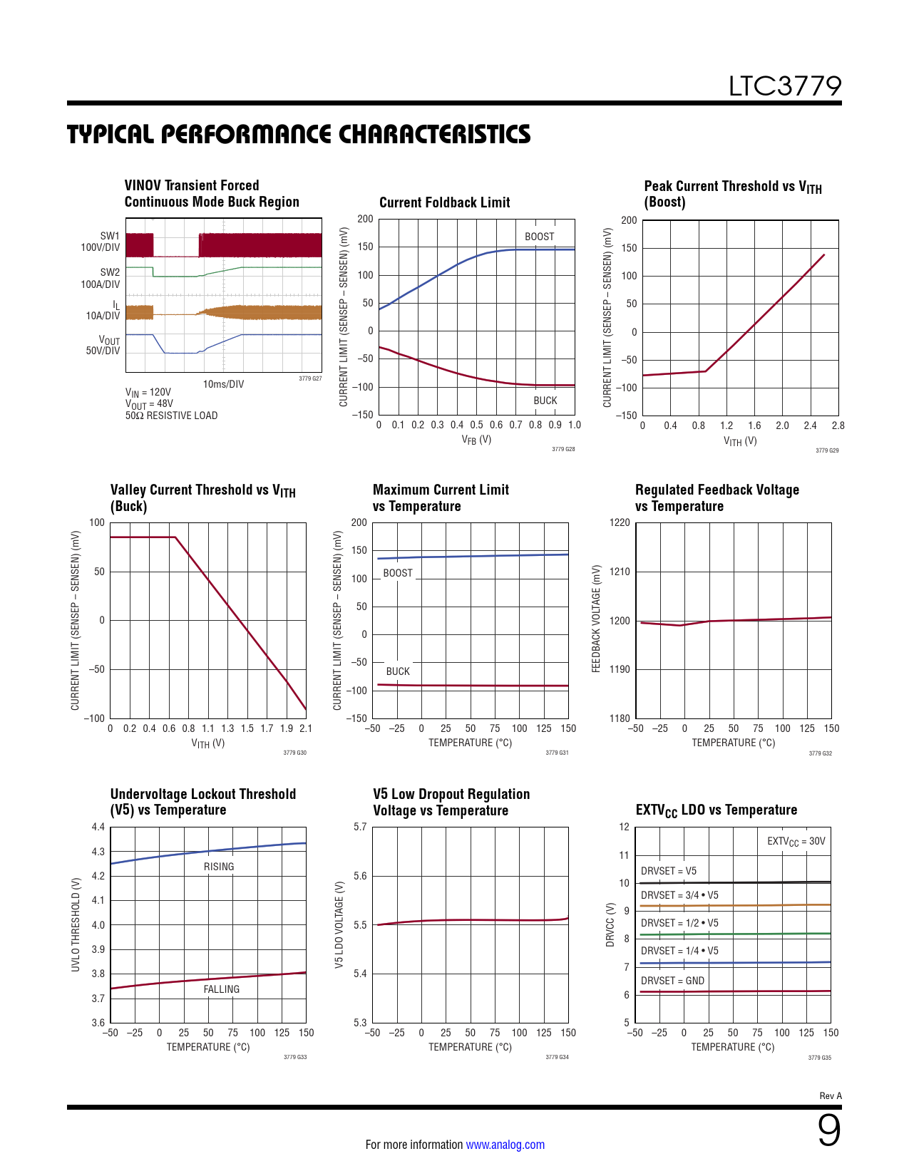 100 200 1220 150 50 BOOST 1210 100 50 TAGE (mV) 0 1200 0 –50 –50 BUCK FEEDBACK VOL 1190 –100 CURRENT LIMIT (SENSEP – SENSEN) (mV) CURRENT LIMIT (SENSEP – SENSEN) (mV) –100 –150 1180 0 0.2 0.4 0.6 0.8 1.1 1.3 1.5 1.7 1.9 2.1 –50 –25 0 25 50 75 100 125 150 –50 –25 0 25 50 75 100 125 150 VITH (V) TEMPERATURE (°C) TEMPERATURE (°C) 3779 G30 3779 G31 3779 G32