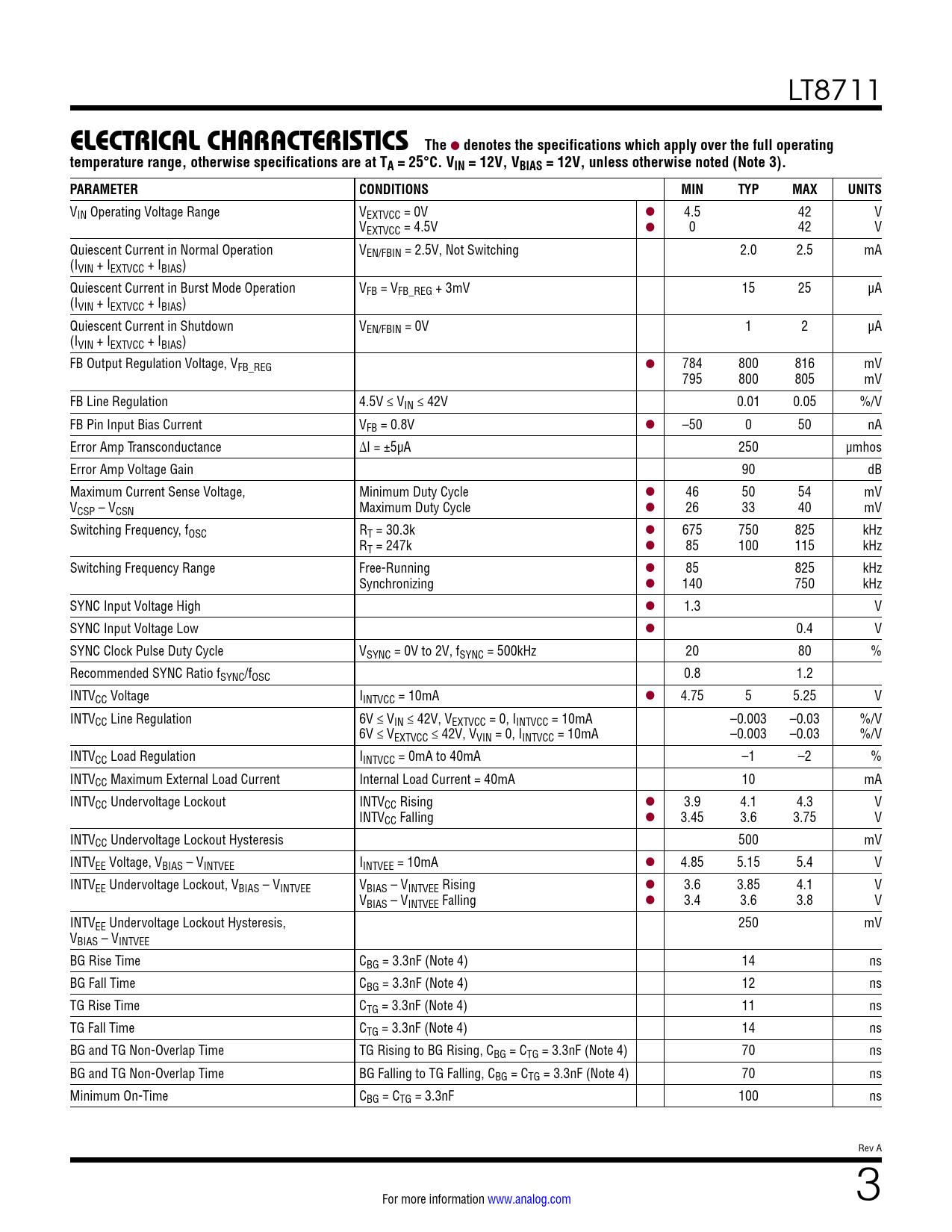 VIN Operating Voltage Range VEXTVCC = 0V l 4.5 42 V VEXTVCC = 4.5V l 0 42 V Quiescent Current in Normal Operation VEN/FBIN = 2.5V, Not Switching 2.0 2.5 mA (IVIN + IEXTVCC + IBIAS) Quiescent Current in Burst Mode Operation VFB = VFB_REG + 3mV 15 25 µA (IVIN + IEXTVCC + IBIAS) Quiescent Current in Shutdown VEN/FBIN = 0V 1 2 µA (IVIN + IEXTVCC + IBIAS) FB Output Regulation Voltage, VFB_REG l 784 800 816 mV 795 800 805 mV FB Line Regulation 4.5V ≤ VIN ≤ 42V 0.01 0.05 %/V FB Pin Input Bias Current VFB = 0.8V l –50 0 50 nA Error Amp Transconductance ∆I = ±5µA 250 µmhos Error Amp Voltage Gain 90 dB Maximum Current Sense Voltage, Minimum Duty Cycle l 46 50 54 mV VCSP – VCSN Maximum Duty Cycle l 26 33 40 mV Switching Frequency, fOSC RT = 30.3k l 675 750 825 kHz RT = 247k l 85 100 115 kHz Switching Frequency Range Free-Running l 85 825 kHz Synchronizing l 140 750 kHz SYNC Input Voltage High l 1.3 V SYNC Input Voltage Low l 0.4 V SYNC Clock Pulse Duty Cycle VSYNC = 0V to 2V, fSYNC = 500kHz 20 80 % Recommended SYNC Ratio fSYNC/fOSC 0.8 1.2 INTVCC Voltage IINTVCC = 10mA l 4.75 5 5.25 V INTVCC Line Regulation 6V ≤ VIN ≤ 42V, VEXTVCC = 0, IINTVCC = 10mA –0.003 –0.03 %/V 6V ≤ VEXTVCC ≤ 42V, VVIN = 0, IINTVCC = 10mA –0.003 –0.03 %/V INTVCC Load Regulation IINTVCC = 0mA to 40mA –1 –2 % INTVCC Maximum External Load Current Internal Load Current = 40mA 10 mA INTVCC Undervoltage Lockout INTVCC Rising l 3.9 4.1 4.3 V INTVCC Falling l 3.45 3.6 3.75 V INTVCC Undervoltage Lockout Hysteresis 500 mV INTVEE Voltage, VBIAS – VINTVEE IINTVEE = 10mA l 4.85 5.15 5.4 V INTVEE Undervoltage Lockout, VBIAS – VINTVEE VBIAS – VINTVEE Rising l 3.6 3.85 4.1 V VBIAS – VINTVEE Falling l 3.4 3.6 3.8 V INTVEE Undervoltage Lockout Hysteresis, 250 mV VBIAS – VINTVEE BG Rise Time CBG = 3.3nF (Note 4) 14 ns BG Fall Time CBG = 3.3nF (Note 4) 12 ns TG Rise Time CTG = 3.3nF (Note 4) 11 ns TG Fall Time CTG = 3.3nF (Note 4) 14 ns BG and TG Non-Overlap Time TG Rising to BG Rising, CBG = CTG = 3.3nF (Note 4) 70 ns BG and TG Non-Overlap Time BG Falling to TG Falling, CBG = CTG = 3.3nF (Note 4) 70 ns Minimum On-Time CBG = CTG = 3.3nF 100 ns Rev A For more information www.analog.com 3 Document Outline Features Applications Typical Application Description Absolute Maximum Ratings Pin Configuration Order Information Electrical Characteristics Typical Performance Characteristics Pin Functions Block Diagram Start-Up and Fault Sequence Operation Applications Information Appendix Typical Applications Package Description Typical Application Related Parts