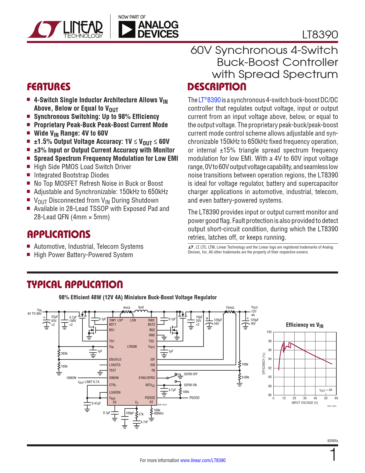 LT8390 60V Synchronous 4-Switch Buck-Boost Controller with Spread Spectrum