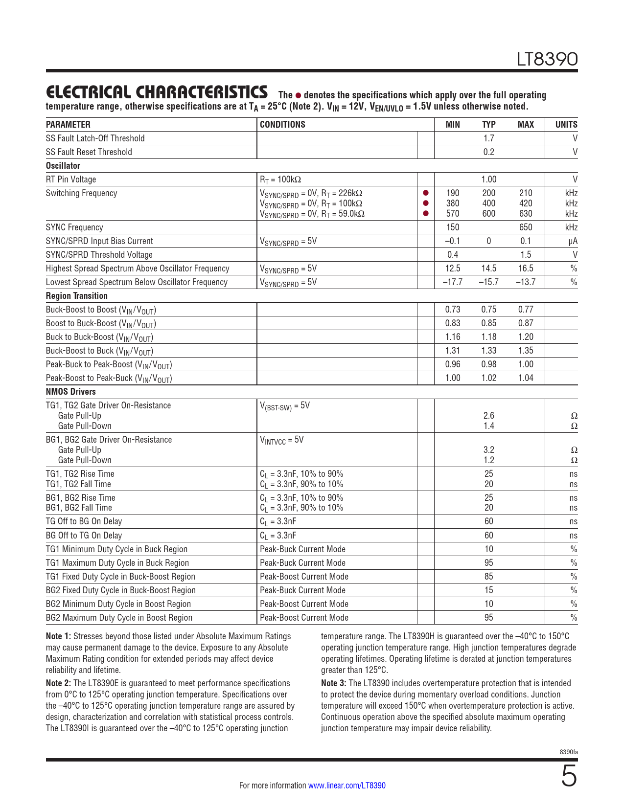 LT8390 ELECTRICAL CHARACTERISTICSThe l denotes the specifications which apply over the full operatingtemperature range, otherwise specifications are at TA = 25°C (Note 2). VIN = 12V, VEN/UVLO = 1.5V unless otherwise noted. PARAMETERCONDITIONSMINTYPMAXUNITS SS Fault Latch-Off Threshold 1.7 V SS Fault Reset Threshold 0.2 V Oscillator RT Pin Voltage RT = 100kΩ 1.00 V Switching Frequency VSYNC/SPRD = 0V, RT = 226kΩ l 190 200 210 kHz VSYNC/SPRD = 0V, RT = 100kΩ l 380 400 420 kHz VSYNC/SPRD = 0V, RT = 59.0kΩ l 570 600 630 kHz SYNC Frequency 150 650 kHz SYNC/SPRD Input Bias Current VSYNC/SPRD = 5V –0.1 0 0.1 µA SYNC/SPRD Threshold Voltage 0.4 1.5 V Highest Spread Spectrum Above Oscillator Frequency VSYNC/SPRD = 5V 12.5 14.5 16.5 % Lowest Spread Spectrum Below Oscillator Frequency VSYNC/SPRD = 5V –17.7 –15.7 –13.7 % Region Transition Buck-Boost to Boost (VIN/VOUT) 0.73 0.75 0.77 Boost to Buck-Boost (VIN/VOUT) 0.83 0.85 0.87 Buck to Buck-Boost (VIN/VOUT) 1.16 1.18 1.20 Buck-Boost to Buck (VIN/VOUT) 1.31 1.33 1.35 Peak-Buck to Peak-Boost (VIN/VOUT) 0.96 0.98 1.00 Peak-Boost to Peak-Buck (VIN/VOUT) 1.00 1.02 1.04 NMOS Drivers TG1, TG2 Gate Driver On-Resistance V(BST-SW) = 5V Gate Pull-Up 2.6 Ω Gate Pull-Down 1.4 Ω BG1, BG2 Gate Driver On-Resistance VINTVCC = 5V Gate Pull-Up 3.2 Ω Gate Pull-Down 1.2 Ω TG1, TG2 Rise Time CL = 3.3nF, 10% to 90% 25 ns TG1, TG2 Fall Time CL = 3.3nF, 90% to 10% 20 ns BG1, BG2 Rise Time CL = 3.3nF, 10% to 90% 25 ns BG1, BG2 Fall Time CL = 3.3nF, 90% to 10% 20 ns TG Off to BG On Delay CL = 3.3nF 60 ns BG Off to TG On Delay CL = 3.3nF 60 ns TG1 Minimum Duty Cycle in Buck Region Peak-Buck Current Mode 10 % TG1 Maximum Duty Cycle in Buck Region Peak-Buck Current Mode 95 % TG1 Fixed Duty Cycle in Buck-Boost Region Peak-Boost Current Mode 85 % BG2 Fixed Duty Cycle in Buck-Boost Region Peak-Buck Current Mode 15 % BG2 Minimum Duty Cycle in Boost Region Peak-Boost Current Mode 10 % BG2 Maximum Duty Cycle in Boost Region Peak-Boost Current Mode 95 % Note 1: Stresses beyond those listed under Absolute Maximum Ratings temperature range. The LT8390H is guaranteed over the –40°C to 150°C may cause permanent damage to the device. Exposure to any Absolute operating junction temperature range. High junction temperatures degrade Maximum Rating condition for extended periods may affect device operating lifetimes. Operating lifetime is derated at junction temperatures reliability and lifetime. greater than 125°C. Note 2: The LT8390E is guaranteed to meet performance specifications Note 3: The LT8390 includes overtemperature protection that is intended from 0°C to 125°C operating junction temperature. Specifications over to protect the device during momentary overload conditions. Junction the –40°C to 125°C operating junction temperature range are assured by temperature will exceed 150°C when overtemperature protection is active. design, characterization and correlation with statistical process controls. Continuous operation above the specified absolute maximum operating The LT8390I is guaranteed over the –40°C to 125°C operating junction junction temperature may impair device reliability. 8390fa For more information www.linear.com/LT8390 5 Document Outline Features Applications Description Typical Application Absolute Maximum Ratings Pin Configuration Order Information Electrical Characteristics Typical Performance Characteristics Pin Functions Block Diagram Operation Applications Information Typical Applications Package Description Revision History Typical Application Related Parts