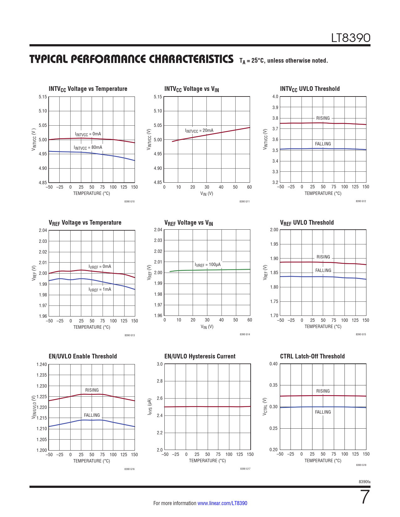5.15 5.15 4.0 3.9 5.10 5.10 3.8 RISING 5.05 5.05 I 3.7 INTVCC = 20mA (V ) IINTVCC = 0mA (V) (V) VCC 5.00 VCC 5.00 VCC 3.6 FALLING V INT IINTVCC = 80mA V INT V INT 3.5 4.95 4.95 3.4 4.90 4.90 3.3 4.85 4.85 3.2 –50 –25 0 25 50 75 100 125 150 0 10 20 30 40 50 60 –50 –25 0 25 50 75 100 125 150 TEMPERATURE (°C) VIN (V) TEMPERATURE (°C) 8390 G10 8390 G11 8390 G12
