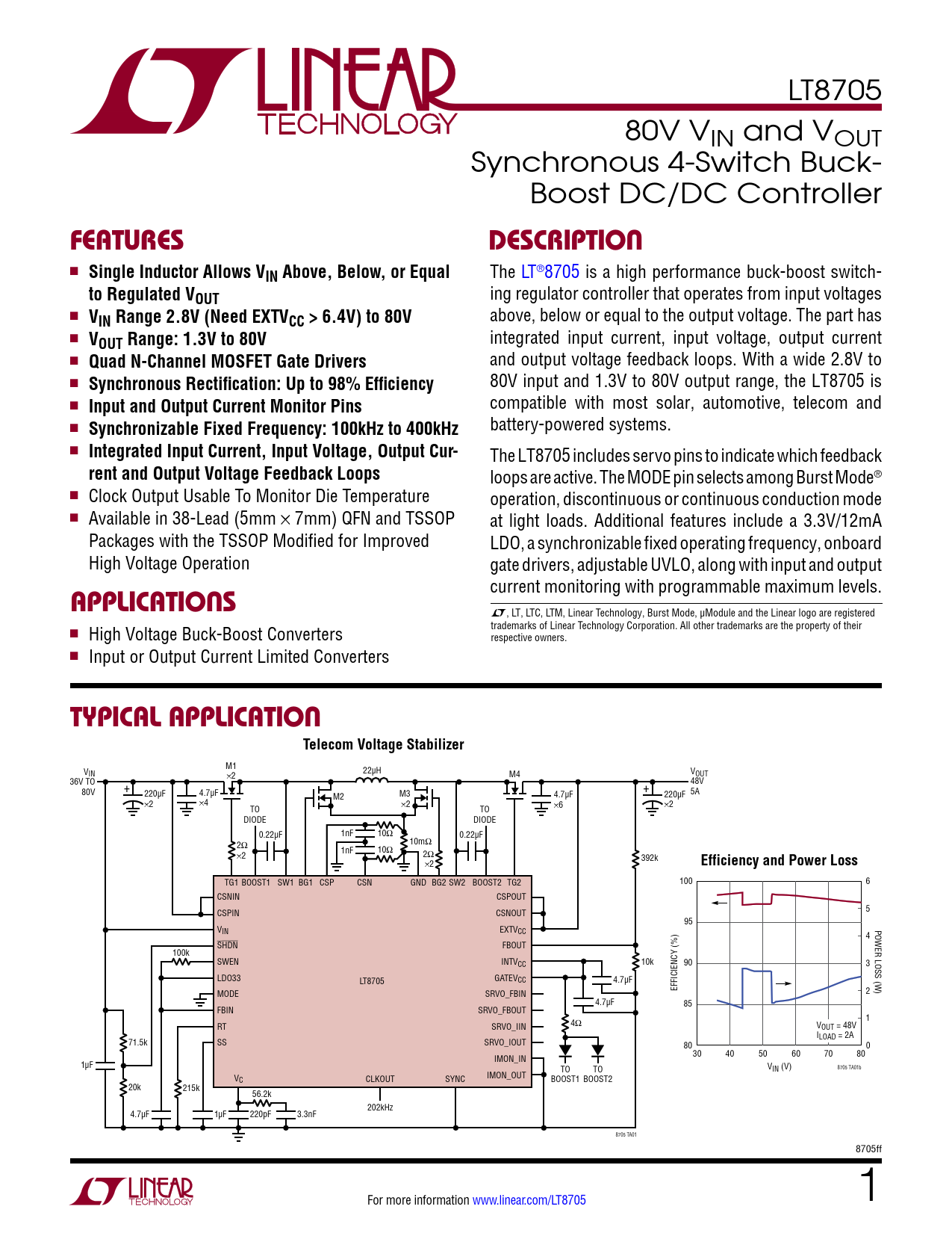 LT8705 80V VIN and VOUT Synchronous 4-Switch Buck- Boost DC/DC Controller FeaTuresDescripTion n Single Inductor Allows VIN Above, Below, or Equal The LT®8705 is a high performance buck-boost switch- to Regulated VOUT ing regulator controller that operates from input voltages n V above, below or equal to the output voltage. The part has IN Range 2.8V (Need EXTVCC > 6.4V) to 80V n V integrated input current, input voltage, output current OUT Range: 1.3V to 80V n Quad N-Channel MOSFET Gate Drivers and output voltage feedback loops. With a wide 2.8V to n Synchronous Rectification: Up to 98% Efficiency 80V input and 1.3V to 80V output range, the LT8705 is n Input and Output Current Monitor Pins compatible with most solar, automotive, telecom and n Synchronizable Fixed Frequency: 100kHz to 400kHz battery-powered systems. n Integrated Input Current, Input Voltage, Output Cur- The LT8705 includes servo pins to indicate which feedback rent and Output Voltage Feedback Loops loops are active. The MODE pin selects among Burst Mode® n Clock Output Usable To Monitor Die Temperature operation, discontinuous or continuous conduction mode n Available in 38-Lead (5mm × 7mm) QFN and TSSOP at light loads. Additional features include a 3.3V/12mA Packages with the TSSOP Modified for Improved LDO, a synchronizable fixed operating frequency, onboard High Voltage Operation gate drivers, adjustable UVLO, along with input and output current monitoring with programmable maximum levels. applicaTions L, LT, LTC, LTM, Linear Technology, Burst Mode, µModule and the Linear logo are registered trademarks of Linear Technology Corporation. All other trademarks are the property of their n High Voltage Buck-Boost Converters respective owners. n Input or Output Current Limited Converters Typical applicaTionTelecom Voltage Stabilizer M1 VIN × 22µH 2 M4 VOUT 36V TO 48V 80V + + 220µF 4.7µF 5A M2 M3 4.7µF 220µF ×2 ×4 ×2 TO TO ×6 ×2 DIODE DIODE 0.22µF 1nF 10Ω 0.22µF 2Ω 10mΩ 1nF × 10Ω 2 2Ω 392k ×2 Efficiency and Power Loss TG1 BOOST1 SW1 BG1 CSP CSN GND BG2 SW2 BOOST2 TG2 100 6 CSNIN CSPOUT CSPIN CSNOUT 5 95 VIN EXTVCC POWER LOSS (W) 4 SHDN FBOUT 100k SWEN INTVCC 10k 90 3 LDO33 GATEV LT8705 CC 4.7µF EFFICIENCY (%) MODE SRVO_FBIN 2 4.7µF 85 FBIN SRVO_FBOUT 1 RT SRVO_IIN 4Ω VOUT = 48V ILOAD = 2A 71.5k SS SRVO_IOUT 80 0 IMON_IN 30 40 50 60 70 80 1µF TO TO VIN (V) 8705 TA01b IMON_OUT VC CLKOUT SYNC BOOST1 BOOST2 20k 215k 56.2k 202kHz 4.7µF 1µF 220pF 3.3nF 8705 TA01 8705ff For more information www.linear.com/LT8705 1 Document Outline Features Description Applications Typical Application Absolute Maximum Ratings Pin Configuration Order Information Electrical Characteristics Typical Performance Characteristics Pin Functions Block Diagram Operation Applications Information Typical Applications Package Description Revision History Typical Application Related Parts