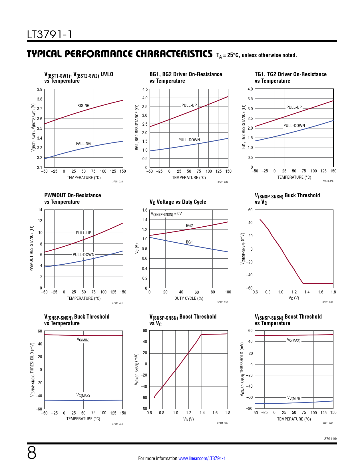14 1.6 60 V(SNSP-SNSN) = 0V 12 1.4 40 BG2 1.2 10 PULL-UP 20 1.0 (mV) 8 BG1 (V) 0.8 0 6 PULL-DOWN V C 0.6 –20 4 V (SNSP-SNSN) PWMOUT RESISTANCE (Ω) 0.4 2 –40 0.2 0 0 –60 –50 –25 0 25 50 75 100 125 150 0 20 40 60 80 100 0.6 0.8 1.0 1.2 1.4 1.6 1.8 TEMPERATURE (°C) DUTY CYCLE (%) VC (V) 37911 G31 37911 G32 37911 G33