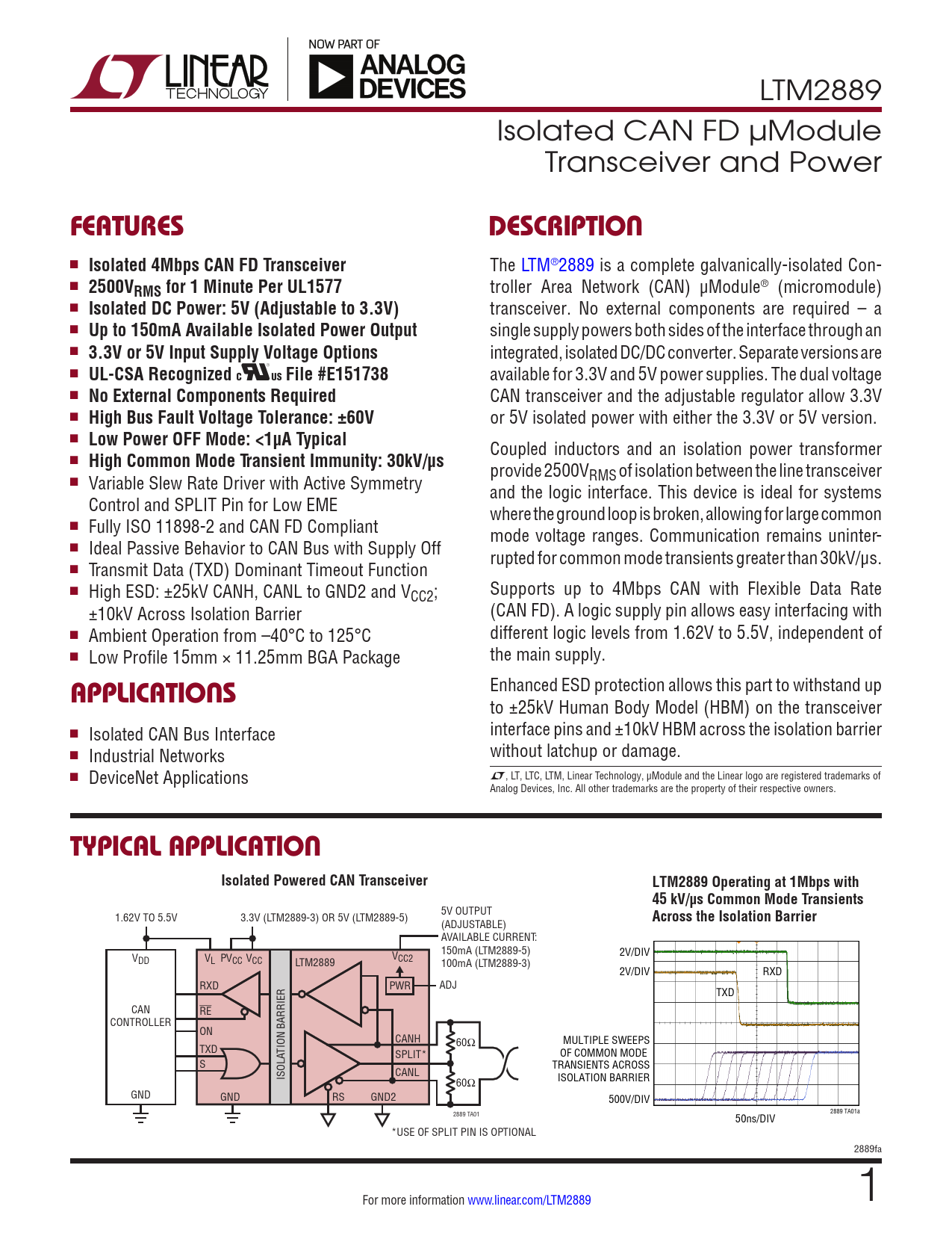 LTM2889 Isolated CAN FD µModule Transceiver and Power FEATURESDESCRIPTION n Isolated 4Mbps CAN FD Transceiver The LTM®2889 is a complete galvanically-isolated Con- n 2500VRMS for 1 Minute Per UL1577 troller Area Network (CAN) µModule® (micromodule) n Isolated DC Power: 5V (Adjustable to 3.3V) transceiver. No external components are required – a n Up to 150mA Available Isolated Power Output single supply powers both sides of the interface through an n 3.3V or 5V Input Supply Voltage Options integrated, isolated DC/DC converter. Separate versions are n UL-CSA RecognizedFile #E151738 available for 3.3V and 5V power supplies. The dual voltage n No External Components Required CAN transceiver and the adjustable regulator allow 3.3V n High Bus Fault Voltage Tolerance: ±60V or 5V isolated power with either the 3.3V or 5V version. n Low Power OFF Mode: <1µA Typical Coupled inductors and an isolation power transformer n High Common Mode Transient Immunity: 30kV/µs provide 2500VRMS of isolation between the line transceiver n Variable Slew Rate Driver with Active Symmetry and the logic interface. This device is ideal for systems Control and SPLIT Pin for Low EME where the ground loop is broken, allowing for large common n Fully ISO 11898-2 and CAN FD Compliant mode voltage ranges. Communication remains uninter- n Ideal Passive Behavior to CAN Bus with Supply Off rupted for common mode transients greater than 30kV/μs. n Transmit Data (TXD) Dominant Timeout Function n High ESD: ±25kV CANH, CANL to GND2 and V Supports up to 4Mbps CAN with Flexible Data Rate CC2; ±10kV Across Isolation Barrier (CAN FD). A logic supply pin allows easy interfacing with n Ambient Operation from –40°C to 125°C different logic levels from 1.62V to 5.5V, independent of n Low Profile 15mm × 11.25mm BGA Package the main supply. Enhanced ESD protection allows this part to withstand up APPLICATIONS to ±25kV Human Body Model (HBM) on the transceiver n interface pins and ±10kV HBM across the isolation barrier Isolated CAN Bus Interface n without latchup or damage. Industrial Networks n DeviceNet Applications L, LT, LTC, LTM, Linear Technology, µModule and the Linear logo are registered trademarks of Analog Devices, Inc. All other trademarks are the property of their respective owners. TYPICAL APPLICATIONIsolated Powered CAN TransceiverLTM2889 Operating at 1Mbps with45 kV/µs Common Mode Transients 1.62V TO 5.5V 3.3V (LTM2889-3) OR 5V (LTM2889-5) 5V OUTPUT Across the Isolation Barrier (ADJUSTABLE) AVAILABLE CURRENT: 150mA (LTM2889-5) V 2V/DIV DD VL PVCC VCC LTM2889 VCC2 100mA (LTM2889-3) 2V/DIV RXD RXD PWR ADJ TXD CAN RE CONTROLLER ON CANH 60Ω MULTIPLE SWEEPS TXD TION BARRIER SPLIT* OF COMMON MODE S TRANSIENTS ACROSS CANL ISOLA 60Ω ISOLATION BARRIER GND GND RS GND2 500V/DIV 2889 TA01 2889 TA01a 50ns/DIV *USE OF SPLIT PIN IS OPTIONAL 2889fa For more information www.linear.com/LTM2889 1
