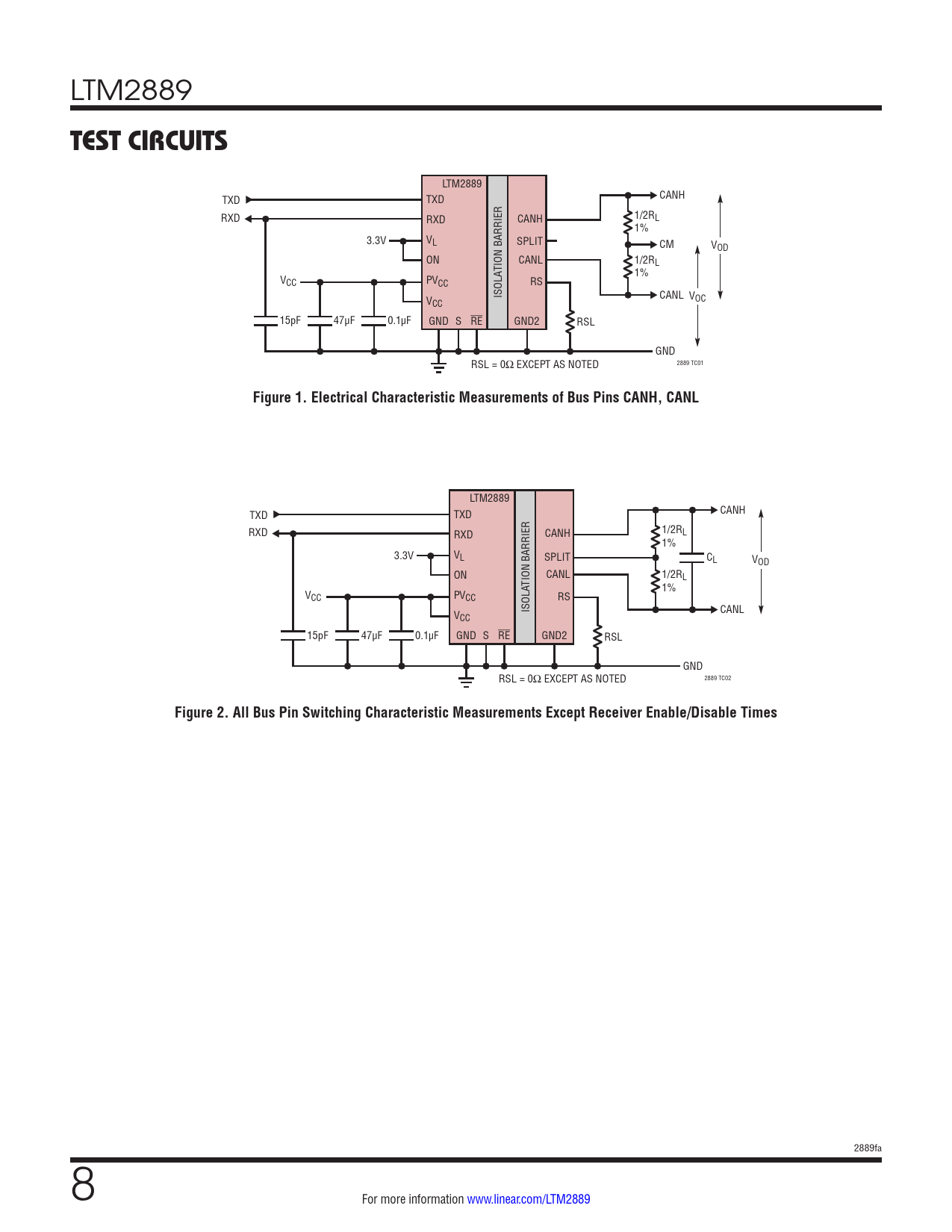 LTM2889 TXD TXD CANH RXD RXD CANH 1/2RL 1% 3.3V VL SPLIT CM VOD ON CANL 1/2RL TION BARRIER 1% VCC PVCC RS V ISOLA CANL V CC OC 15pF 47µF 0.1µF GND S RE GND2 RSL GND 2889 TC01 RSL = 0Ω EXCEPT AS NOTED