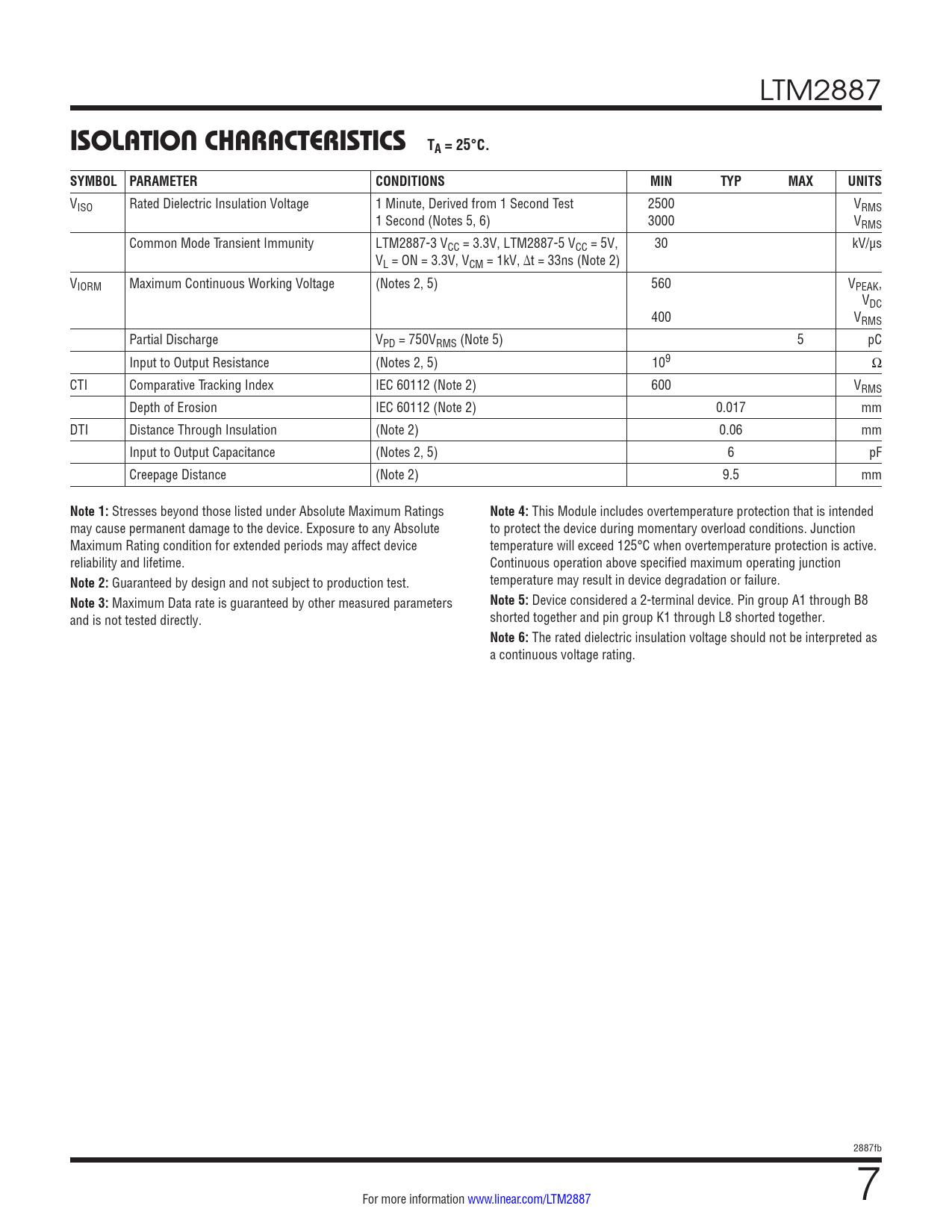 VISO Rated Dielectric Insulation Voltage 1 Minute, Derived from 1 Second Test 2500 VRMS 1 Second (Notes 5, 6) 3000 VRMS Common Mode Transient Immunity LTM2887-3 VCC = 3.3V, LTM2887-5 VCC = 5V, 30 kV/µs VL = ON = 3.3V, VCM = 1kV, Δt = 33ns (Note 2) VIORM Maximum Continuous Working Voltage (Notes 2, 5) 560 VPEAK, VDC 400 VRMS Partial Discharge VPD = 750VRMS (Note 5) 5 pC Input to Output Resistance (Notes 2, 5) 109 Ω CTI Comparative Tracking Index IEC 60112 (Note 2) 600 VRMS Depth of Erosion IEC 60112 (Note 2) 0.017 mm DTI Distance Through Insulation (Note 2) 0.06 mm Input to Output Capacitance (Notes 2, 5) 6 pF Creepage Distance (Note 2) 9.5 mm
