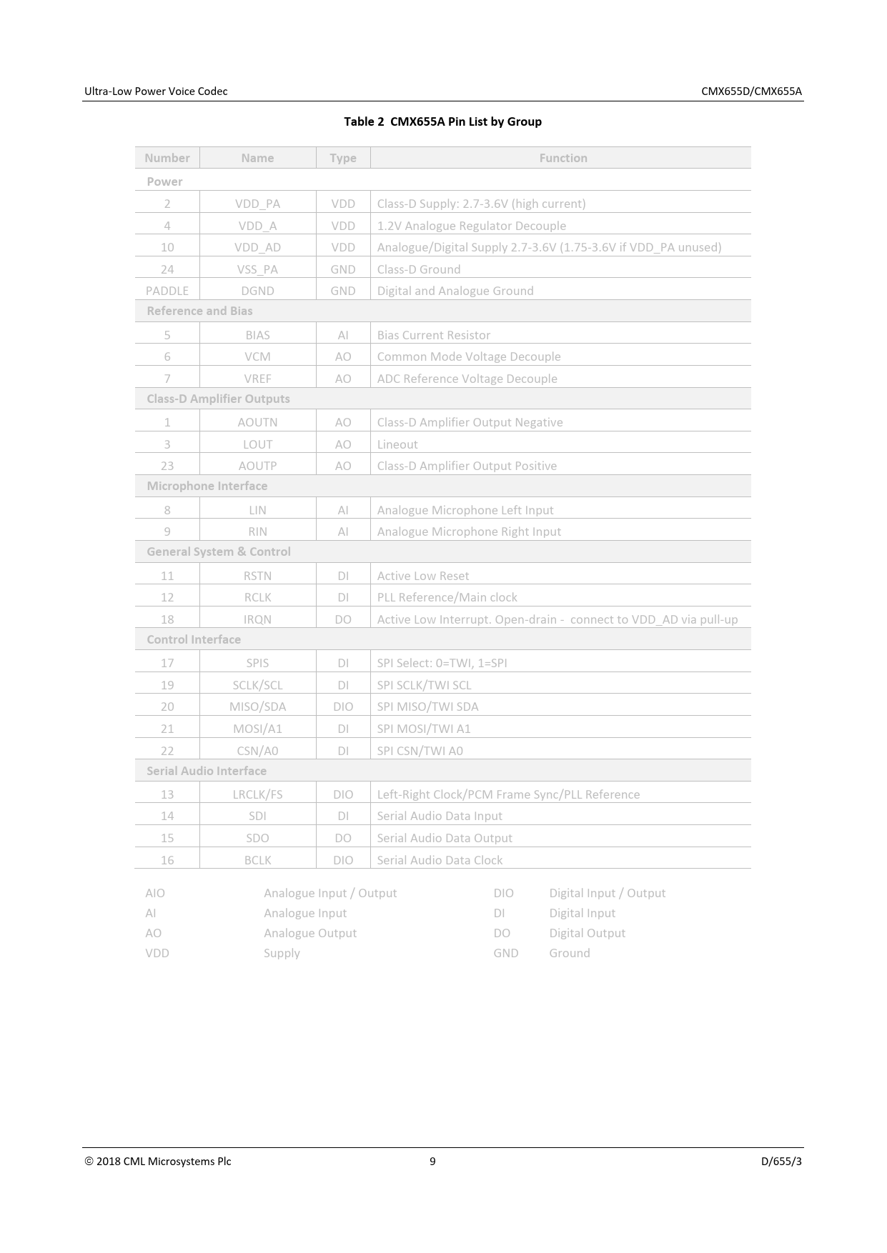 Table 2 CMX655A Pin List by Group. Number. Name. Type. Function. Power. Reference and Bias. Class-D Amplifier Outputs