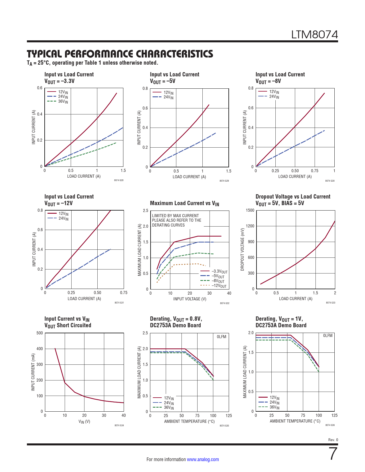 0.8 2.5 1500 12VIN LIMITED BY MAX CURRENT 24VIN PLEASE ALSO REFER TO THE DERATING CURVES 2.0 1200 0.6 1.5 900 TAGE (mV) 0.4 1.0 600 INPUT CURRENT (A) 0.2 –3.3V DROPOUT VOL OUT 0.5 MAXIMUM LOAD CURRENT (A) 300 –5VOUT –8VOUT –12V 0 OUT 0 0 0 0.25 0.50 0.75 0 10 20 30 40 0 0.5 1 1.5 2 LOAD CURRENT (A) INPUT VOLTAGE (V) LOAD CURRENT (A) 8074 G31 8074 G32 8074 G33