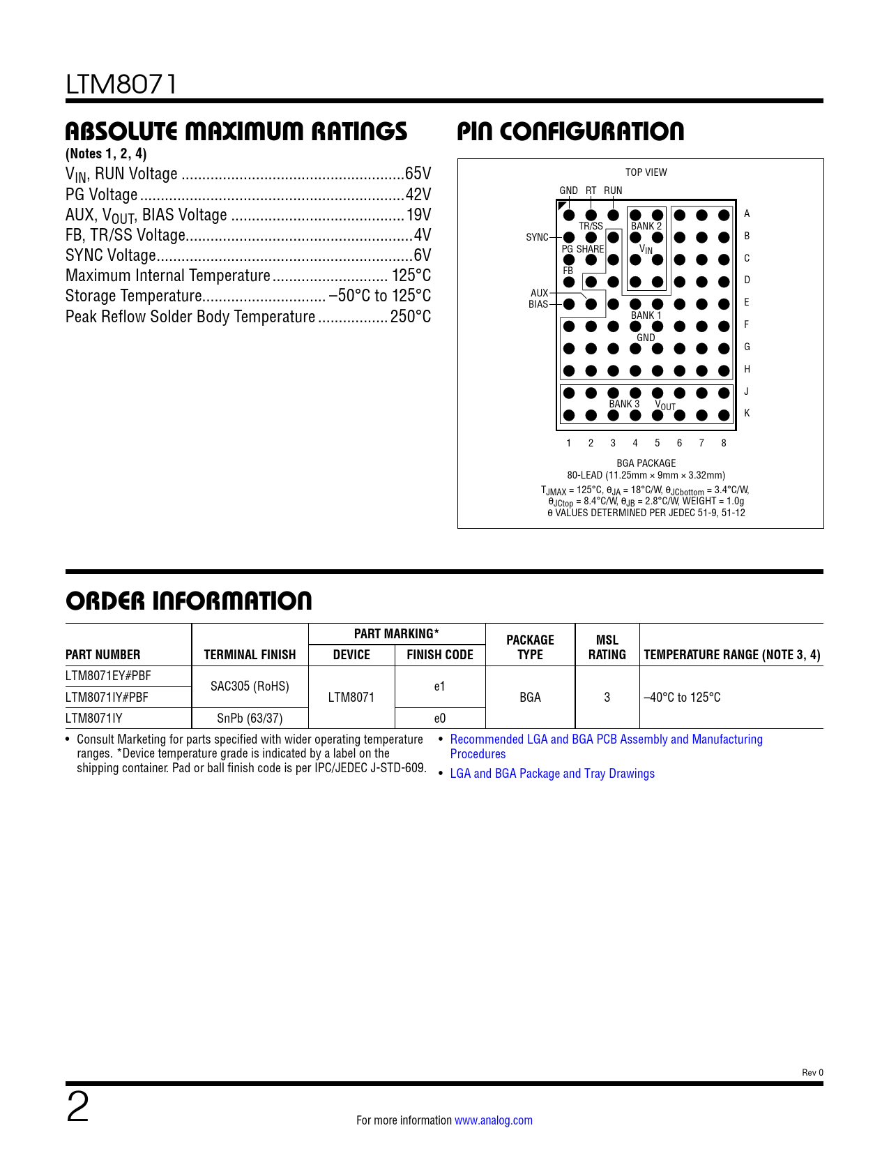 LTM8071 ABSOLUTE MAXIMUM RATINGSPIN CONFIGURATION(Notes 1, 2, 4) TOP VIEW VIN, RUN Voltage ..65V GND RT RUN PG Voltage ..42V A AUX, VOUT, BIAS Voltage ..19V TR/SS BANK 2 FB, TR/SS Voltage...4V SYNC B PG SHARE VIN SYNC Voltage ..6V C FB Maximum Internal Temperature .. 125°C D AUX Storage Temperature.. –50°C to 125°C BIAS E BANK 1 Peak Reflow Solder Body Temperature ...250°C F GND G H J BANK 3 VOUT K 1 2 3 4 5 6 7 8 BGA PACKAGE 80-LEAD (11.25mm × 9mm × 3.32mm) TJMAX = 125°C, θJA = 18°C/W, θJCbottom = 3.4°C/W, θJCtop = 8.4°C/W, θJB = 2.8°C/W, WEIGHT = 1.0g θ VALUES DETERMINED PER JEDEC 51-9, 51-12 ORDER INFORMATIONPART MARKING*PACKAGEMSLPART NUMBERTERMINAL FINISHDEVICEFINISH CODETYPERATINGTEMPERATURE RANGE (NOTE 3, 4) LTM8071EY#PBF SAC305 (RoHS) e1 LTM8071IY#PBF LTM8071 BGA 3 –40°C to 125°C LTM8071IY SnPb (63/37) e0 • Consult Marketing for parts specified with wider operating temperature • Recommended LGA and BGA PCB Assembly and Manufacturing ranges. *Device temperature grade is indicated by a label on the Procedures shipping container. Pad or ball finish code is per IPC/JEDEC J-STD-609. • LGA and BGA Package and Tray Drawings Rev 0 2 For more information www.analog.com Document Outline Features Applications Typical Application Description Absolute Maximum Ratings Order Information Pin Configuration Electrical Characteristics Typical Performance Characteristics Pin Functions Block Diagram Operation Applications Information Typical Applications Package Description Package Photos Package Description Typical Application Related Parts