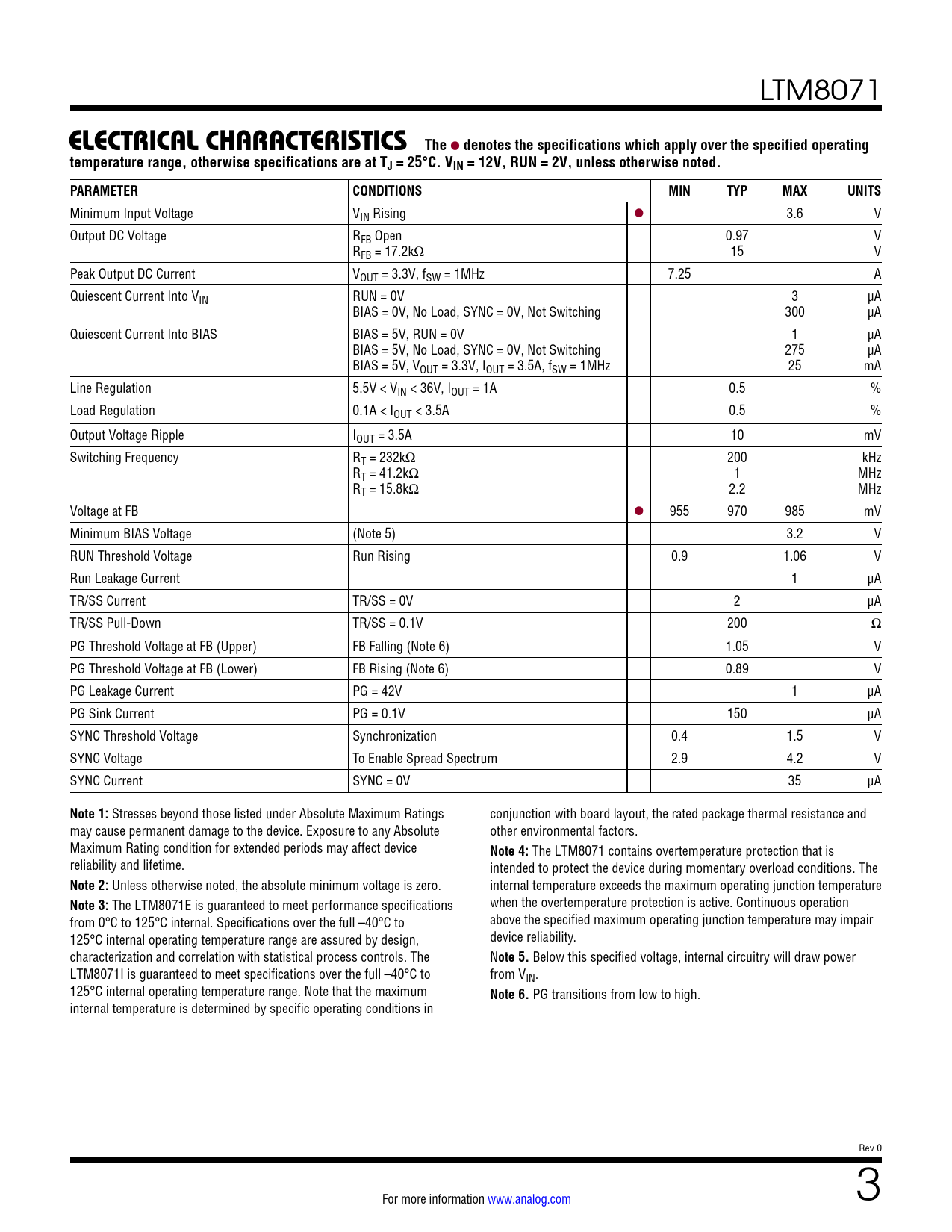LTM8071 ELECTRICAL CHARACTERISTICSThe l denotes the specifications which apply over the specified operatingtemperature range, otherwise specifications are at TJ = 25°C. VIN = 12V, RUN = 2V, unless otherwise noted. PARAMETERCONDITIONSMINTYPMAXUNITS Minimum Input Voltage VIN Rising l 3.6 V Output DC Voltage RFB Open 0.97 V RFB = 17.2kΩ 15 V Peak Output DC Current VOUT = 3.3V, fSW = 1MHz 7.25 A Quiescent Current Into VIN RUN = 0V 3 µA BIAS = 0V, No Load, SYNC = 0V, Not Switching 300 µA Quiescent Current Into BIAS BIAS = 5V, RUN = 0V 1 µA BIAS = 5V, No Load, SYNC = 0V, Not Switching 275 µA BIAS = 5V, VOUT = 3.3V, IOUT = 3.5A, fSW = 1MHz 25 mA Line Regulation 5.5V < VIN < 36V, IOUT = 1A 0.5 % Load Regulation 0.1A < IOUT < 3.5A 0.5 % Output Voltage Ripple IOUT = 3.5A 10 mV Switching Frequency RT = 232kΩ 200 kHz RT = 41.2kΩ 1 MHz RT = 15.8kΩ 2.2 MHz Voltage at FB l 955 970 985 mV Minimum BIAS Voltage (Note 5) 3.2 V RUN Threshold Voltage Run Rising 0.9 1.06 V Run Leakage Current 1 µA TR/SS Current TR/SS = 0V 2 µA TR/SS Pull-Down TR/SS = 0.1V 200 Ω PG Threshold Voltage at FB (Upper) FB Falling (Note 6) 1.05 V PG Threshold Voltage at FB (Lower) FB Rising (Note 6) 0.89 V PG Leakage Current PG = 42V 1 µA PG Sink Current PG = 0.1V 150 µA SYNC Threshold Voltage Synchronization 0.4 1.5 V SYNC Voltage To Enable Spread Spectrum 2.9 4.2 V SYNC Current SYNC = 0V 35 µA Note 1: Stresses beyond those listed under Absolute Maximum Ratings conjunction with board layout, the rated package thermal resistance and may cause permanent damage to the device. Exposure to any Absolute other environmental factors. Maximum Rating condition for extended periods may affect device Note 4: The LTM8071 contains overtemperature protection that is reliability and lifetime. intended to protect the device during momentary overload conditions. The Note 2: Unless otherwise noted, the absolute minimum voltage is zero. internal temperature exceeds the maximum operating junction temperature Note 3: The LTM8071E is guaranteed to meet performance specifications when the overtemperature protection is active. Continuous operation from 0°C to 125°C internal. Specifications over the full –40°C to above the specified maximum operating junction temperature may impair 125°C internal operating temperature range are assured by design, device reliability. characterization and correlation with statistical process controls. The N ote 5. Below this specified voltage, internal circuitry will draw power LTM8071I is guaranteed to meet specifications over the full –40°C to from VIN. 125°C internal operating temperature range. Note that the maximum Note 6. PG transitions from low to high. internal temperature is determined by specific operating conditions in Rev 0 For more information www.analog.com 3 Document Outline Features Applications Typical Application Description Absolute Maximum Ratings Order Information Pin Configuration Electrical Characteristics Typical Performance Characteristics Pin Functions Block Diagram Operation Applications Information Typical Applications Package Description Package Photos Package Description Typical Application Related Parts