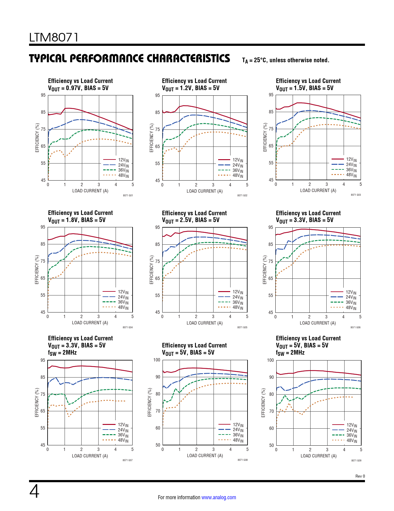 95 95 95 85 85 85 75 75 75 65 65 65 EFFICIENCY (%) EFFICIENCY (%) EFFICIENCY (%) 12VIN 12V 12V 55 IN IN 24V 55 55 IN 24VIN 24VIN 36VIN 36VIN 36VIN 48VIN 48VIN 48VIN 45 45 45 0 1 2 3 4 5 0 1 2 3 4 5 0 1 2 3 4 5 LOAD CURRENT (A) LOAD CURRENT (A) LOAD CURRENT (A) 8071 G01 8071 G02 8071 G03