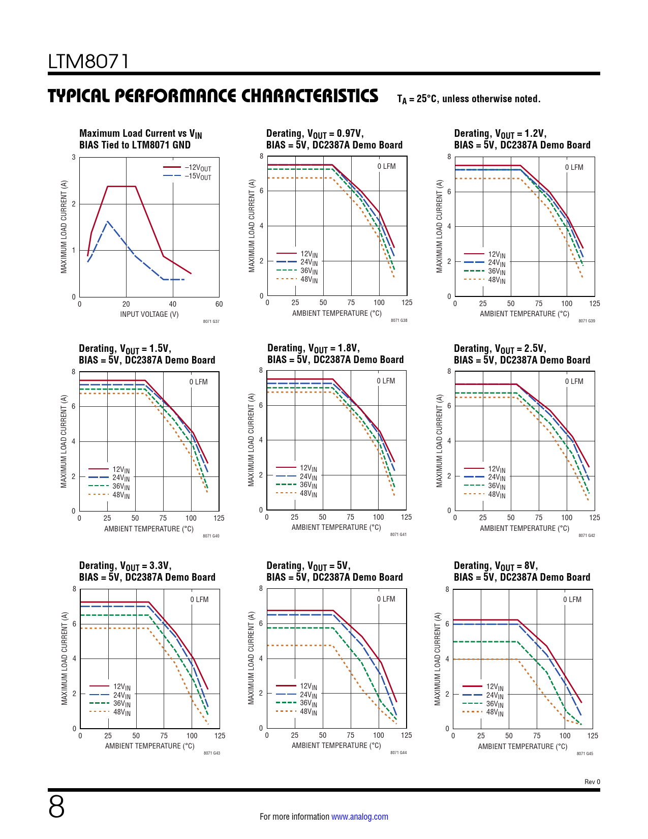 Derating, VOUT = 3.3V, Derating, VOUT = 5V, Derating, VOUT = 8V, BIAS = 5V, DC2387A Demo Board BIAS = 5V, DC2387A Demo Board BIAS = 5V, DC2387A Demo Board