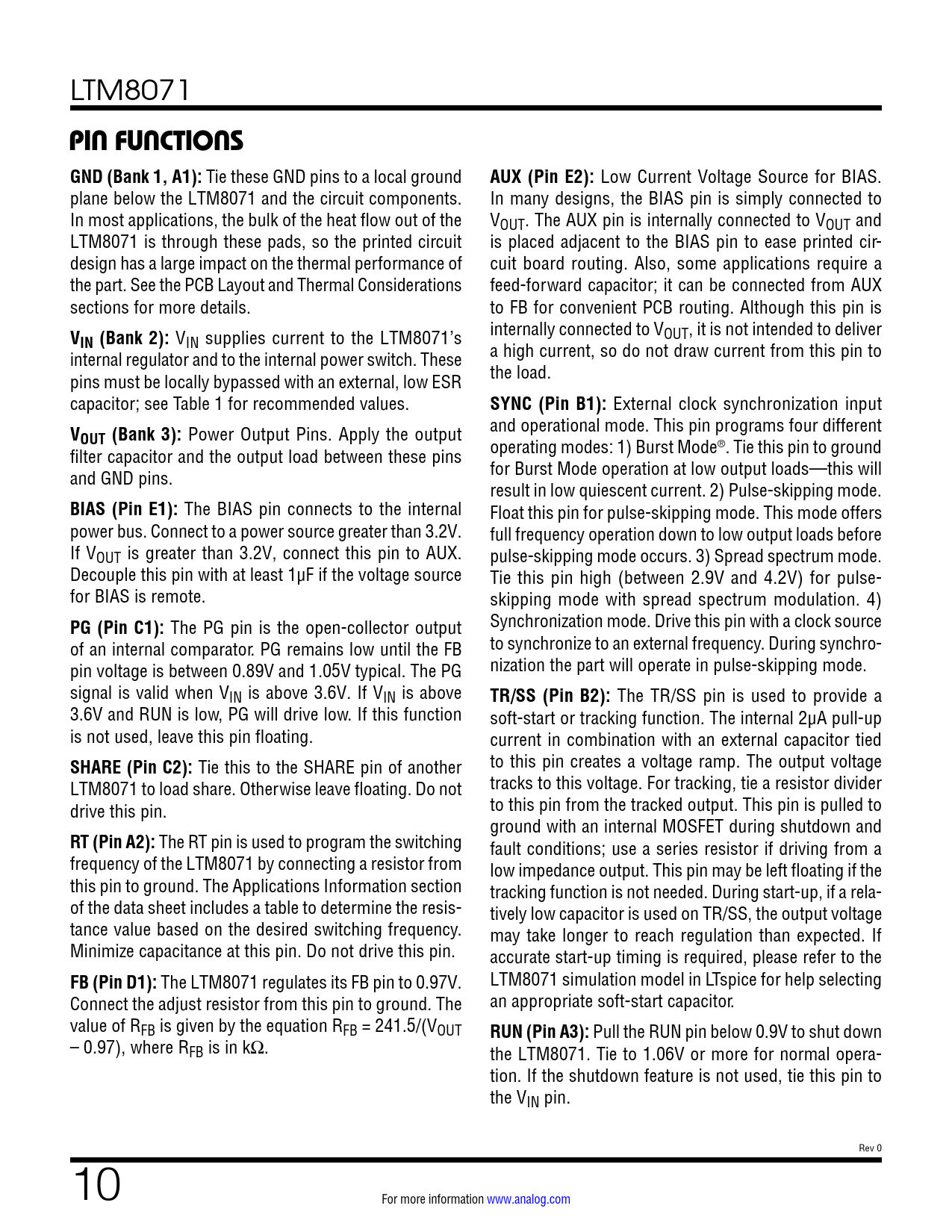 link to page 17 link to page 18 link to page 12 link to page 12 LTM8071 PIN FUNCTIONSGND (Bank 1, A1): Tie these GND pins to a local ground AUX (Pin E2): Low Current Voltage Source for BIAS. plane below the LTM8071 and the circuit components. In many designs, the BIAS pin is simply connected to In most applications, the bulk of the heat flow out of the VOUT. The AUX pin is internally connected to VOUT and LTM8071 is through these pads, so the printed circuit is placed adjacent to the BIAS pin to ease printed cir- design has a large impact on the thermal performance of cuit board routing. Also, some applications require a the part. See the PCB Layout and Thermal Considerations feed-forward capacitor; it can be connected from AUX sections for more details. to FB for convenient PCB routing. Although this pin is V internally connected to VOUT, it is not intended to deliver IN (Bank 2): VIN supplies current to the LTM8071’s internal regulator and to the internal power switch. These a high current, so do not draw current from this pin to pins must be locally bypassed with an external, low ESR the load. capacitor; see Table 1 for recommended values. SYNC (Pin B1): External clock synchronization input V and operational mode. This pin programs four different OUT (Bank 3): Power Output Pins. Apply the output filter capacitor and the output load between these pins operating modes: 1) Burst Mode®. Tie this pin to ground and GND pins. for Burst Mode operation at low output loads—this will result in low quiescent current. 2) Pulse-skipping mode. BIAS (Pin E1): The BIAS pin connects to the internal Float this pin for pulse-skipping mode. This mode offers power bus. Connect to a power source greater than 3.2V. full frequency operation down to low output loads before If VOUT is greater than 3.2V, connect this pin to AUX. pulse-skipping mode occurs. 3) Spread spectrum mode. Decouple this pin with at least 1µF if the voltage source Tie this pin high (between 2.9V and 4.2V) for pulse- for BIAS is remote. skipping mode with spread spectrum modulation. 4) PG (Pin C1): The PG pin is the open-collector output Synchronization mode. Drive this pin with a clock source of an internal comparator. PG remains low until the FB to synchronize to an external frequency. During synchro- pin voltage is between 0.89V and 1.05V typical. The PG nization the part will operate in pulse-skipping mode. signal is valid when VIN is above 3.6V. If VIN is above TR/SS (Pin B2): The TR/SS pin is used to provide a 3.6V and RUN is low, PG will drive low. If this function soft-start or tracking function. The internal 2μA pull-up is not used, leave this pin floating. current in combination with an external capacitor tied SHARE (Pin C2): Tie this to the SHARE pin of another to this pin creates a voltage ramp. The output voltage LTM8071 to load share. Otherwise leave floating. Do not tracks to this voltage. For tracking, tie a resistor divider drive this pin. to this pin from the tracked output. This pin is pulled to ground with an internal MOSFET during shutdown and RT (Pin A2): The RT pin is used to program the switching fault conditions; use a series resistor if driving from a frequency of the LTM8071 by connecting a resistor from low impedance output. This pin may be left floating if the this pin to ground. The Applications Information section tracking function is not needed. During start-up, if a rela- of the data sheet includes a table to determine the resis- tively low capacitor is used on TR/SS, the output voltage tance value based on the desired switching frequency. may take longer to reach regulation than expected. If Minimize capacitance at this pin. Do not drive this pin. accurate start-up timing is required, please refer to the FB (Pin D1): The LTM8071 regulates its FB pin to 0.97V. LTM8071 simulation model in LTspice for help selecting Connect the adjust resistor from this pin to ground. The an appropriate soft-start capacitor. value of RFB is given by the equation RFB = 241.5/(VOUT RUN (Pin A3): Pull the RUN pin below 0.9V to shut down – 0.97), where RFB is in kΩ. the LTM8071. Tie to 1.06V or more for normal opera- tion. If the shutdown feature is not used, tie this pin to the VIN pin. Rev 0 10 For more information www.analog.com Document Outline Features Applications Typical Application Description Absolute Maximum Ratings Order Information Pin Configuration Electrical Characteristics Typical Performance Characteristics Pin Functions Block Diagram Operation Applications Information Typical Applications Package Description Package Photos Package Description Typical Application Related Parts