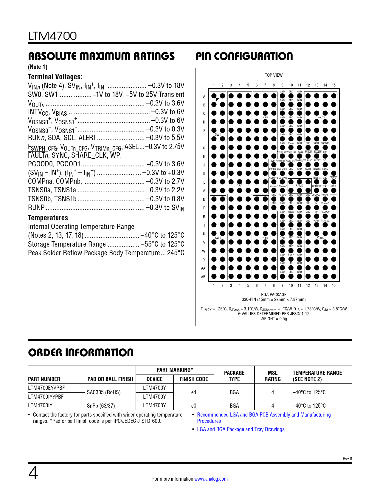 LTM4700 ABSOLUTE MAXIMUM RATINGSPIN CONFIGURATION(Note 1) Terminal Voltages: TOP VIEW V + − INn (Note 4), SVIN, IIN , IIN .. –0.3V to 18V 1 2 3 4 5 6 7 8 9 10 11 12 13 14 15 SW0, SW1 .. −1V to 18V, −5V to 25V Transient GND GND GND A V GND GND GND OUTn .. –0.3V to 3.6V B INTV GND GND GND CC, VBIAS .. –0.3V to 6V C V + + VIN1 GND GND GND VOUT1 OSNS0 , VOSNS1 ... –0.3V to 6V D V − − GND GND GND OSNS0 , VOSNS1 .. –0.3V to 0.3V E RUNn, SDA, SCL, ALERT ... –0.3V to 5.5V SW1 GND GND GND F F GND VDD25 GND GND GND TSNS1b SWPH_CFG, VOUTn_CFG, VTRIMn_CFG, ASEL ...–0.3V to 2.75V G FAULTn, SYNC, SHARE_CLK, WP, VTRIM1_CFGVOUT1_CFG ASEL FAULT1 FAULT0 SDA H PGOOD0, PGOOD1 .. −0.3V to 3.6V WP VTRIM0_CFGVOUT0_CFGFSWPH_CFGRUN0 ALERT SCL J (SV + – SHARE_CLK VDD33 GND GND RUN1 TSNS0a SYNC IN – IN+), (IIN – IIN ) ... –0.3V to +0.3V K COMPna, COMPnb, .. –0.3V to 2.7V COMP1a COMP1b TSNS1a GND GND L TSNS0a, TSNS1a .. –0.3V to 2.2V GND V – + OSNS1 VOSNS1 SGND COMP0b GND GND M TSNS0b, TSNS1b .. –0.3V to 0.8V GND PGOOD1 GND GND GND COMP0a V – OSNS0 N + RUNP .. –0.3V to SV GND GND GND GND GND IIN– VOSNS0 IN P GND INTVCC GND GND IIN+ PGOOD0 Temperatures R GND GND VBIAS GND GND TSNS0b Internal Operating Temperature Range T GND GND GND (Notes 2, 13, 17, 18) ... –40°C to 125°C U SW0 VIN0 SVIN GND GND VOUT0 Storage Temperature Range .. –55°C to 125°C V GND GND GND Peak Solder Reflow Package Body Temperature ... 245°C W GND RUNP GND Y GND GND GND AA GND GND GND AB 1 2 3 4 5 6 7 8 9 10 11 12 13 14 15 BGA PACKAGE 330-PIN (15mm × 22mm × 7.87mm) TJMAX = 125°C, θJCtop = 3.1°C/W, θJCbottom = 1°C/W, θJB = 1.75°C/W, θJA = 8.5°C/W θ VALUES DETERMINED PER JESD51-12 WEIGHT = 9.5g ORDER INFORMATIONPART MARKING*PACKAGEMSLTEMPERATURE RANGEPART NUMBERPAD OR BALL FINISHDEVICEFINISH CODETYPERATING(SEE NOTE 2) LTM4700EY#PBF LTM4700Y SAC305 (RoHS) e4 BGA 4 –40°C to 125°C LTM4700IY#PBF LTM4700Y LTM4700IY SnPb (63/37) LTM4700Y e0 BGA 4 –40°C to 125°C • Contact the factory for parts specified with wider operating temperature • Recommended LGA and BGA PCB Assembly and Manufacturing ranges. *Pad or ball finish code is per IPC/JEDEC J-STD-609. Procedures • LGA and BGA Package and Tray Drawings Rev 0 4 For more information www.analog.com Document Outline Features Applications Typical Application Description Table of Contents Absolute Maximum Ratings Order Information Pin Configuration Electrical Characteristics Typical Performance Characteristics Pin Functions Simplified Block Diagram Decoupling Requirements Functional Diagram Test Circuits Operation PMBus Command Summary Applications Information Applications Information-Derating Curves Typical Applications PMBus Command Details Package Description Typical Applications Package Photograph Related Parts Features Applications Typical Application Description Table of Contents Absolute Maximum Ratings Order Information Pin Configuration Electrical Characteristics Typical Performance Characteristics Pin Functions Simplified Block Diagram Decoupling Requirements Functional Diagram Test Circuits Operation Power Module Introduction Power Module Overview, Major Features EEPROM with ECC Power-Up and Initialization Soft-Start Time-Based Sequencing Voltage-Based Sequencing Shutdown Light-Load Current Operation Switching Frequency and Phase PWM Loop Compensation Output Voltage Sensing INTVCC and Build-in 5V Bias Converter Output Current Sensing and Sub Milliohm DCR Current Sensing Input Current Sensing PolyPhase Load Sharing External/Internal Temperature Sense RCONFIG (Resistor Configuration) Pins Fault Detection and Handling Status Registers and ALERT Masking Mapping Faults to FAULT Pins Power Good Pins CRC Protection Serial Interface Communication Protection Device Addressing Responses to VOUT and IIN/IOUT Faults Output Overvoltage Fault Response Output Undervoltage Response Peak Output Overcurrent Fault Response Responses to Timing Faults Responses to VIN OV Faults Responses to OT/UT Faults Internal Overtemperature Fault Response External Overtemperature and Undertemperature Fault Response Responses to Input Overcurrent and Output Undercurrent Faults Responses to External Faults Fault Logging Bus Timeout Protection Similarity Between PMBus, SMBus and I2C 2-Wire Interface PMBus Serial Digital Interface Figures 7 to 24 PMBus Protocols PMBus Command Summary PMBus Commands Applications Information VIN to VOUT Step-Down Ratios Input Capacitors Output Capacitors Light Load Current Operation Switching Frequency and Phase Output Current Limit Programming Minimum On-Time Considerations Variable Delay Time, Soft-Start and Output Voltage Ramping Digital Servo Mode Soft Off (Sequenced Off) Undervoltage Lockout Fault Detection and Handling Open-Drain Pins Phase-Locked Loop and Frequency Synchronization Input Current Sense Amplifier Programmable Loop Compensation Checking Transient Response PolyPhase Configuration Connecting The USB to I2C/SMBus/PMBus Controller to the LTM4700 In System LTpowerPlay: An Interactive GUI for Digital Power PMBus Communication and Command Processing Thermal Considerations and Output Current Derating Applications Information-Derating Curves EMI Performance Safety Considerations Layout Checklist/Example Typical Applications PMBus Command Details Addressing and Write Protect General Configuration Commands On/Off/Margin PWM Configuration Voltage Input Voltage and Limits Output Voltage and Limits Output Current and Limits Input Current and Limits Temperature External Temperature Calibration Timing Timing—On Sequence/Ramp Timing—Off Sequence/Ramp Precondition for Restart Fault Response Fault Responses All Faults Fault Responses Input Voltage Fault Responses Output Voltage Fault Responses Output Current Fault Responses IC Temperature Fault Responses External Temperature Fault Sharing Fault Sharing Propagation Fault Sharing Response Scratchpad Identification Fault Warning and Status Telemetry NVM Memory Commands Sto