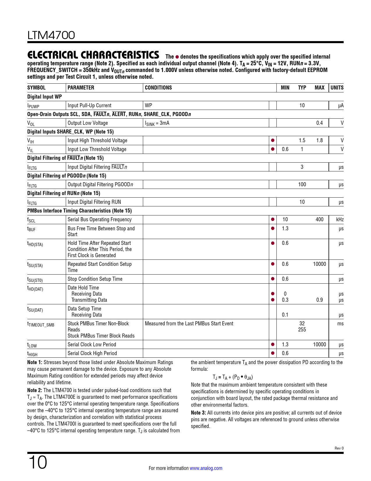 All currents into device pins are positive; all currents out of device by design, characterization and correlation with statistical process pins are negative. All voltages are referenced to ground unless otherwise controls. The LTM4700I is guaranteed to meet specifications over the full specified. –40°C to 125°C internal operating temperature range. TJ is calculated from Rev 0 10 For more information www.analog.com Document Outline Features Applications Typical Application Description Table of Contents Absolute Maximum Ratings Order Information Pin Configuration Electrical Characteristics Typical Performance Characteristics Pin Functions Simplified Block Diagram Decoupling Requirements Functional Diagram Test Circuits Operation PMBus Command Summary Applications Information Applications Information-Derating Curves Typical Applications PMBus Command Details Package Description Typical Applications Package Photograph Related Parts Features Applications Typical Application Description Table of Contents Absolute Maximum Ratings Order Information Pin Configuration Electrical Characteristics Typical Performance Characteristics Pin Functions Simplified Block Diagram Decoupling Requirements Functional Diagram Test Circuits Operation Power Module Introduction Power Module Overview, Major Features EEPROM with ECC Power-Up and Initialization Soft-Start Time-Based Sequencing Voltage-Based Sequencing Shutdown Light-Load Current Operation Switching Frequency and Phase PWM Loop Compensation Output Voltage Sensing INTVCC and Build-in 5V Bias Converter Output Current Sensing and Sub Milliohm DCR Current Sensing Input Current Sensing PolyPhase Load Sharing External/Internal Temperature Sense RCONFIG (Resistor Configuration) Pins Fault Detection and Handling Status Registers and ALERT Masking Mapping Faults to FAULT Pins Power Good Pins CRC Protection Serial Interface Communication Protection Device Addressing Responses to VOUT and IIN/IOUT Faults Output Overvoltage Fault Response Output Undervoltage Response Peak Output Overcurrent Fault Response Responses to Timing Faults Responses to VIN OV Faults Responses to OT/UT Faults Internal Overtemperature Fault Response External Overtemperature and Undertemperature Fault Response Responses to Input Overcurrent and Output Undercurrent Faults Responses to External Faults Fault Logging Bus Timeout Protection Similarity Between PMBus, SMBus and I2C 2-Wire Interface PMBus Serial Digital Interface Figures 7 to 24 PMBus Protocols PMBus Command Summary PMBus Commands Applications Information VIN to VOUT Step-Down Ratios Input Capacitors Output Capacitors Light Load Current Operation Switching Frequency and Phase Output Current Limit Programming Minimum On-Time Considerations Variable Delay Time, Soft-Start and Output Voltage Ramping Digital Servo Mode Soft Off (Sequenced Off) Undervoltage Lockout Fault Detection and Handling Open-Drain Pins Phase-Locked Loop and Frequency Synchronization Input Current Sense Amplifier Programmable Loop Compensation Checking Transient Response PolyPhase Configuration Connecting The USB to I2C/SMBus/PMBus Controller to the LTM4700 In System LTpowerPlay: An Interactive GUI for Digital Power PMBus Communication and Command Processing Thermal Considerations and Output Current Derating Applications Information-Derating Curves EMI Performance Safety Considerations Layout Checklist/Example Typical Applications PMBus Command Details Addressing and Write Protect General Configuration Commands On/Off/Margin PWM Configuration Voltage Input Voltage and Limits Output Voltage and Limits Output Current and Limits Input Current and Limits Temperature External Temperature Calibration Timing Timing—On Sequence/Ramp Timing—Off Sequence/Ramp Precondition for Restart Fault Response Fault Responses All Faults Fault Responses Input Voltage Fault Responses Output Voltage Fault Responses Output Current Fault Responses IC Temperature Fault Responses External Temperature Fault Sharing Fault Sharing Propagation Fault Sharing Response Scratchpad Identification Fault Warning and Status Telemetry NVM Memory Commands Store/Restore Fault Logging Block Memory Write/Read Package Description Typical Applications Package Photograph Related Parts