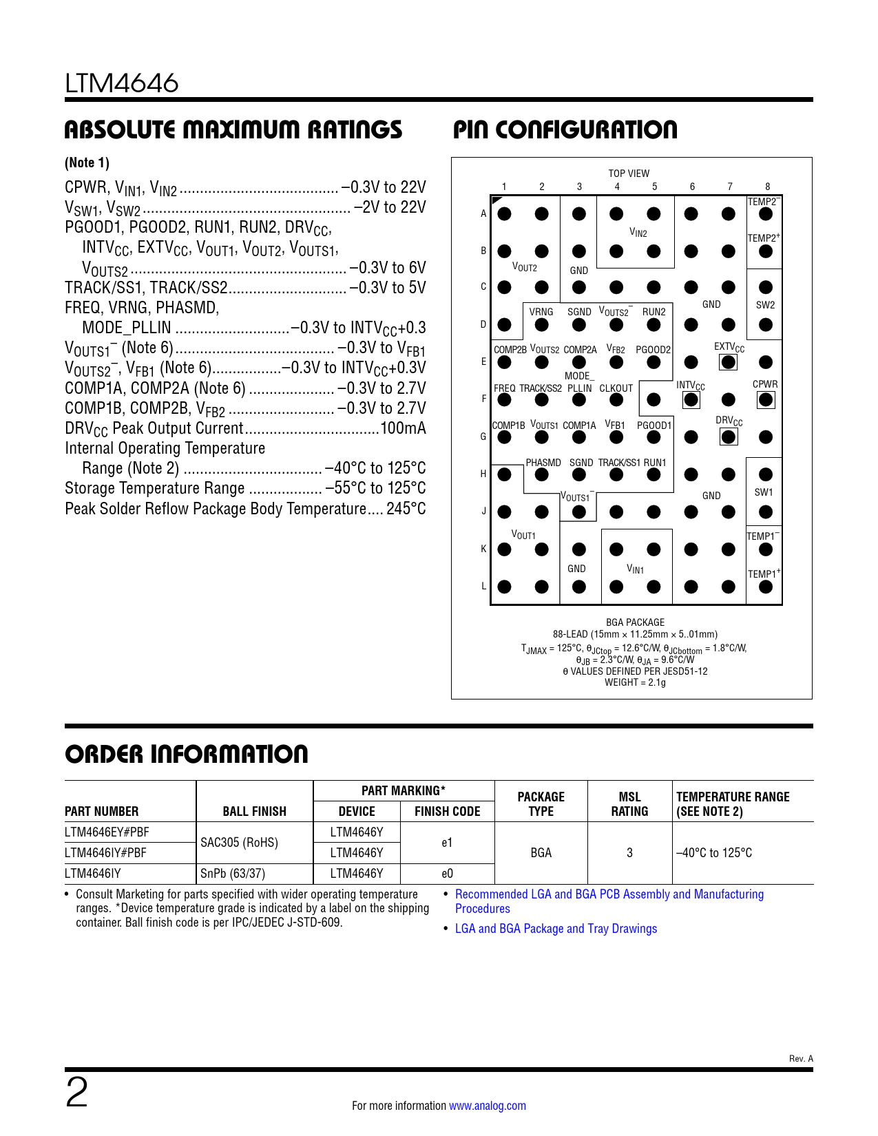 LTM4646EY#PBF LTM4646Y SAC305 (RoHS) e1 LTM4646IY#PBF LTM4646Y BGA 3 –40°C to 125°C LTM4646IY SnPb (63/37) LTM4646Y e0 • Consult Marketing for parts specified with wider operating temperature • Recommended LGA and BGA PCB Assembly and Manufacturing ranges. *Device temperature grade is indicated by a label on the shipping Procedures container. Ball finish code is per IPC/JEDEC J-STD-609. • LGA and BGA Package and Tray Drawings Rev. A 2 For more information www.analog.com Document Outline Operation Applications Information Package Description Package Photo Related Parts Features Applications Typical Application Description Absolute Maximum Ratings Order Information Pin Configuration Electrical Characteristics Typical Performance Characteristics Pin Functions Block Diagram Decoupling Requirements Operation Applications Information Package Description Revision History Package Photo Design Resources Related Parts