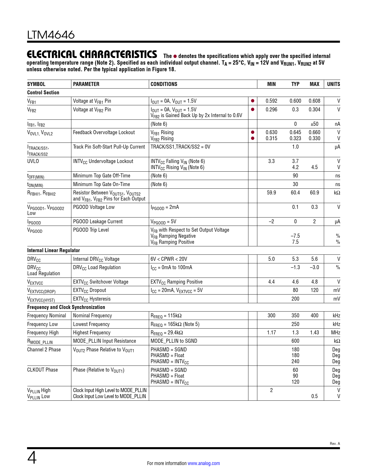 VFB1 Voltage at VFB1 Pin IOUT = 0A, VOUT = 1.5V l 0.592 0.600 0.608 V VFB2 Voltage at VFB2 Pin IOUT = 0A, VOUT = 1.5V l 0.296 0.3 0.304 V VFB2 is Gained Back Up by 2x Internal to 0.6V IFB1, IFB2 (Note 6) 0 ±50 nA VOVL1, VOVL2 Feedback Overvoltage Lockout VFB1 Rising l 0.630 0.645 0.660 V VFB2 Rising l 0.315 0.323 0.330 V ITRACK/SS1, Track Pin Soft-Start Pull-Up Current TRACK/SS1,TRACK/SS2 = 0V 1.0 µA ITRACK/SS2 UVLO INTVCC Undervoltage Lockout INTVCC Falling VIN (Note 6) 3.3 3.7 V INTVCC Rising VIN (Note 6) 4.2 4.5 V tOFF(MIN) Minimum Top Gate Off-Time (Note 6) 90 ns tON(MIN) Minimum Top Gate On-Time (Note 6) 30 ns RFBHI1, RFBHI2 Resistor Between VOUTS1, VOUTS2 59.9 60.4 60.9 kΩ and VFB1, VFB2 Pins for Each Output VPGOOD1, VPGOOD2 PGOOD Voltage Low IPGOOD = 2mA 0.1 0.3 V Low IPGOOD PGOOD Leakage Current VPGOOD = 5V –2 0 2 µA VPGOOD PGOOD Trip Level VFB with Respect to Set Output Voltage VFB Ramping Negative –7.5 % VFB Ramping Positive 7.5 %