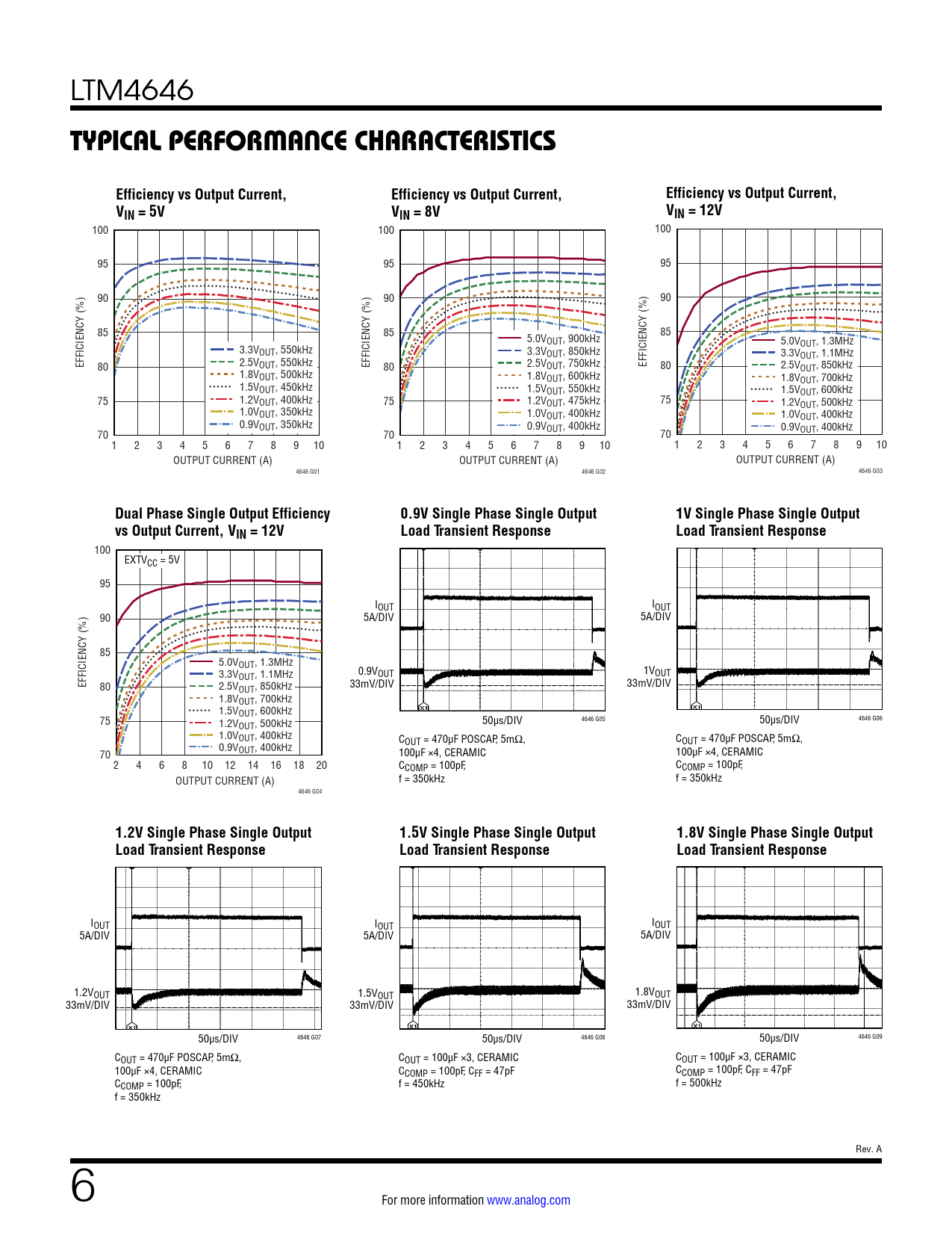 IOUT I I IOUT OUT OUT 5A/DIV 5A/DIV 5A/DIV 5A/DIV 1.2VOUT 1.5V 1.5V 1.8V OUT OUT OUT 33mV/DIV 33mV 33mV /DIV /DIV 33mV/DIV 50µs/DIV 4646 G07 50µs/DIV 4646 G08 50µs/DIV 4646 G08 50µs/DIV 4646 G09 COUT = 470µF POSCAP, 5mΩ, COUT = 100µF ×3, CERAMIC C OUT = 100µF ×3, CERAMIC OUT = 100µF ×3, CERAMIC 100µF ×4, CERAMIC CCOMP = 100pF, CFF = 47pF C COMP = 100pF, CFF = 47pF COMP = 100pF, CFF = 47pF CCOMP = 100pF, f = 450kHz f = 450kHz f = 500kHz f = 350kHz Rev. A 6 For more information www.analog.com Document Outline Operation Applications Information Package Description Package Photo Related Parts Features Applications Typical Application Description Absolute Maximum Ratings Order Information Pin Configuration Electrical Characteristics Typical Performance Characteristics Pin Functions Block Diagram Decoupling Requirements Operation Applications Information Package Description Revision History Package Photo Design Resources Related Parts