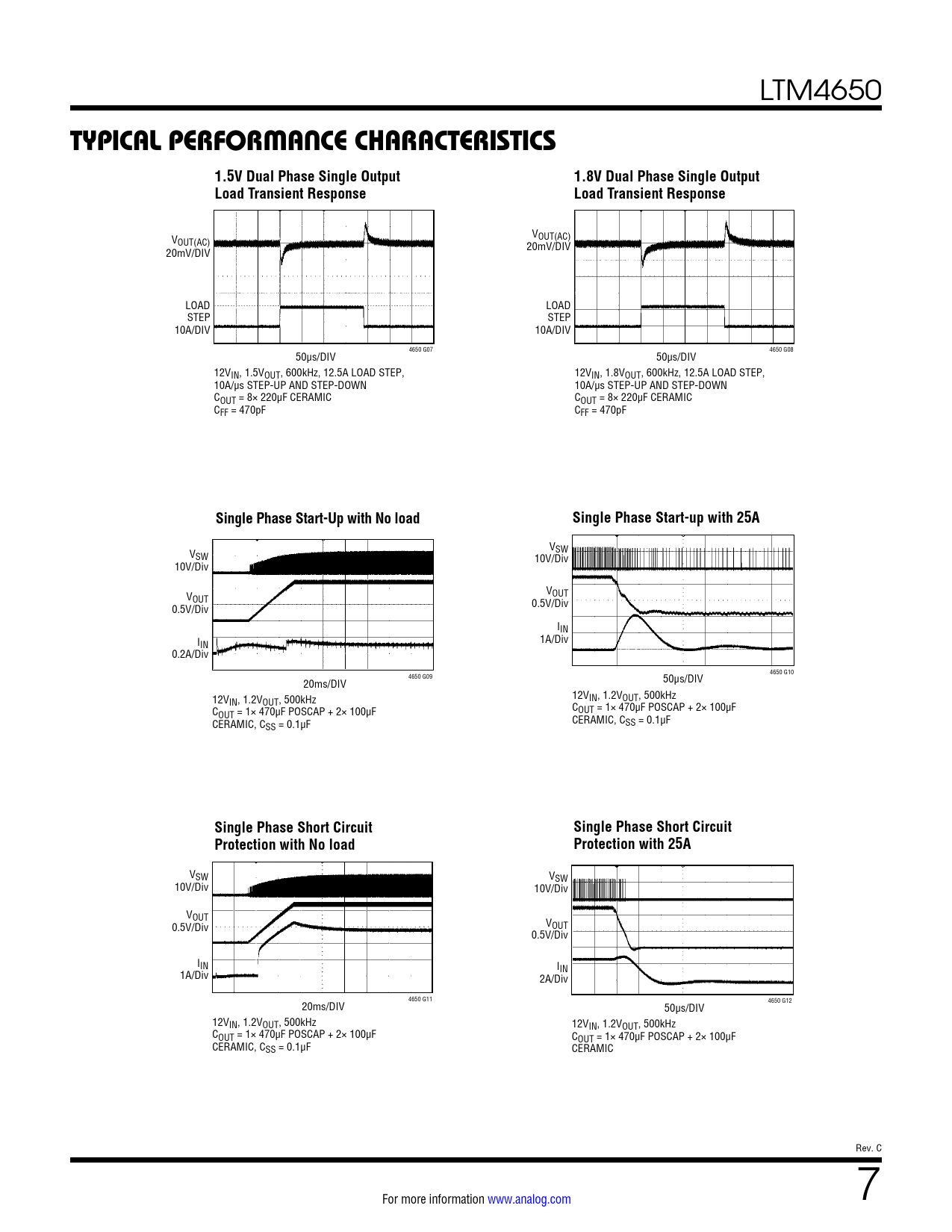 V V SW SW 10V/Div 10V/Div V VOUT OUT 0.5V/Div 0.5V/Div IIN I 1A/Div IN 0.2A/Div 4650 G10 4650 G09 20ms/DIV 50μs/DIV 12V 12V IN, 1.2VOUT, 500kHz IN, 1.2VOUT, 500kHz C C OUT = 1× 470µF POSCAP + 2× 100µF OUT = 1× 470µF POSCAP + 2× 100µF CERAMIC, C CERAMIC, C SS = 0.1µF SS = 0.1µF