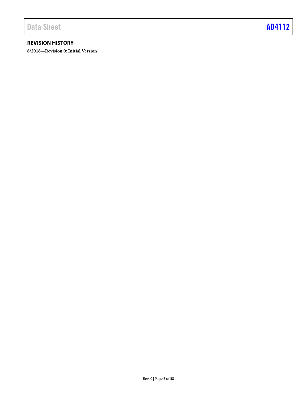 | Pages / Page | 58 / 3 — Data Sheet. AD4112. REVISION HISTORY. 8/2018—Revision 0: Initial Version |