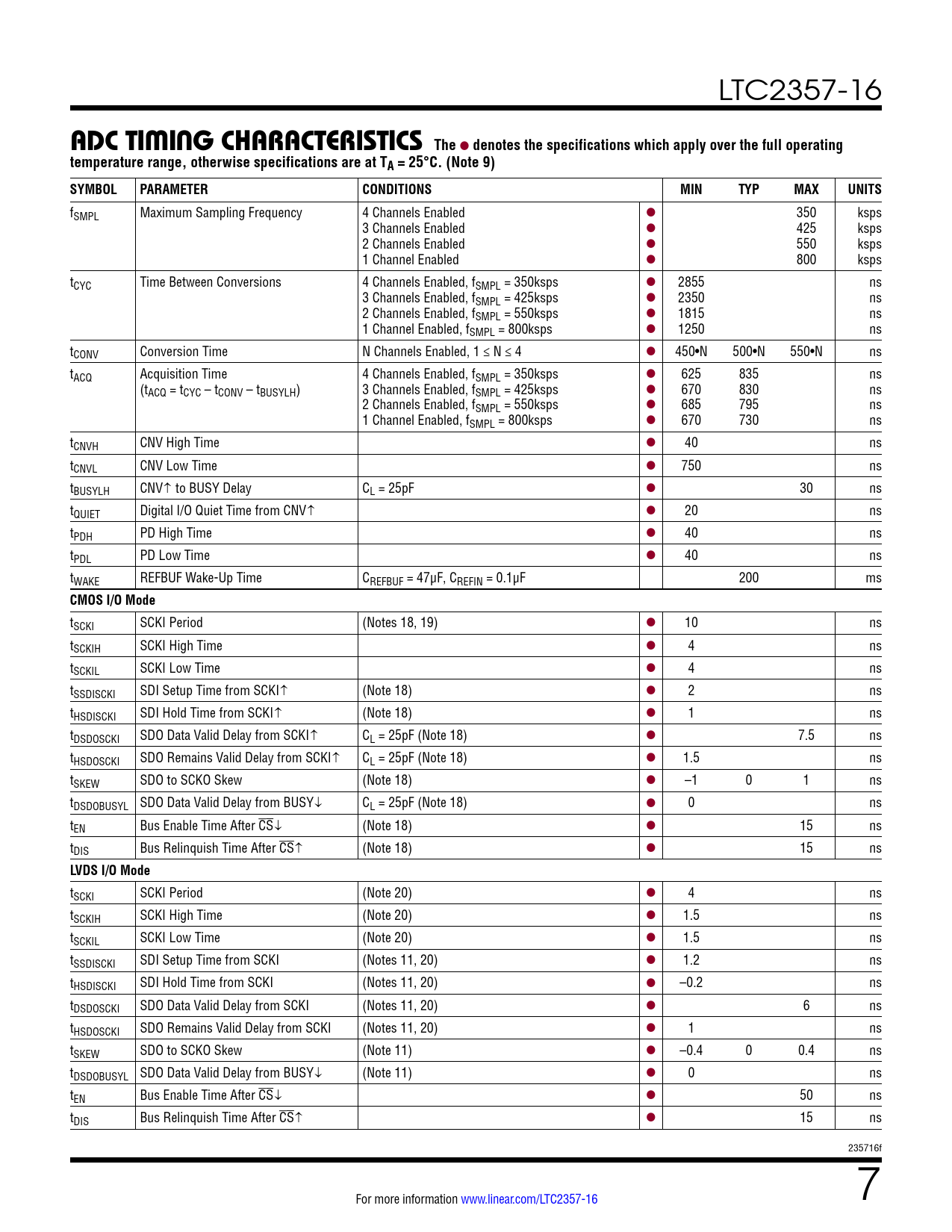 tSCKI SCKI Period (Note 20) l 4 ns tSCKIH SCKI High Time (Note 20) l 1.5 ns tSCKIL SCKI Low Time (Note 20) l 1.5 ns tSSDISCKI SDI Setup Time from SCKI (Notes 11, 20) l 1.2 ns tHSDISCKI SDI Hold Time from SCKI (Notes 11, 20) l –0.2 ns tDSDOSCKI SDO Data Valid Delay from SCKI (Notes 11, 20) l 6 ns tHSDOSCKI SDO Remains Valid Delay from SCKI (Notes 11, 20) l 1 ns tSKEW SDO to SCKO Skew (Note 11) l –0.4 0 0.4 ns tDSDOBUSYL SDO Data Valid Delay from BUSY (Note 11) l 0 ns tEN Bus Enable Time After CS l 50 ns tDIS Bus Relinquish Time After CS l 15 ns 235716f For more information www.linear.com/LTC2357-16 7 Document Outline Features Applications Typical Application Description Absolute Maximum Ratings Order Information Pin Configuration Electrical Characteristics Converter Characteristics Dynamic Accuracy Internal Reference Characteristics Reference Buffer Characteristics Digital Inputs and Digital Outputs Power Requirements ADC Timing Characteristics Typical Performance Characteristics Pin Functions Configuration Tables Functional Block Diagram Timing Diagram Applications Information Board Layout Package Description Typical Application Related Parts