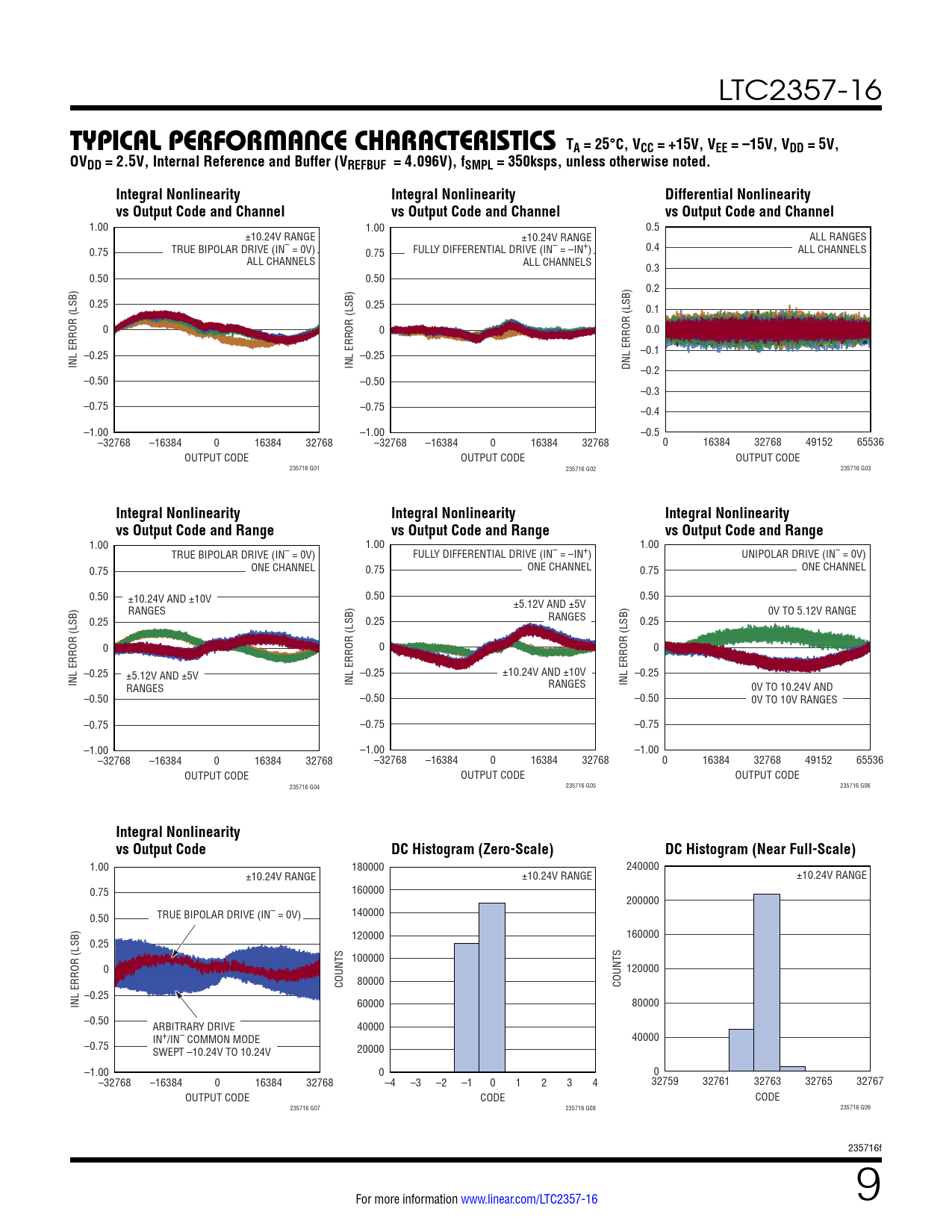 1.00 1.00 1.00 TRUE BIPOLAR DRIVE (IN– = 0V) FULLY DIFFERENTIAL DRIVE (IN– = –IN+) UNIPOLAR DRIVE (IN– = 0V) ONE CHANNEL 0.75 ONE CHANNEL 0.75 ONE CHANNEL 0.75 0.50 ±10.24V AND ±10V 0.50 0.50 ±5.12V AND ±5V RANGES 0V TO 5.12V RANGE 0.25 RANGES 0.25 0.25 0 0 0 –0.25 ±5.12V AND ±5V –0.25 ±10.24V AND ±10V –0.25 INL ERROR (LSB) RANGES INL ERROR (LSB) RANGES INL ERROR (LSB) 0V TO 10.24V AND –0.50 –0.50 –0.50 0V TO 10V RANGES –0.75 –0.75 –0.75 –1.00 –1.00 –1.00 –32768 –16384 0 16384 32768 –32768 –16384 0 16384 32768 0 16384 32768 49152 65536 OUTPUT CODE OUTPUT CODE OUTPUT CODE 235716 G04 235716 G05 235716 G06